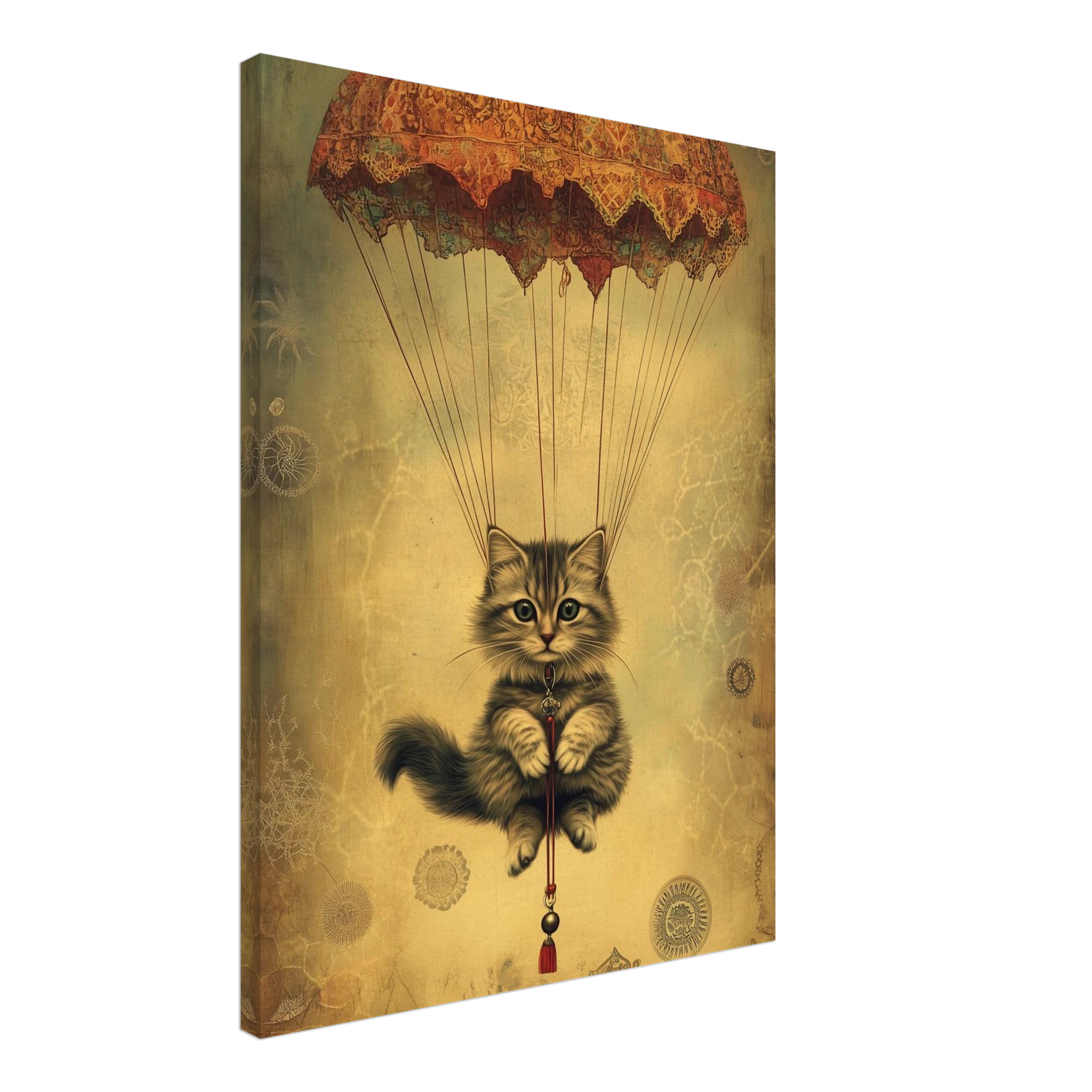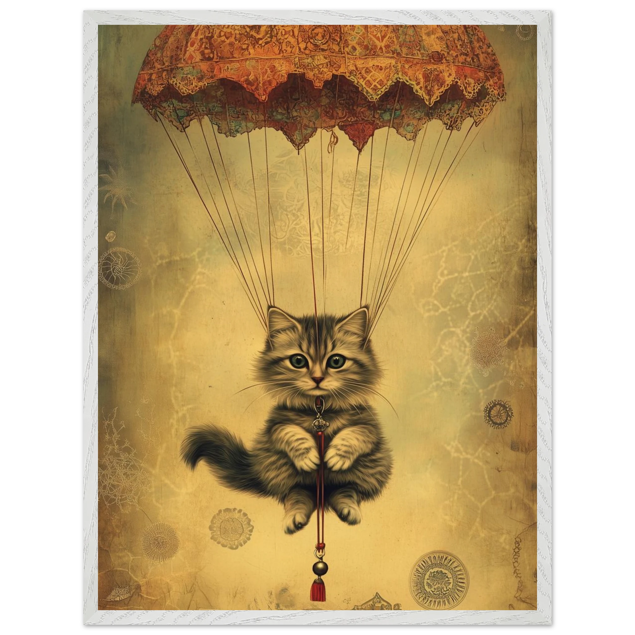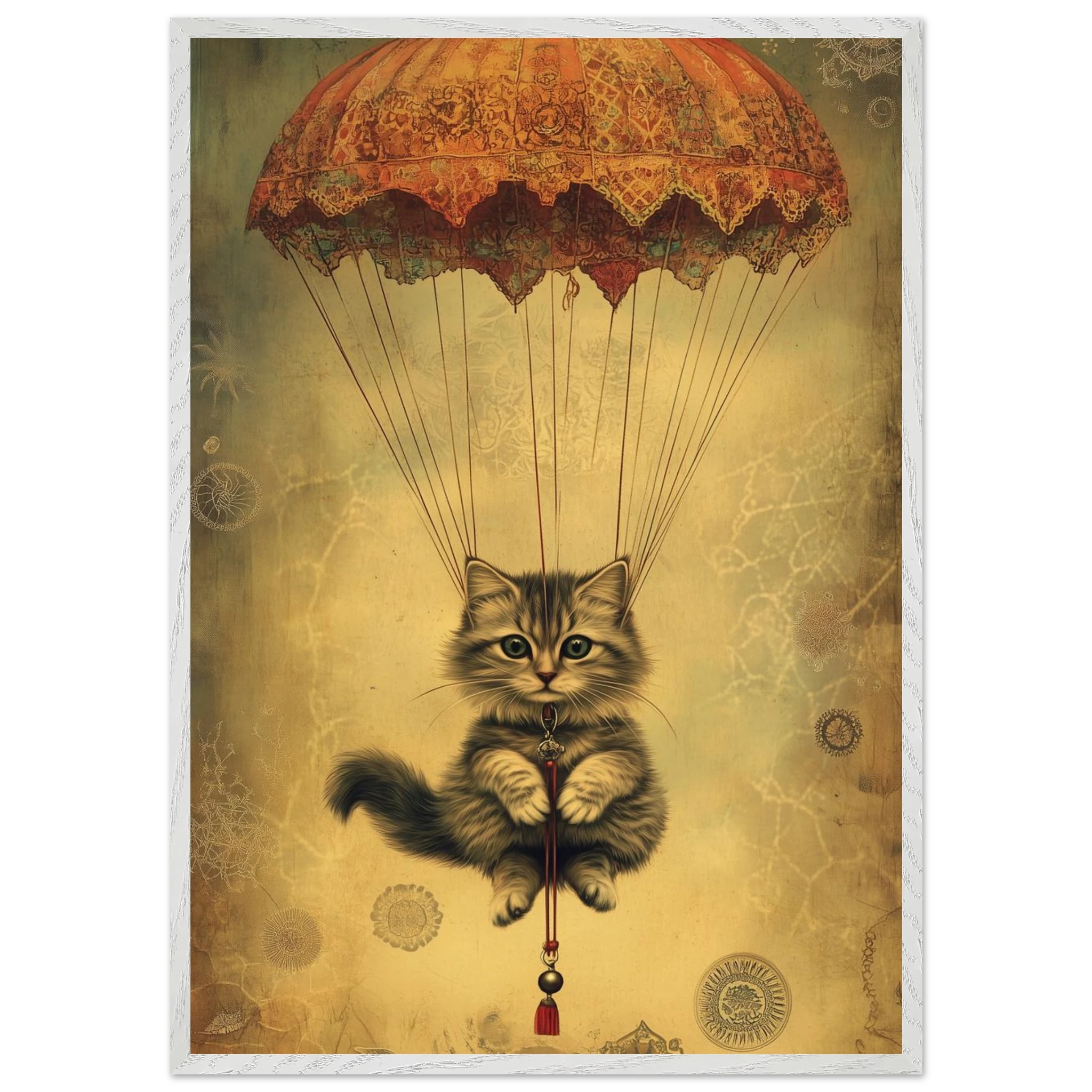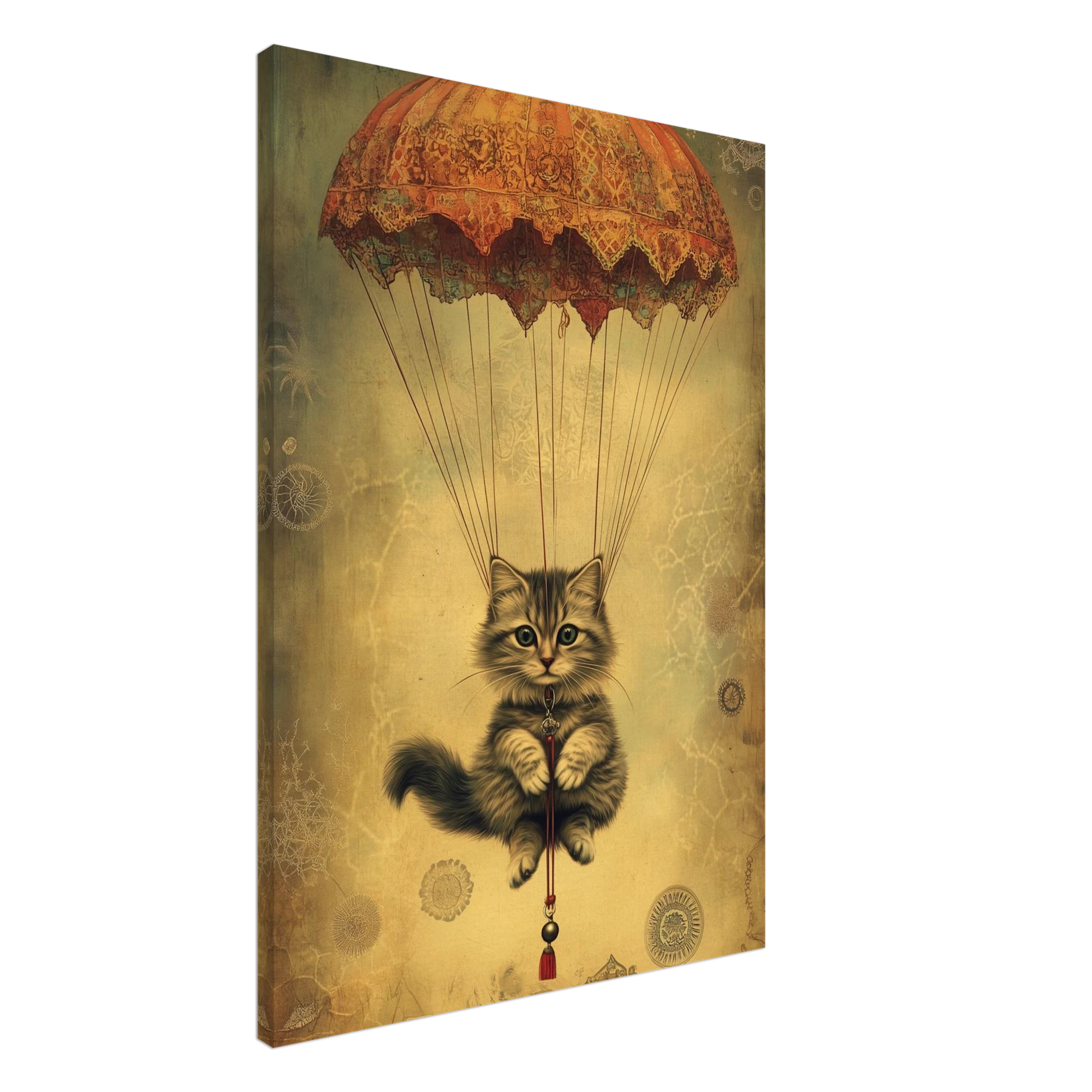 With lace parachute overhead and a poised grip on the tassel below, this airborne kitty is clearly on a noble mission—somewhere between Narnia and a Parisian flea market.