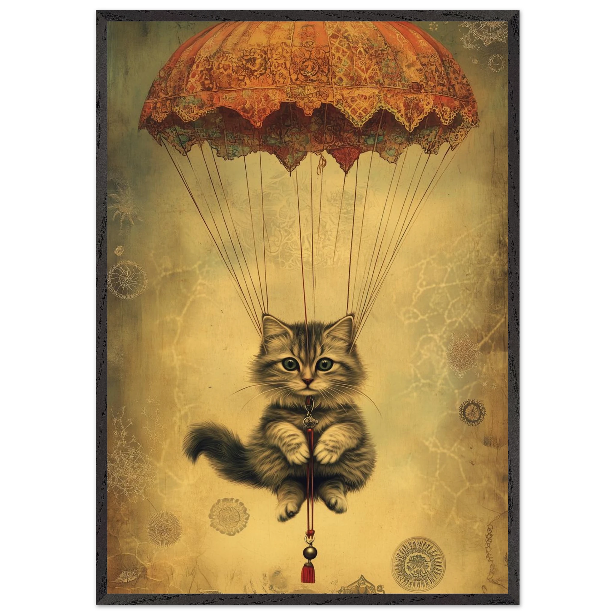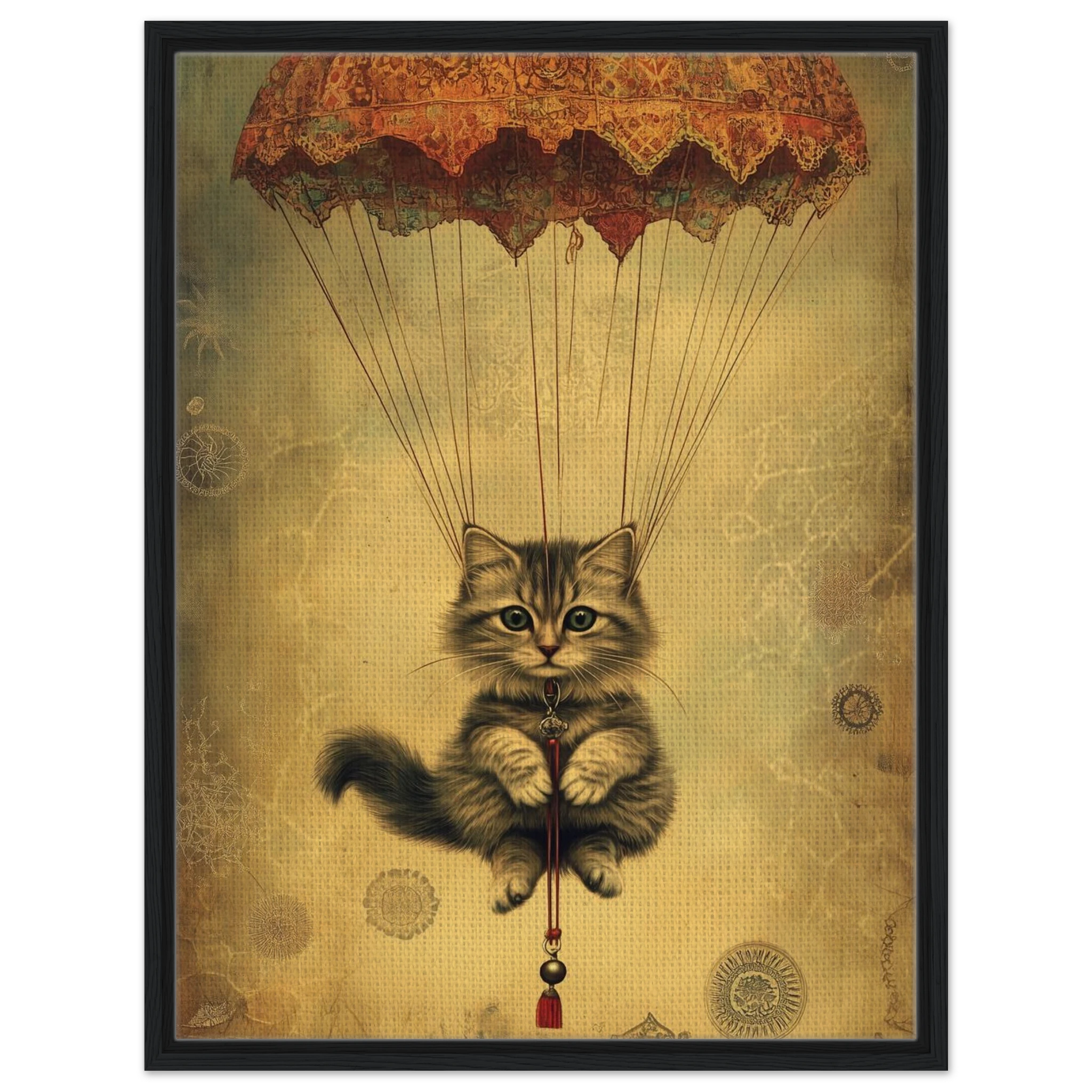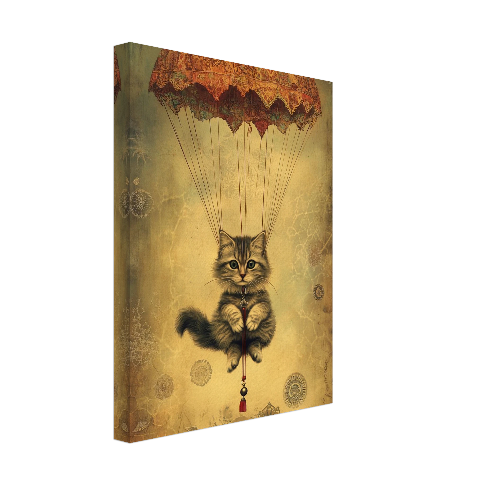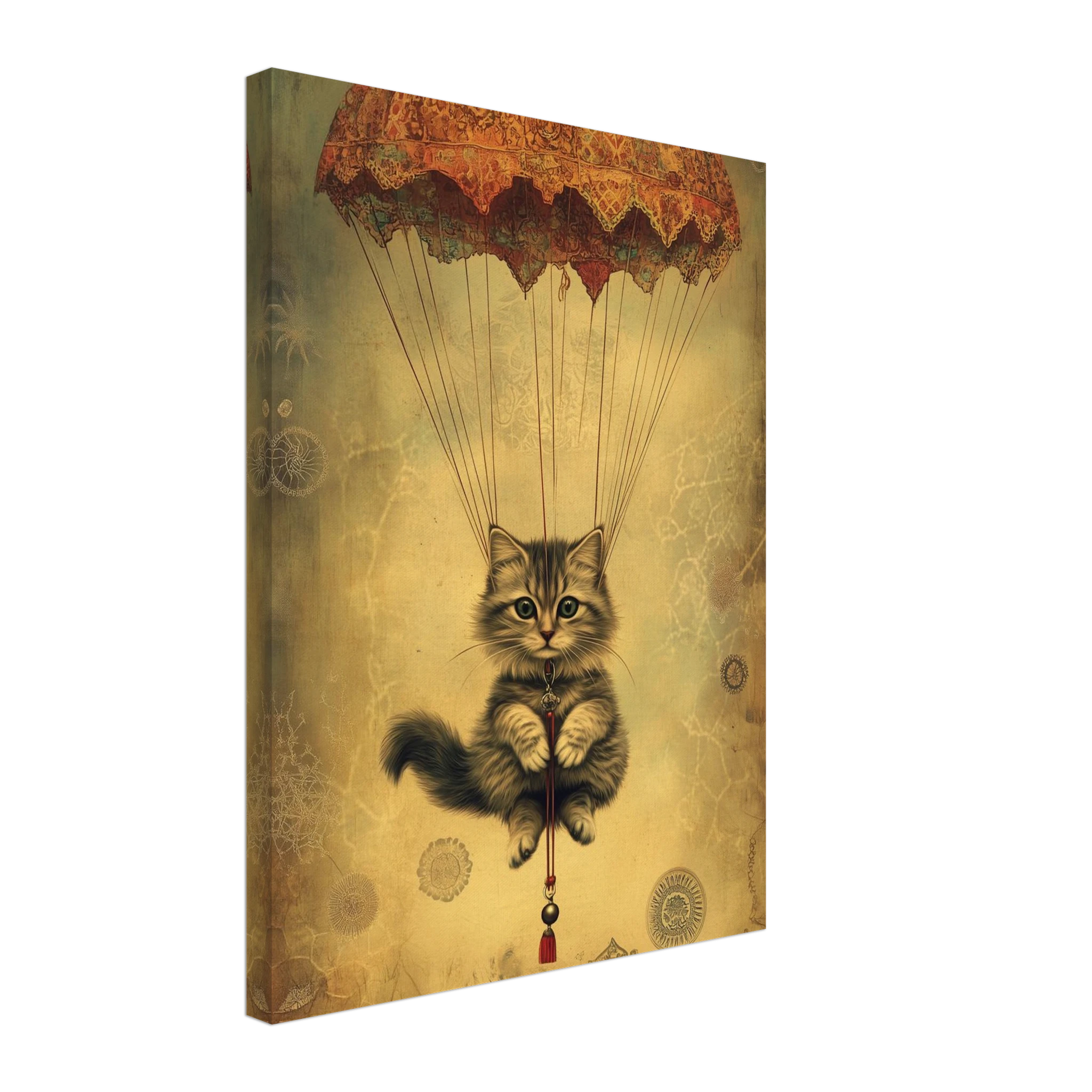 With lace parachute overhead and a poised grip on the tassel below, this airborne kitty is clearly on a noble mission—somewhere between Narnia and a Parisian flea market.