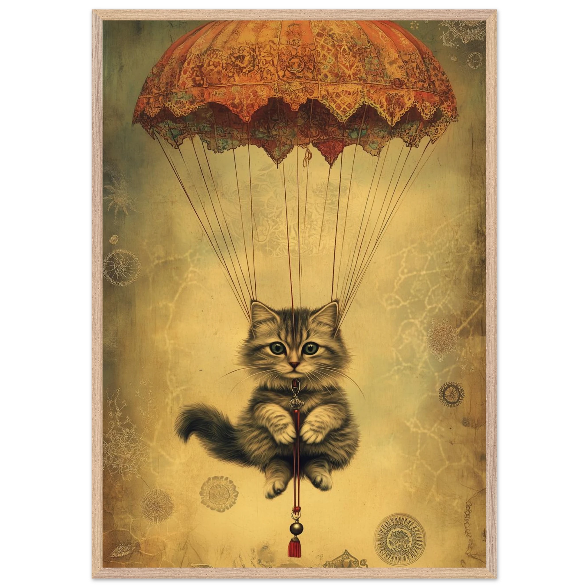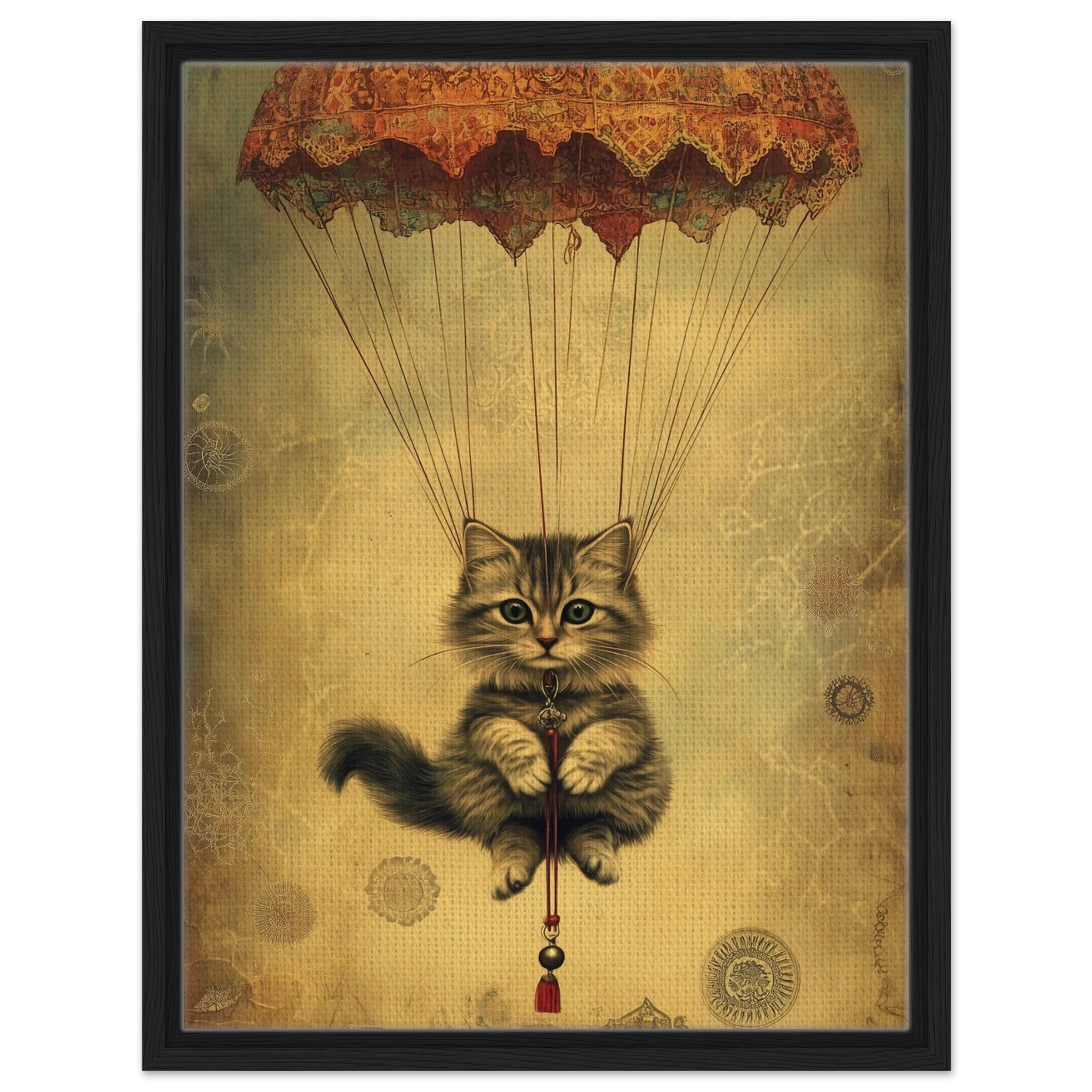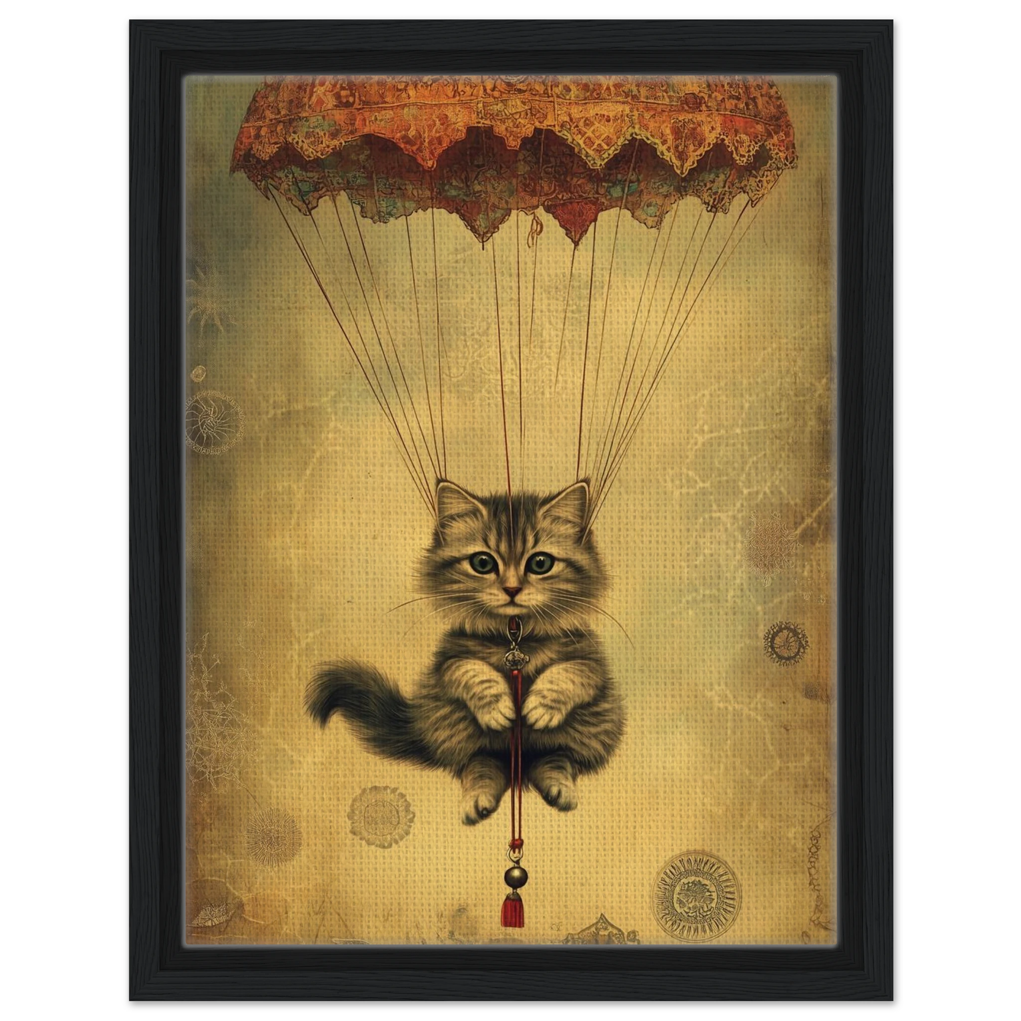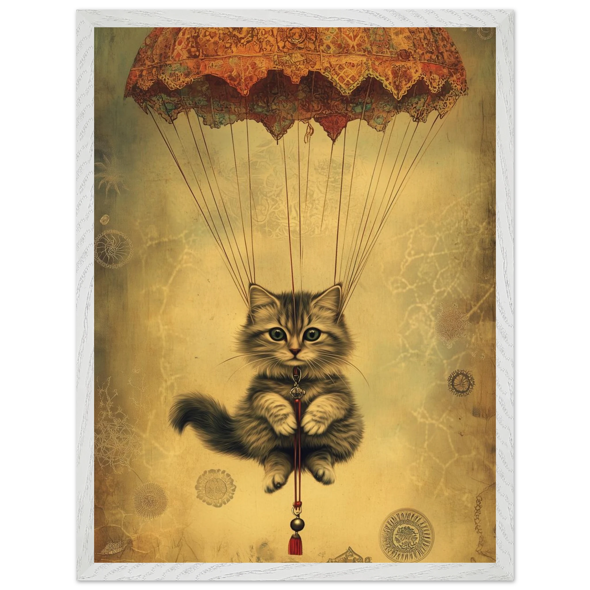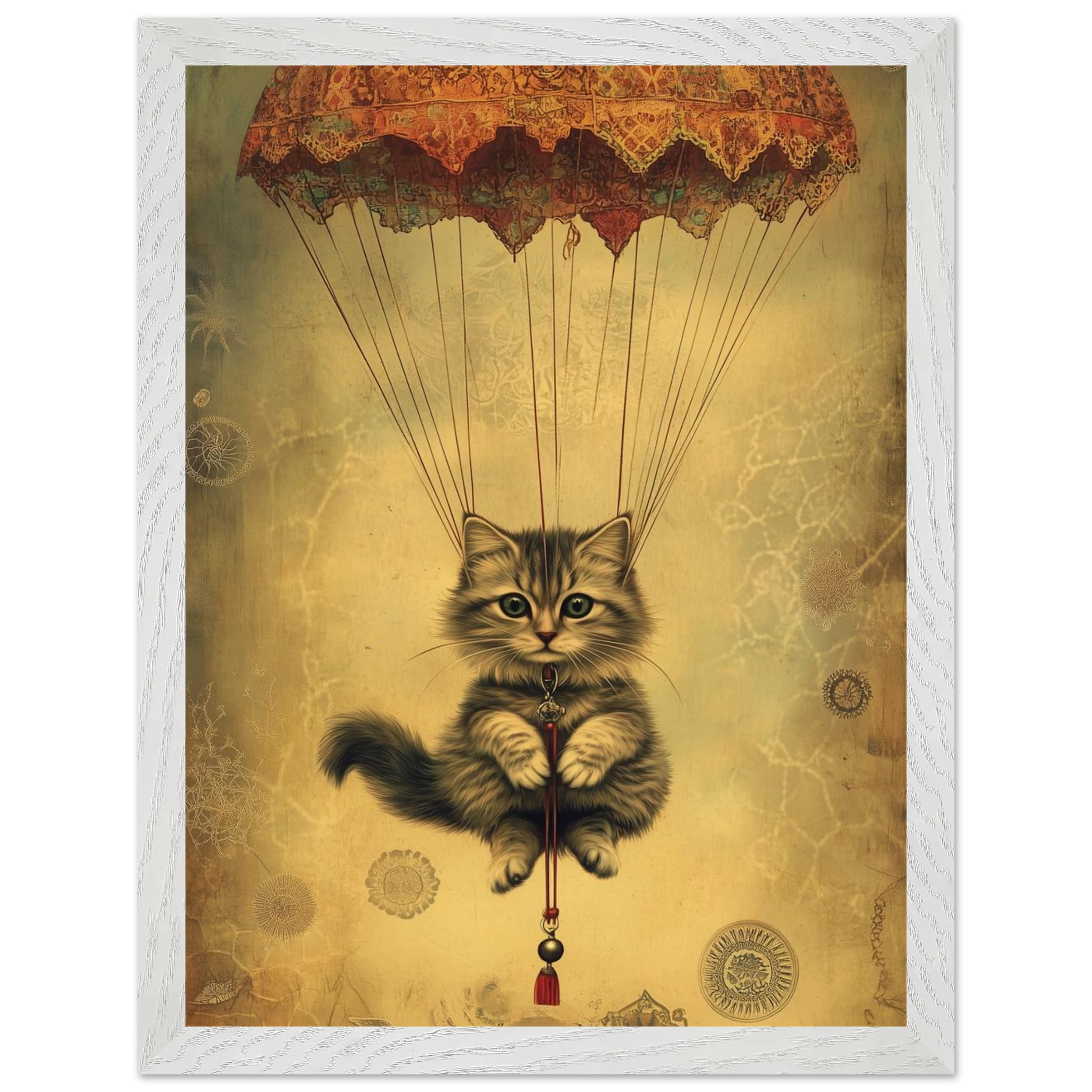 With lace parachute overhead and a poised grip on the tassel below, this airborne kitty is clearly on a noble mission—somewhere between Narnia and a Parisian flea market.