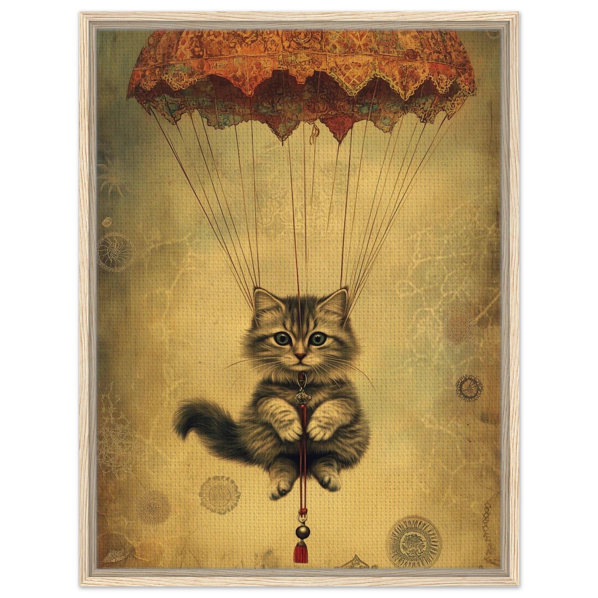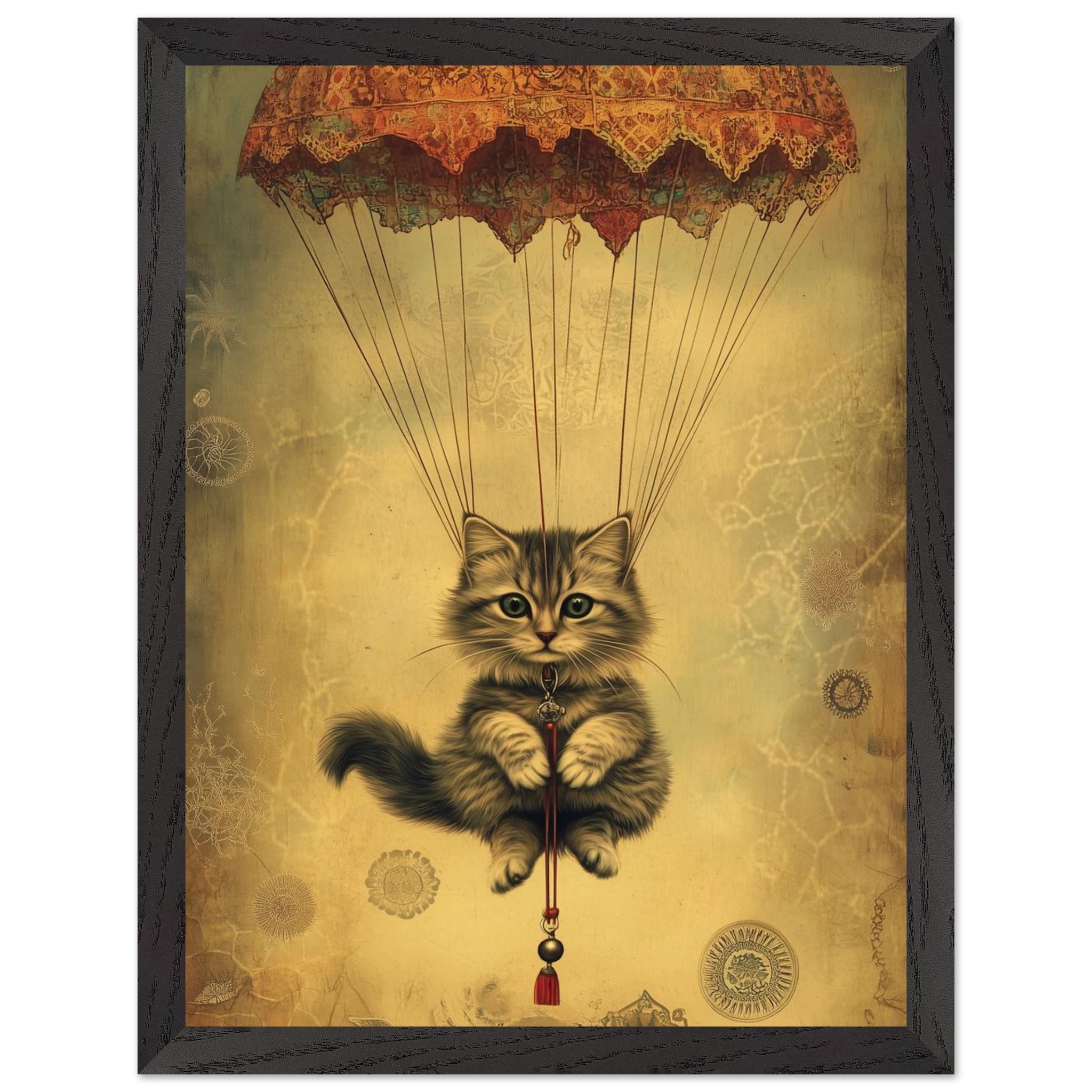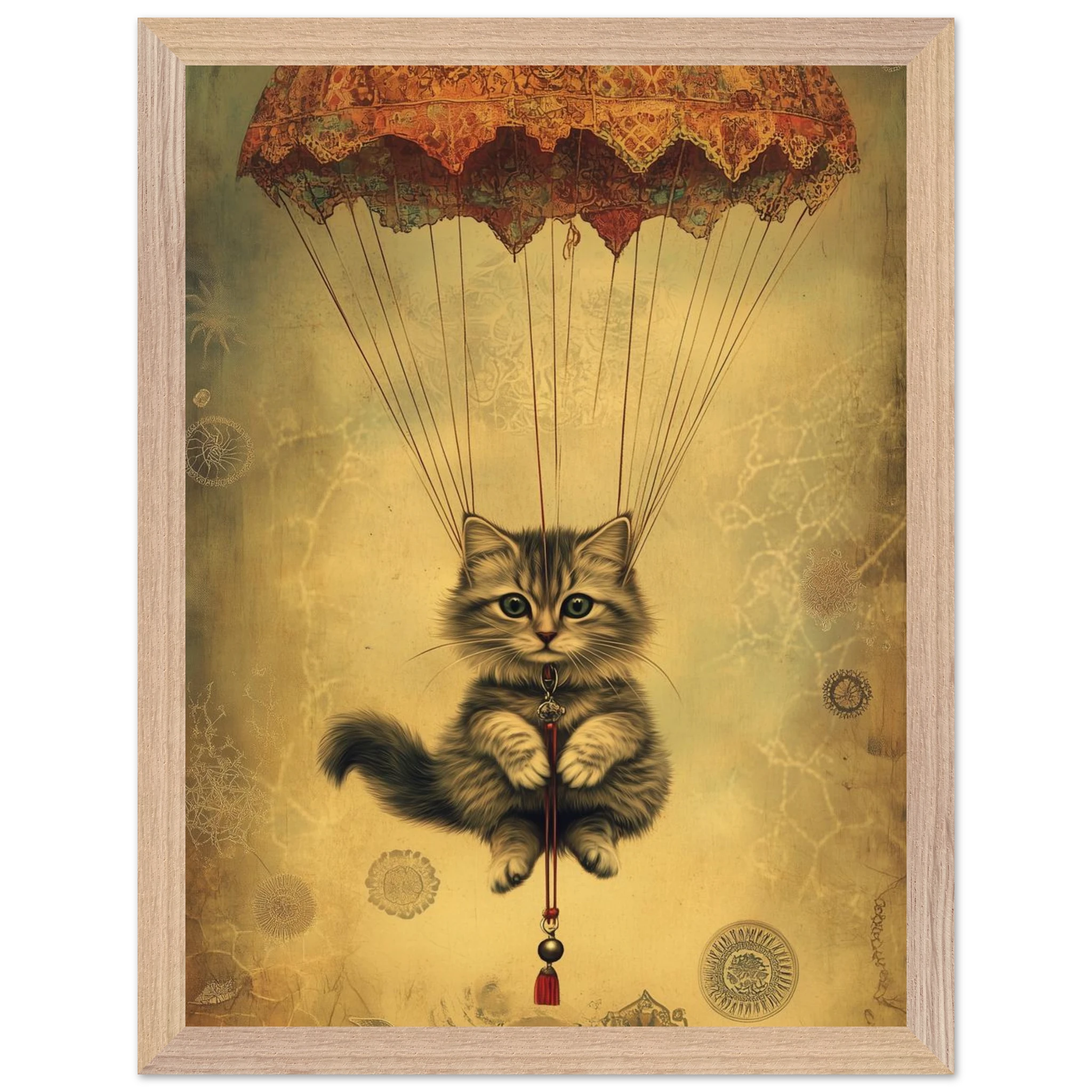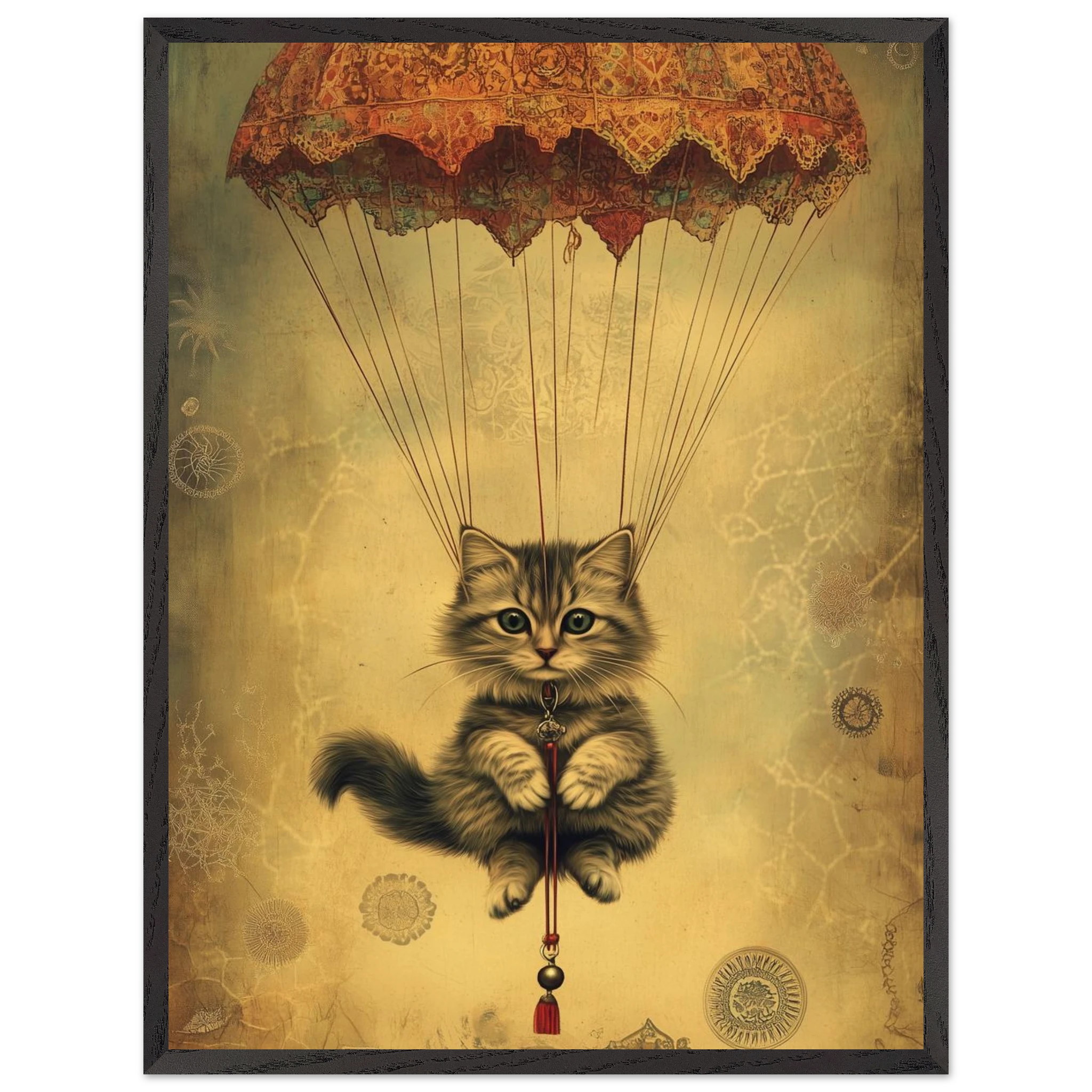 With lace parachute overhead and a poised grip on the tassel below, this airborne kitty is clearly on a noble mission—somewhere between Narnia and a Parisian flea market.