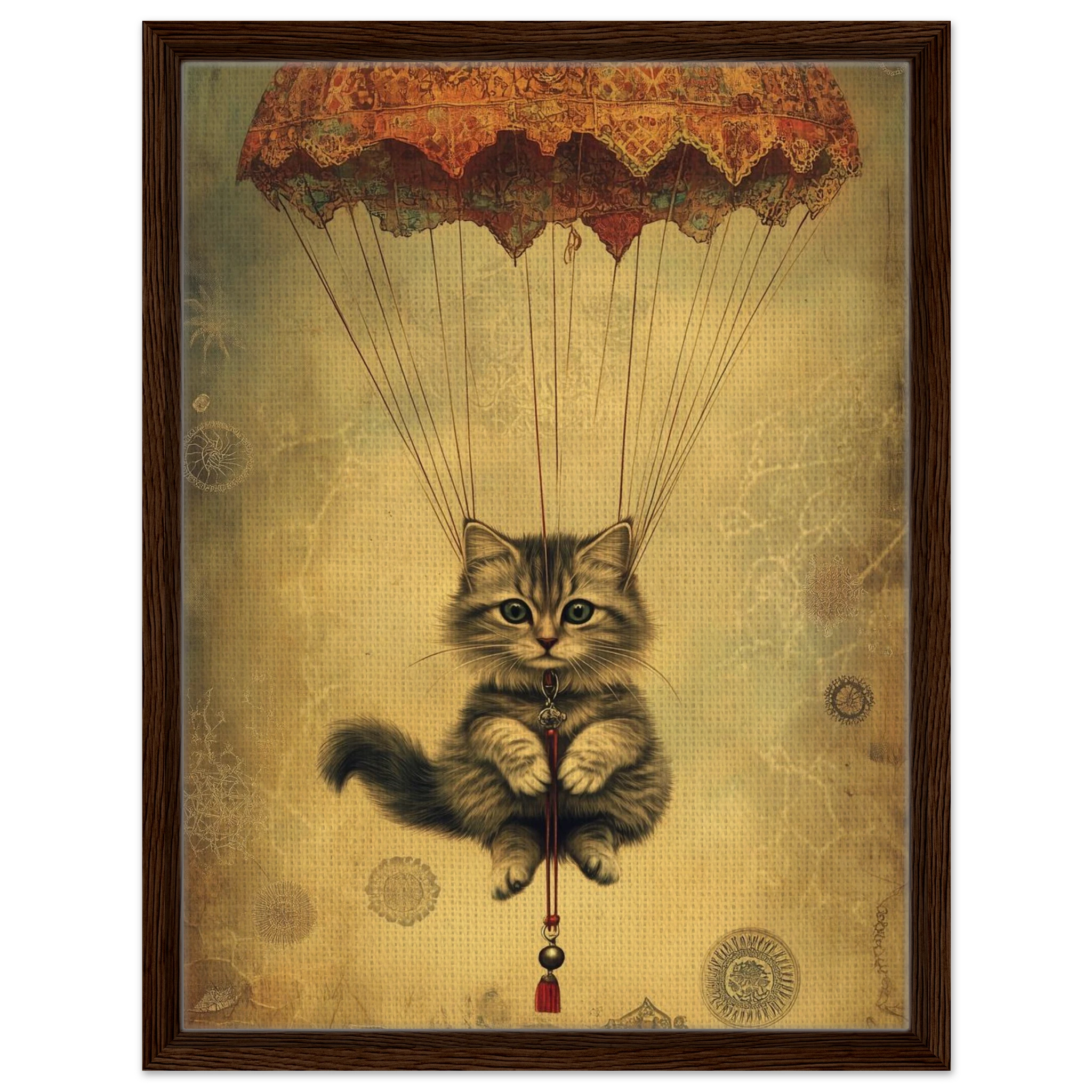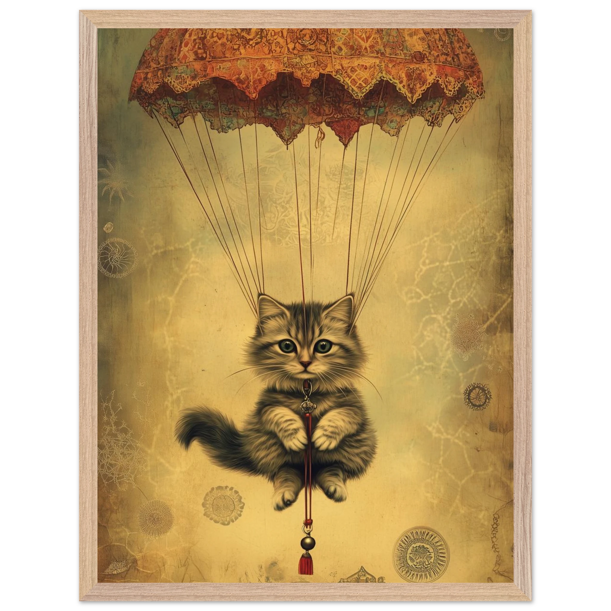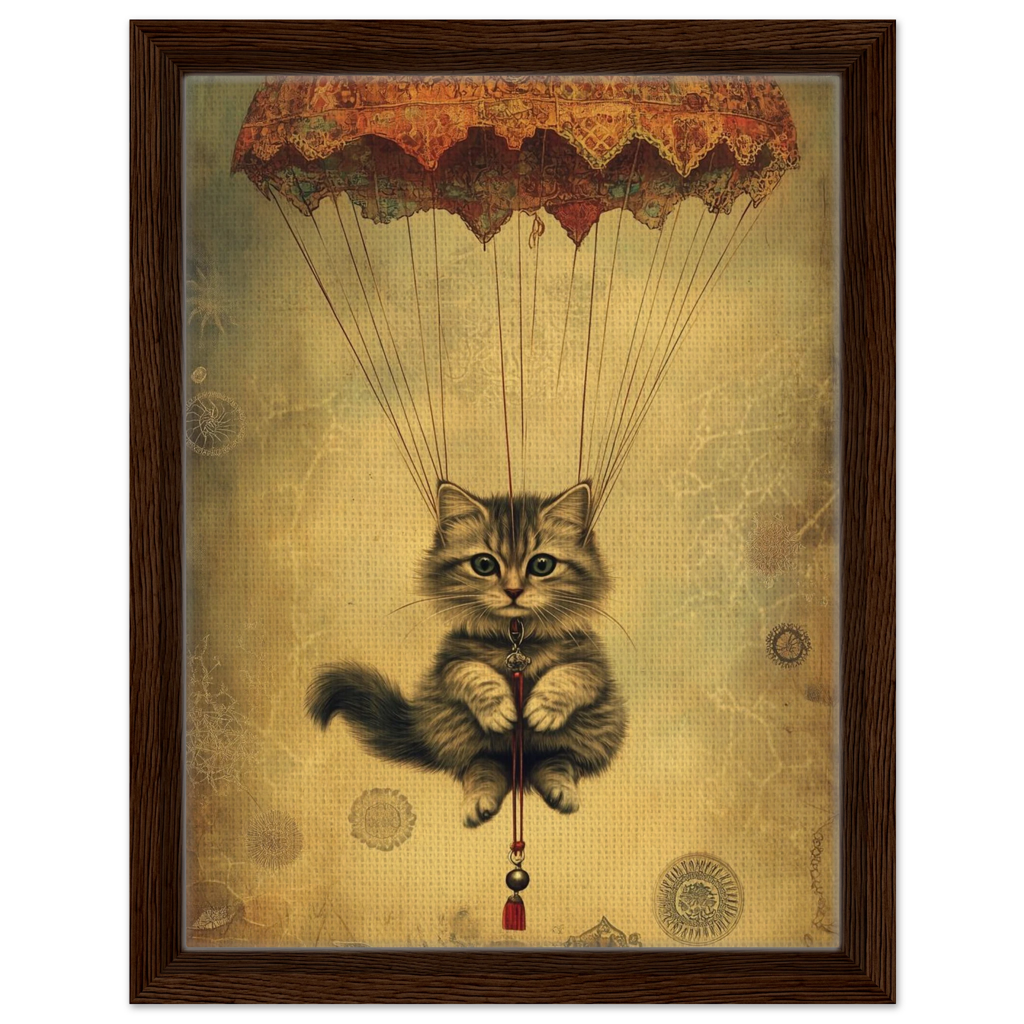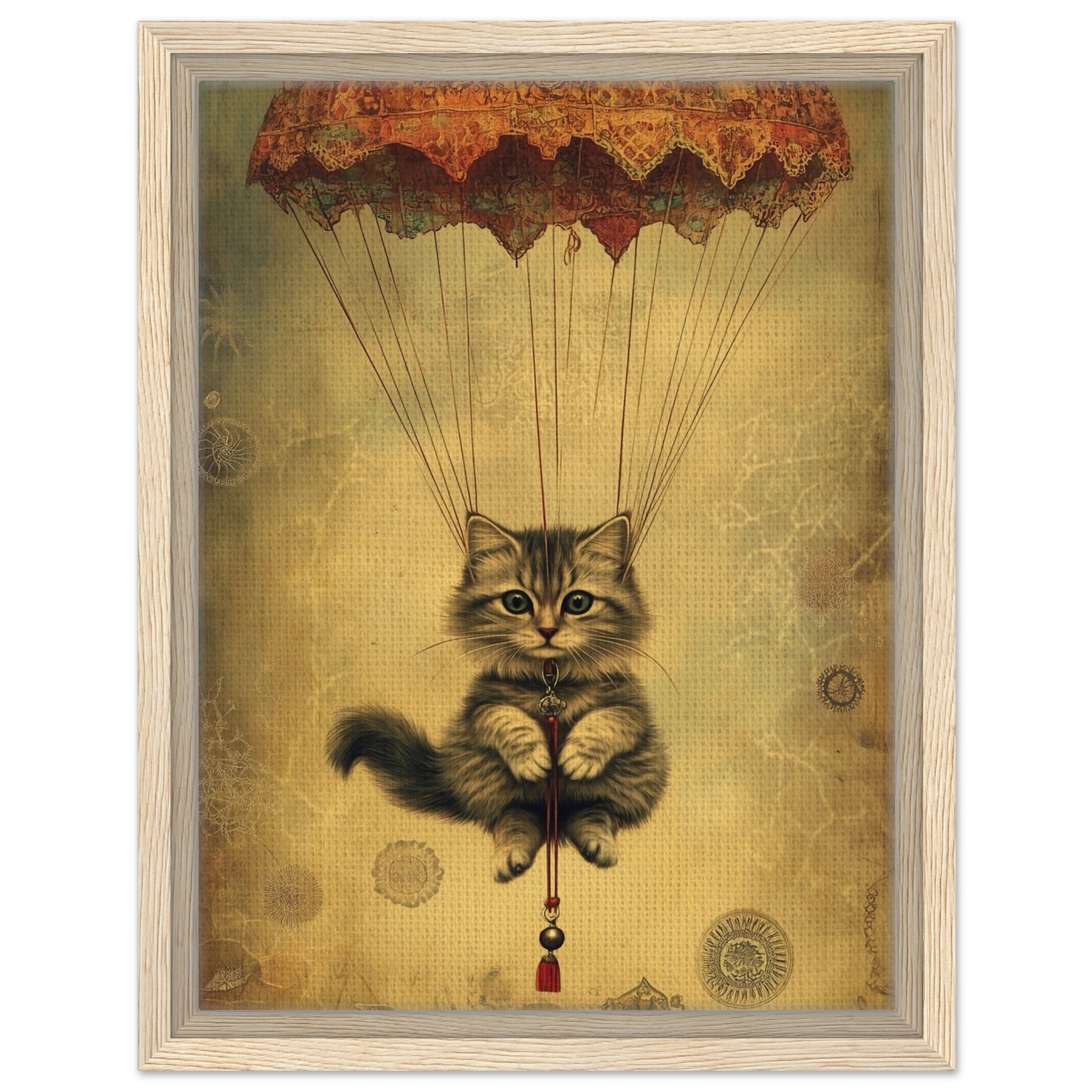With lace parachute overhead and a poised grip on the tassel below, this airborne kitty is clearly on a noble mission—somewhere between Narnia and a Parisian flea market.