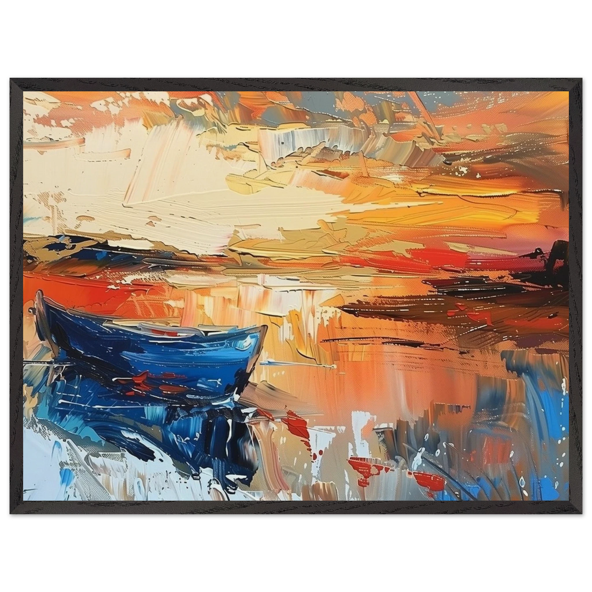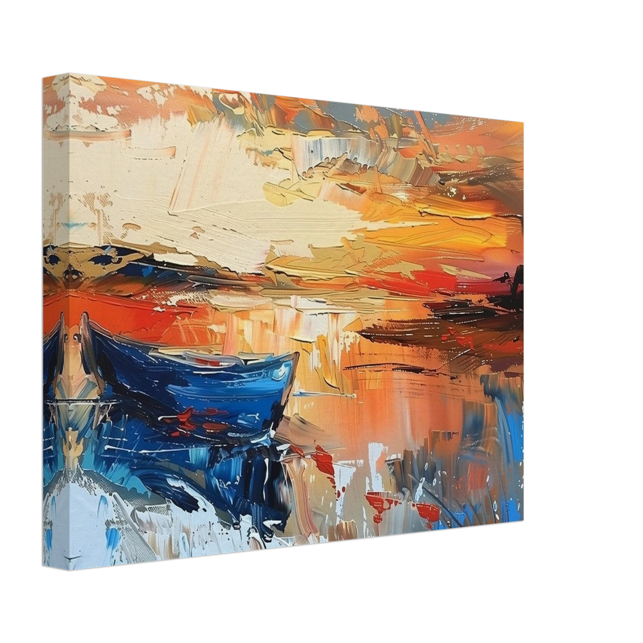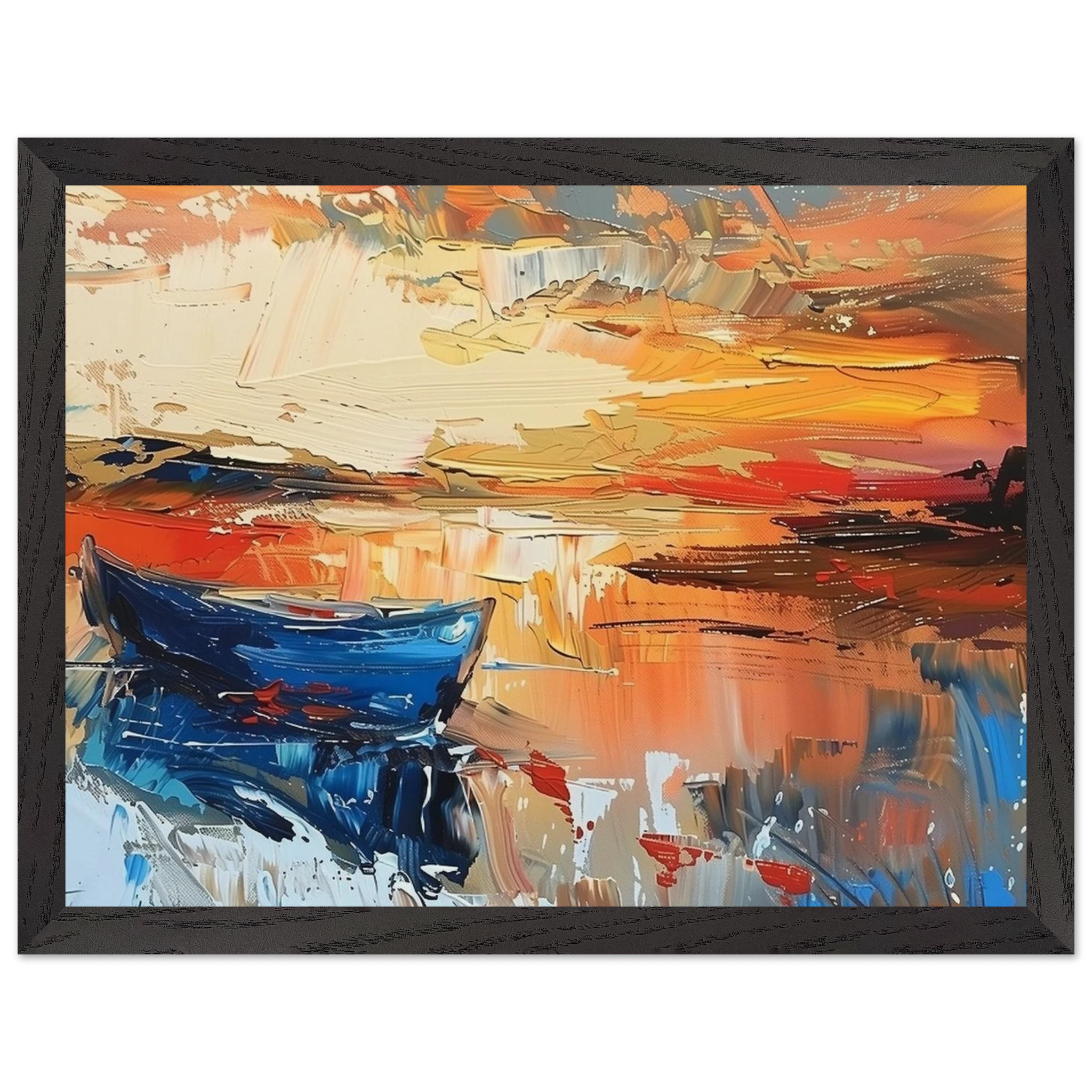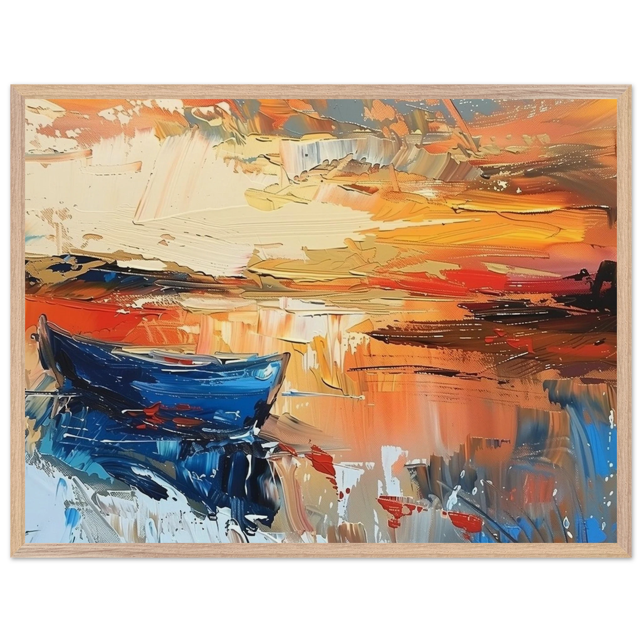 A lone boat waits beneath a sky ablaze—where fire meets water, memory begins to blur.