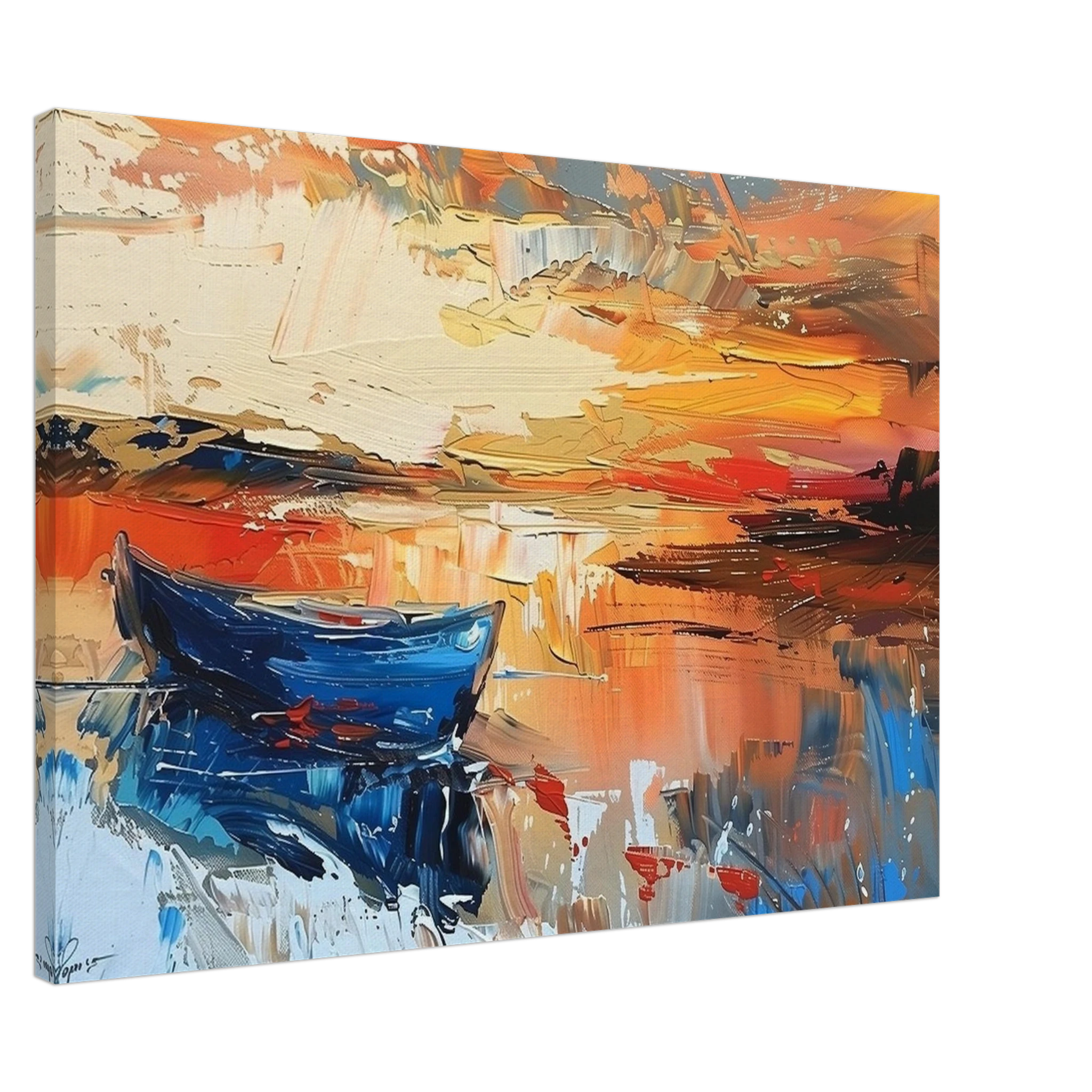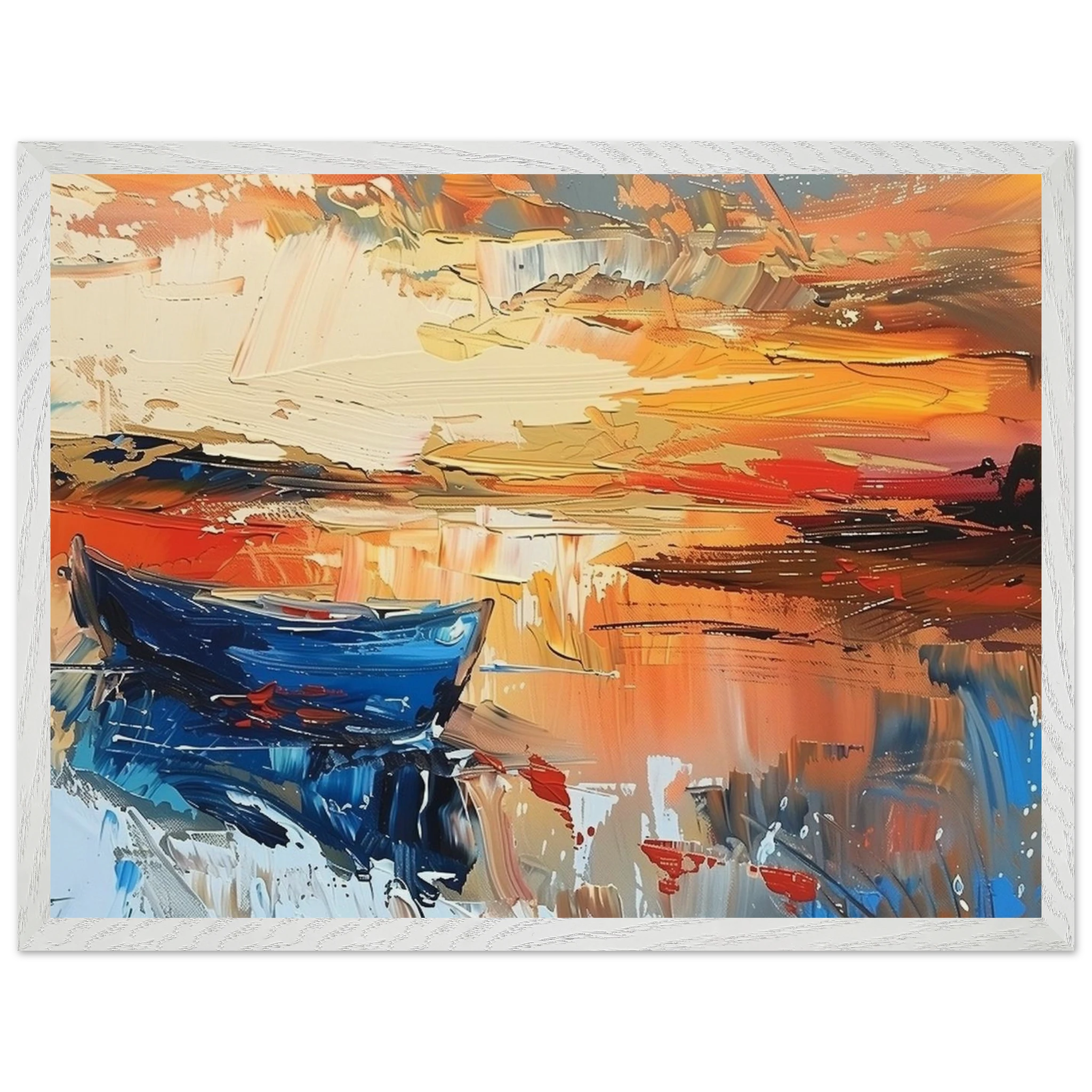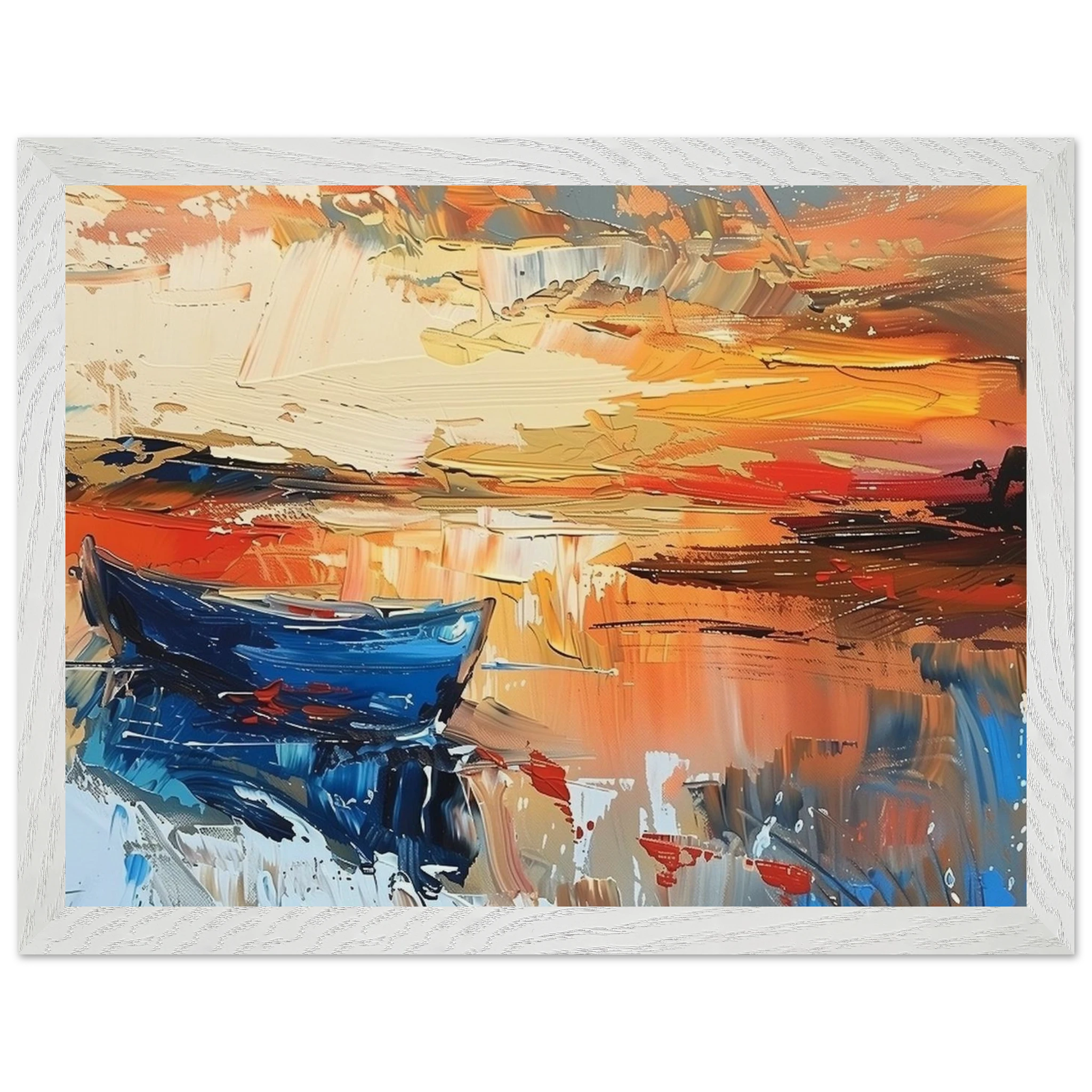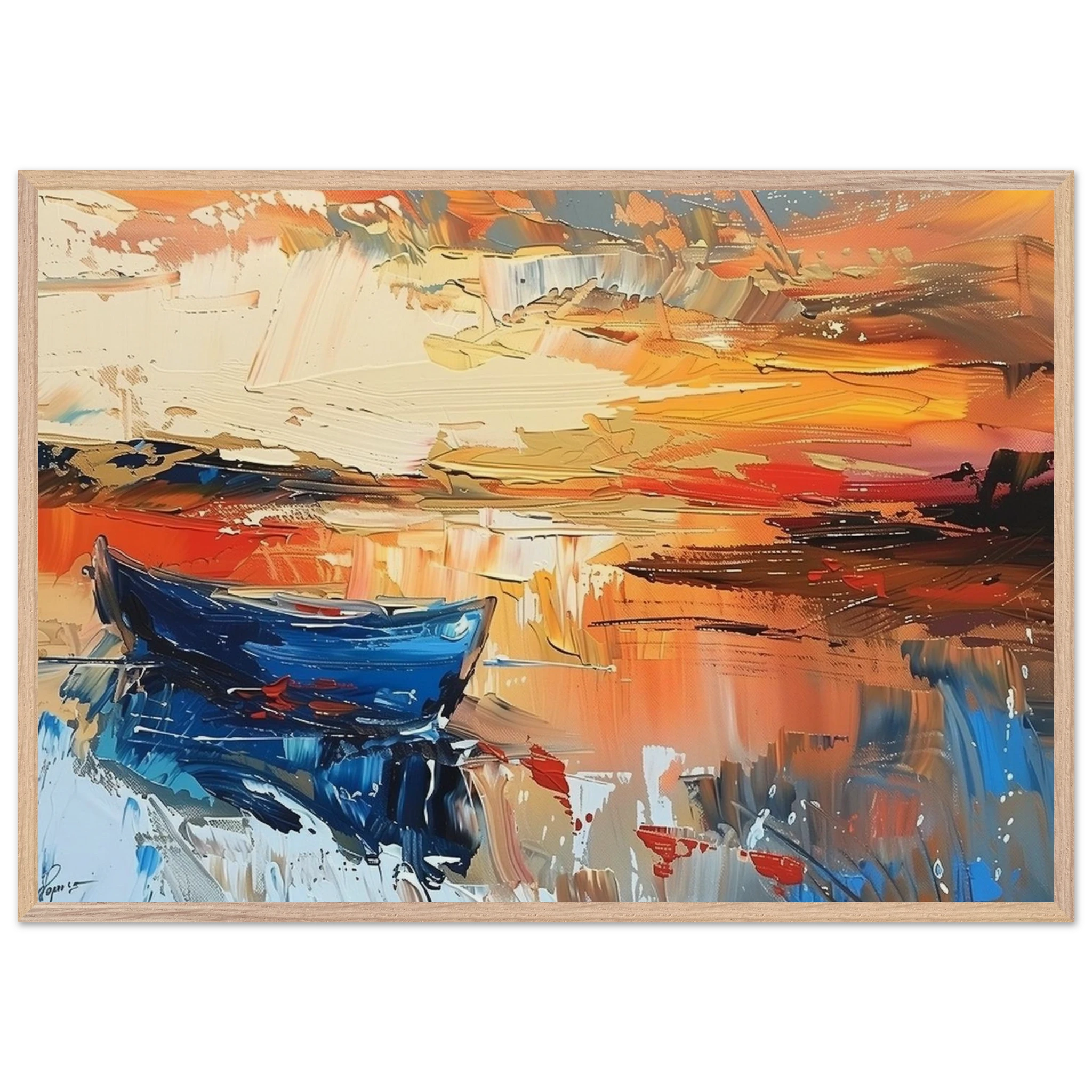 A lone boat waits beneath a sky ablaze—where fire meets water, memory begins to blur.