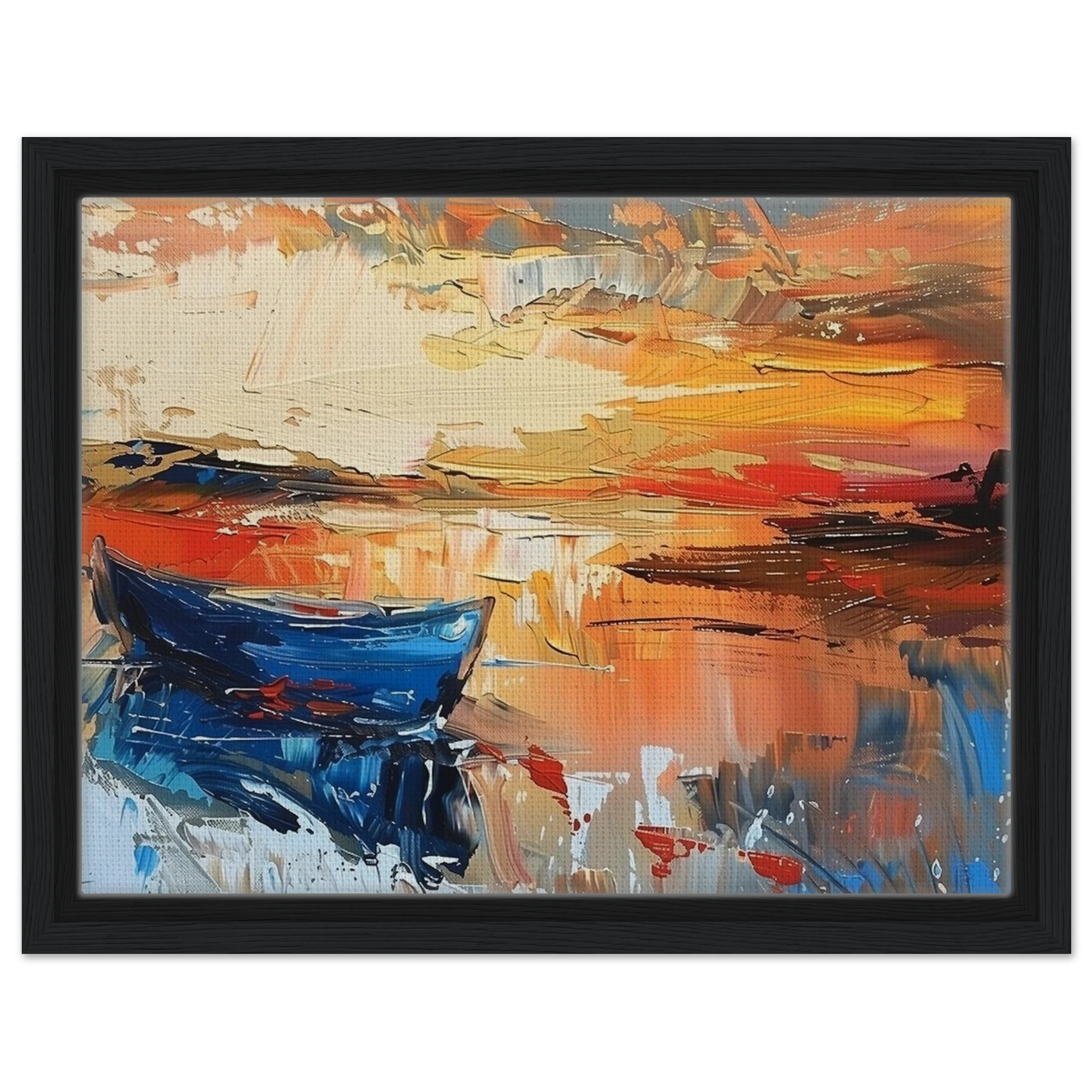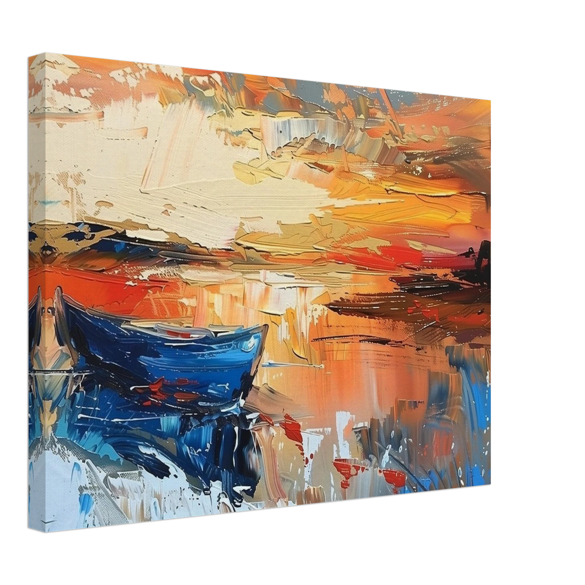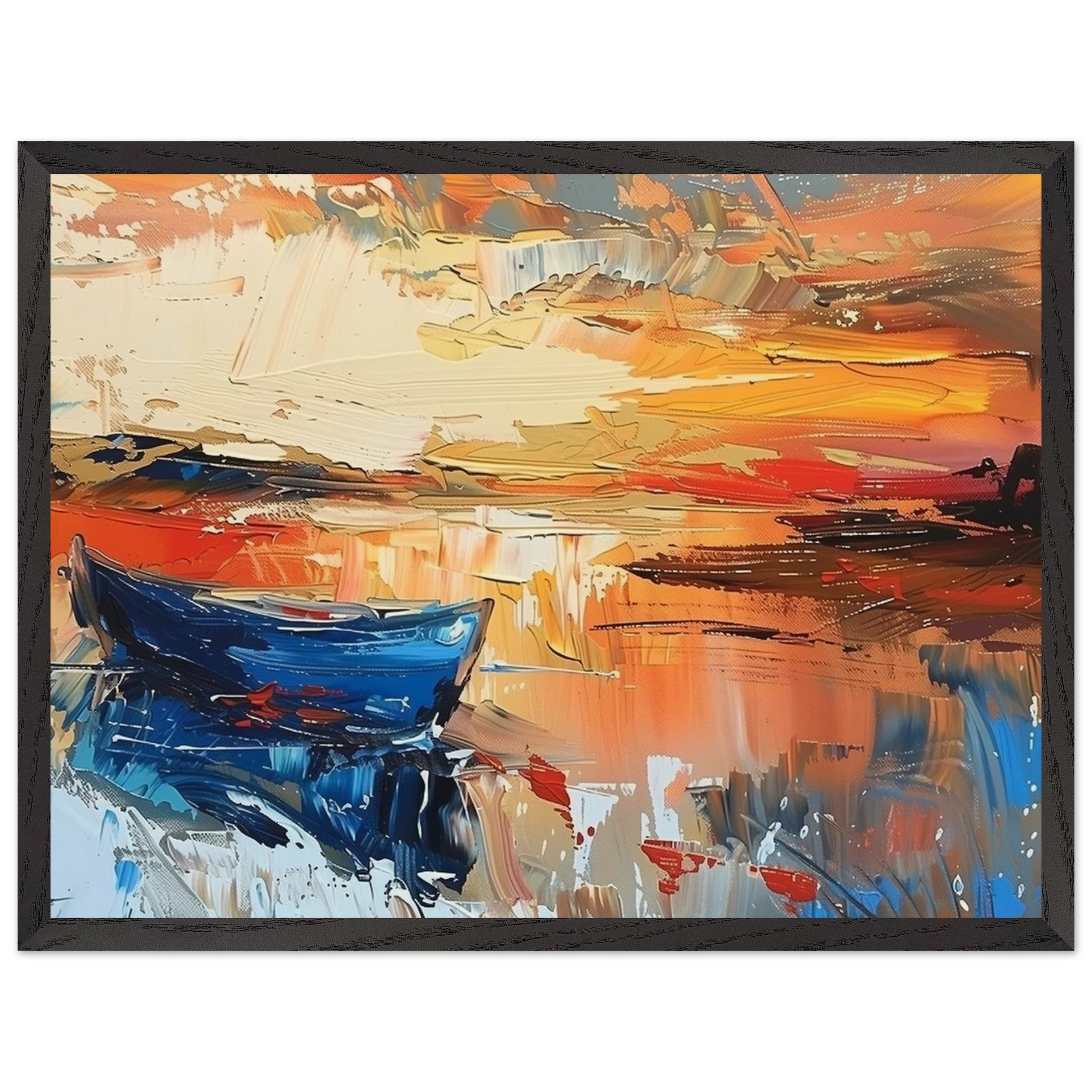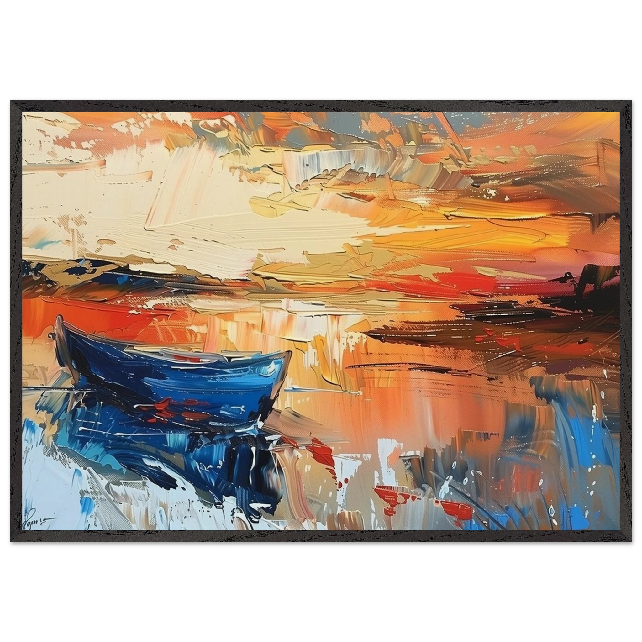 A lone boat waits beneath a sky ablaze—where fire meets water, memory begins to blur.