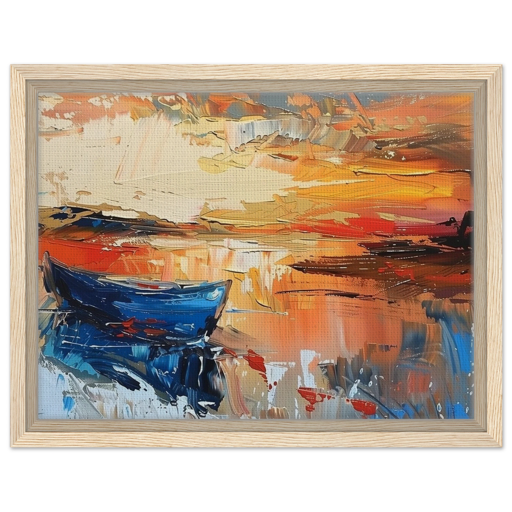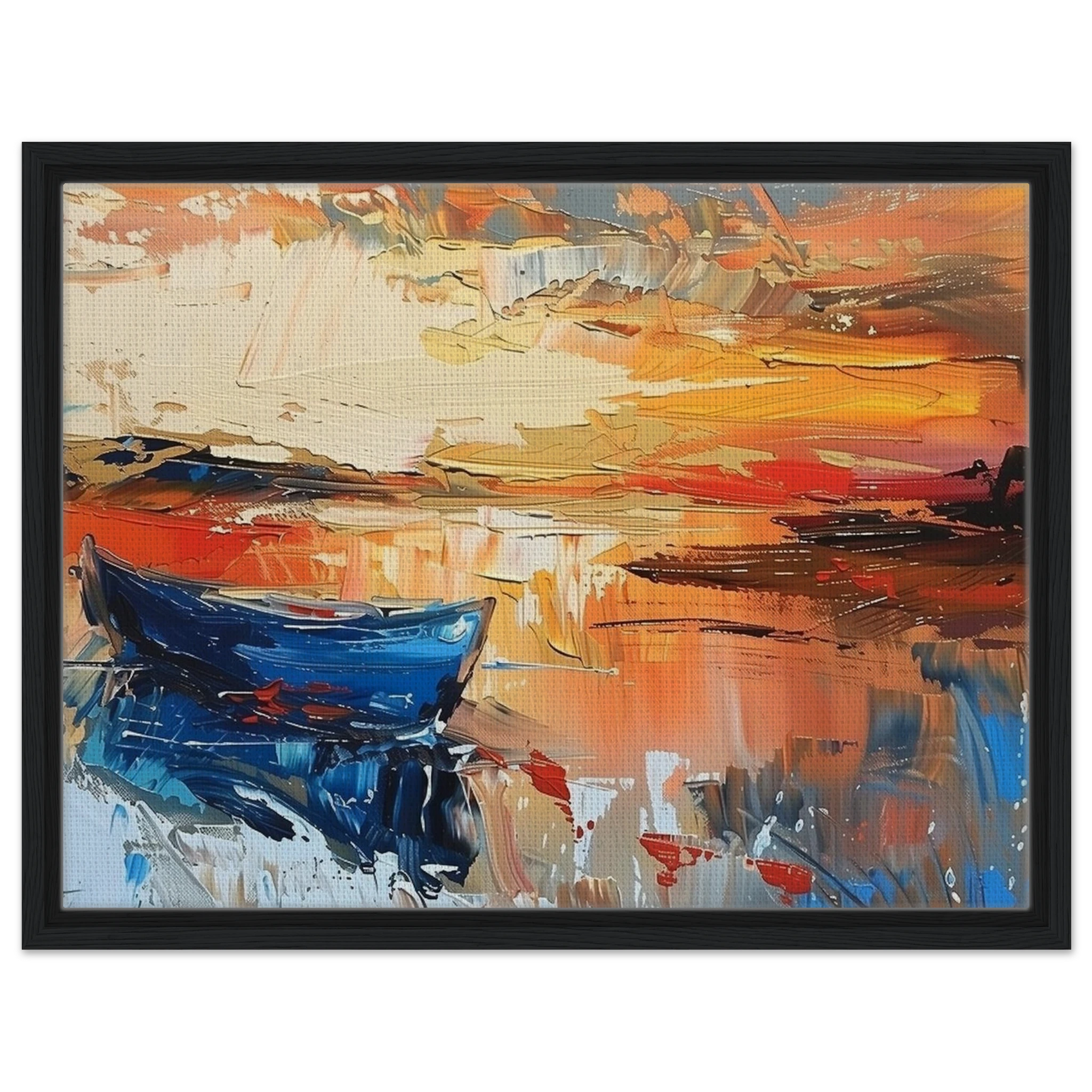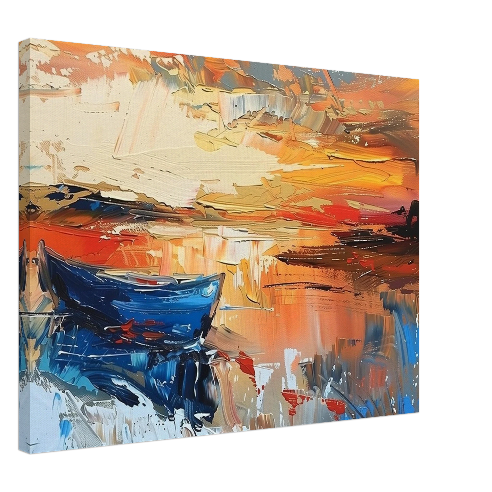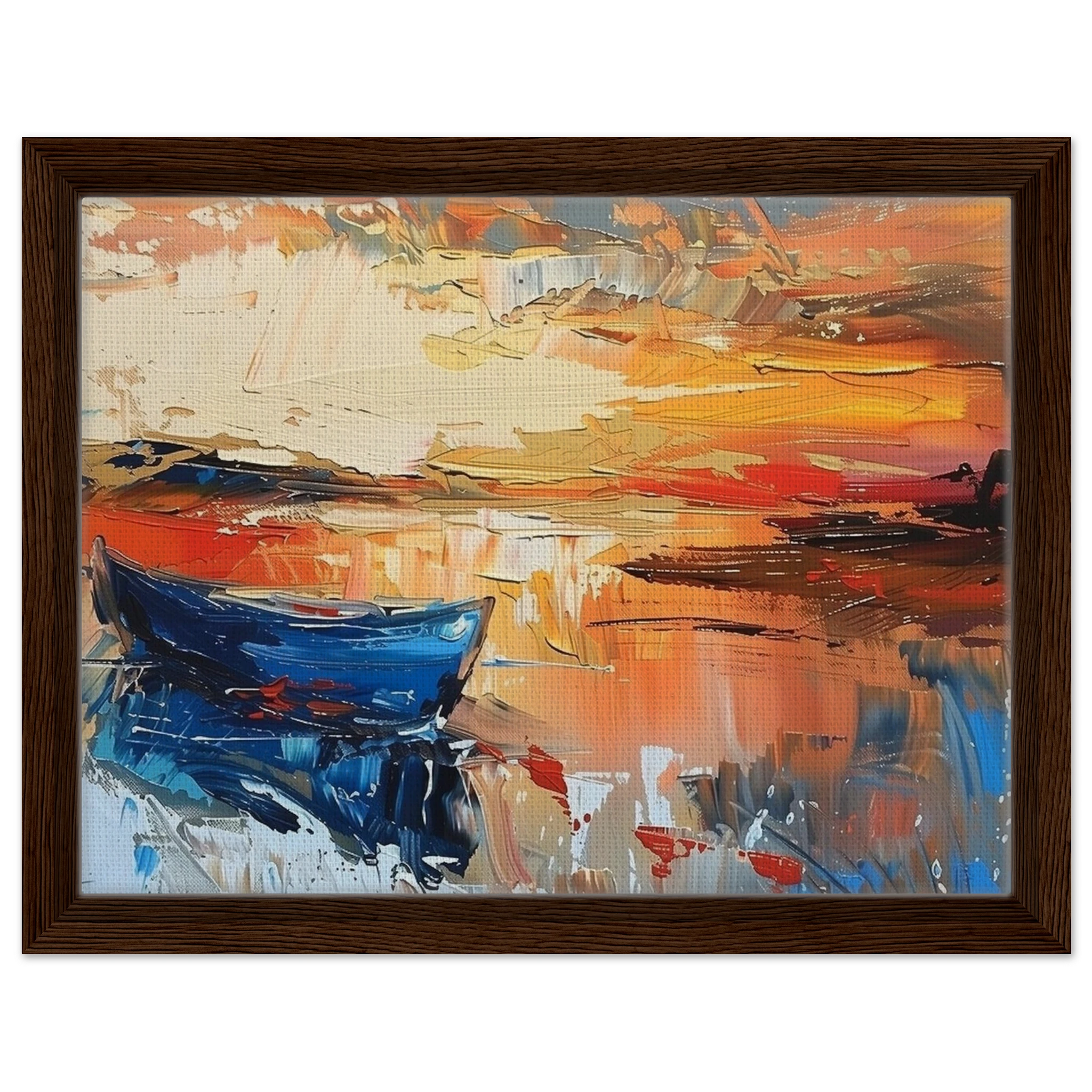 A lone boat waits beneath a sky ablaze—where fire meets water, memory begins to blur.