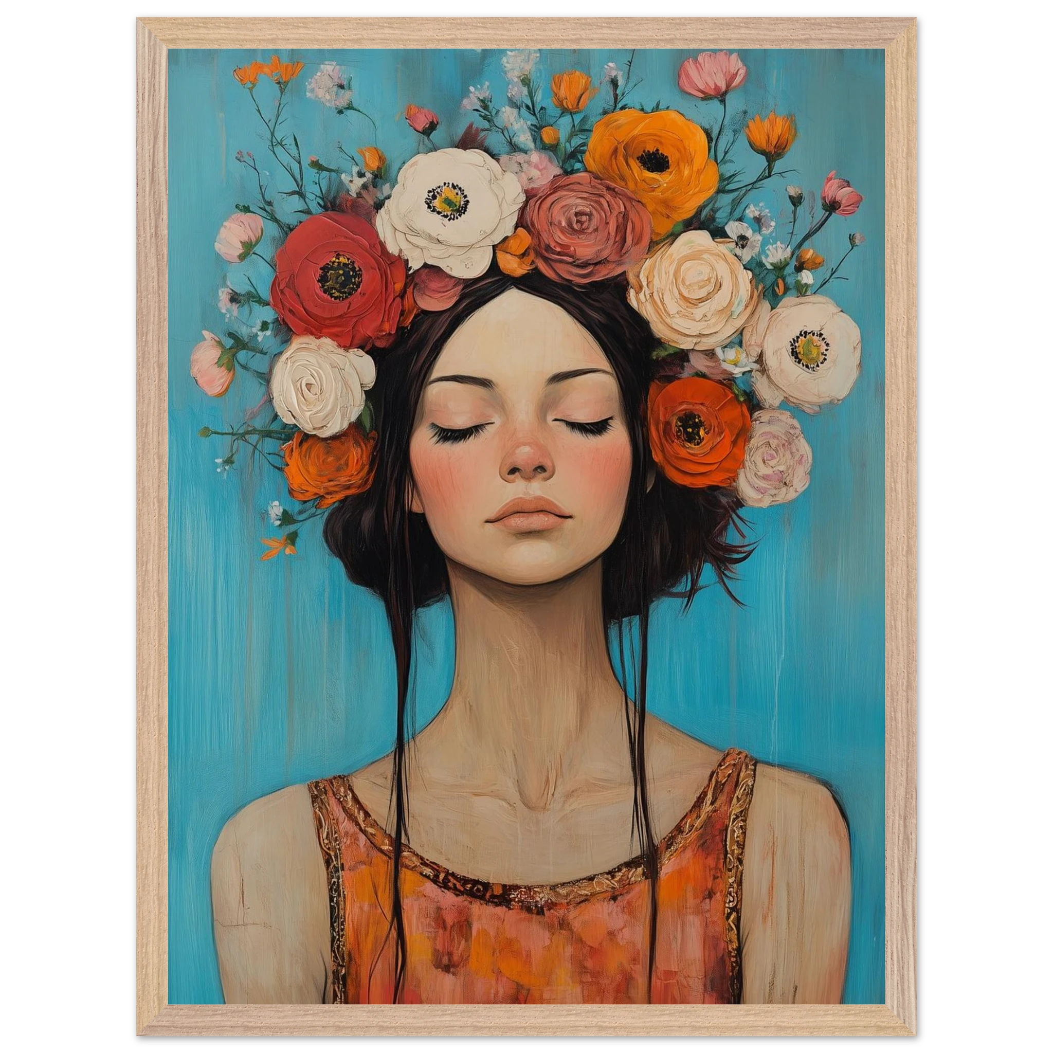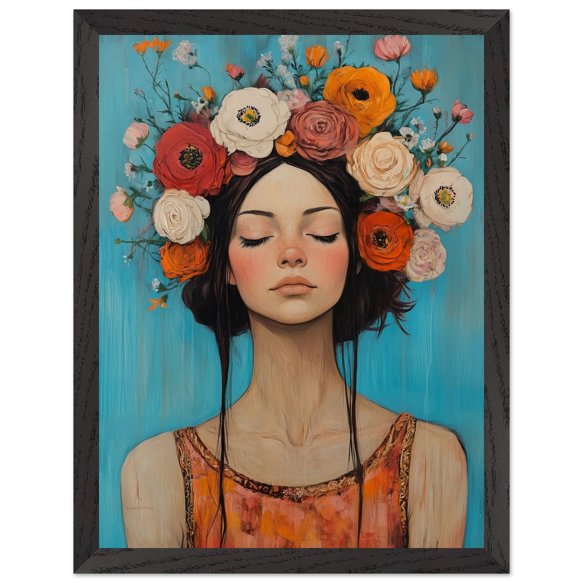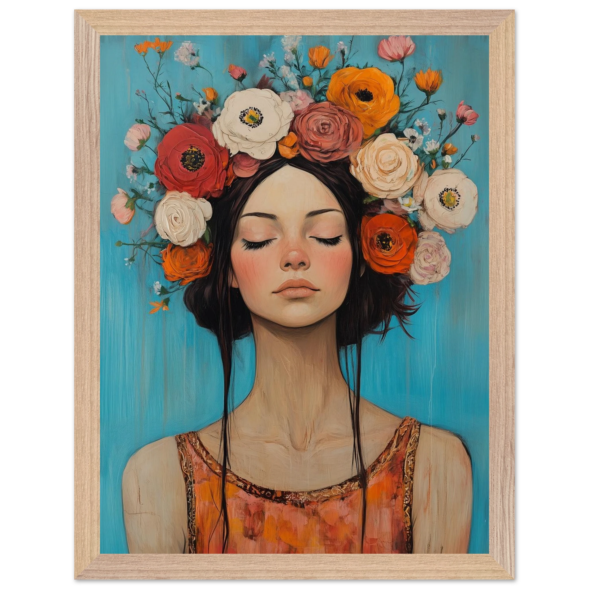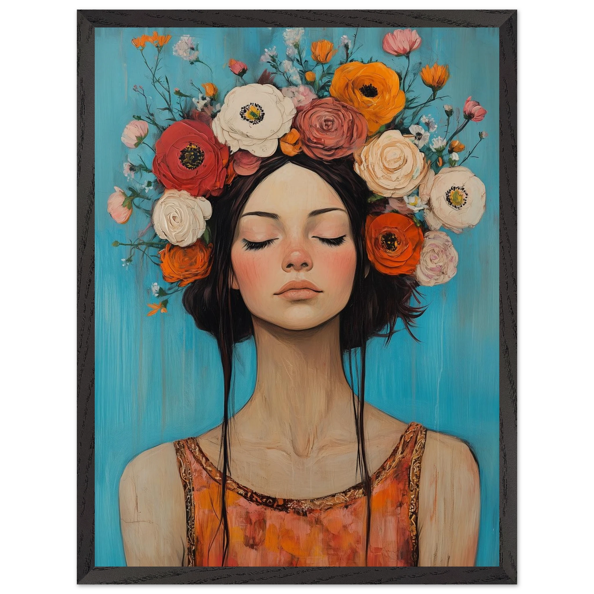 She wears no jewels, only flowers. This portrait channels rooted elegance—strength in softness, silence with depth. A bold yet gentle artwork for interiors that speak in beauty and stillness.