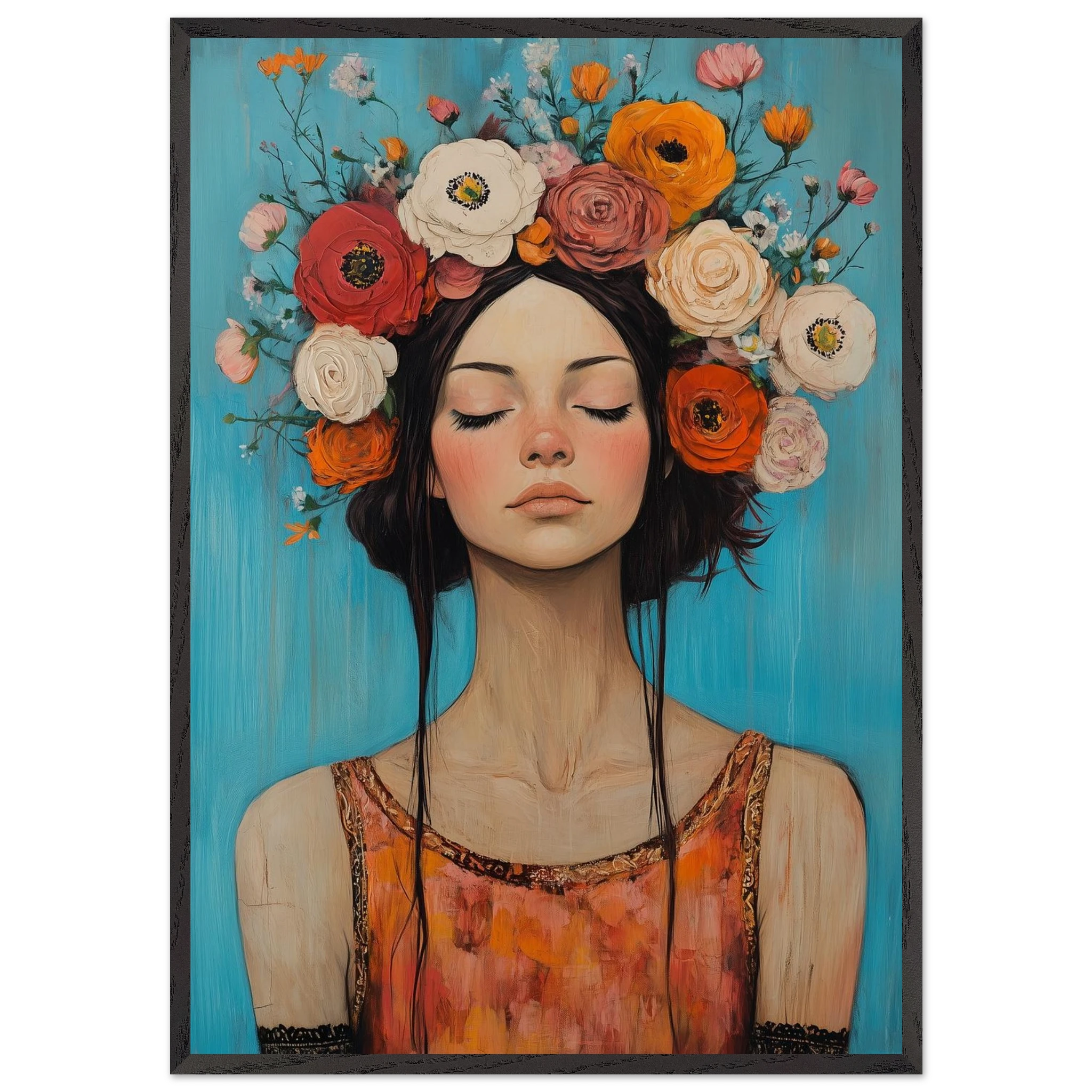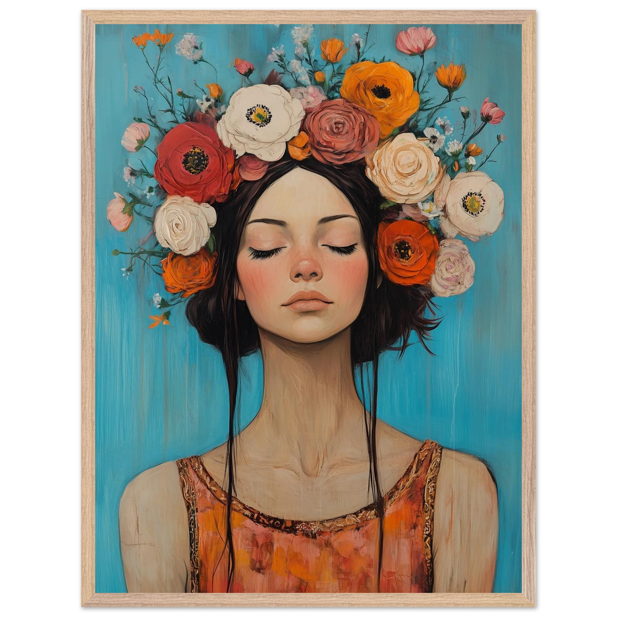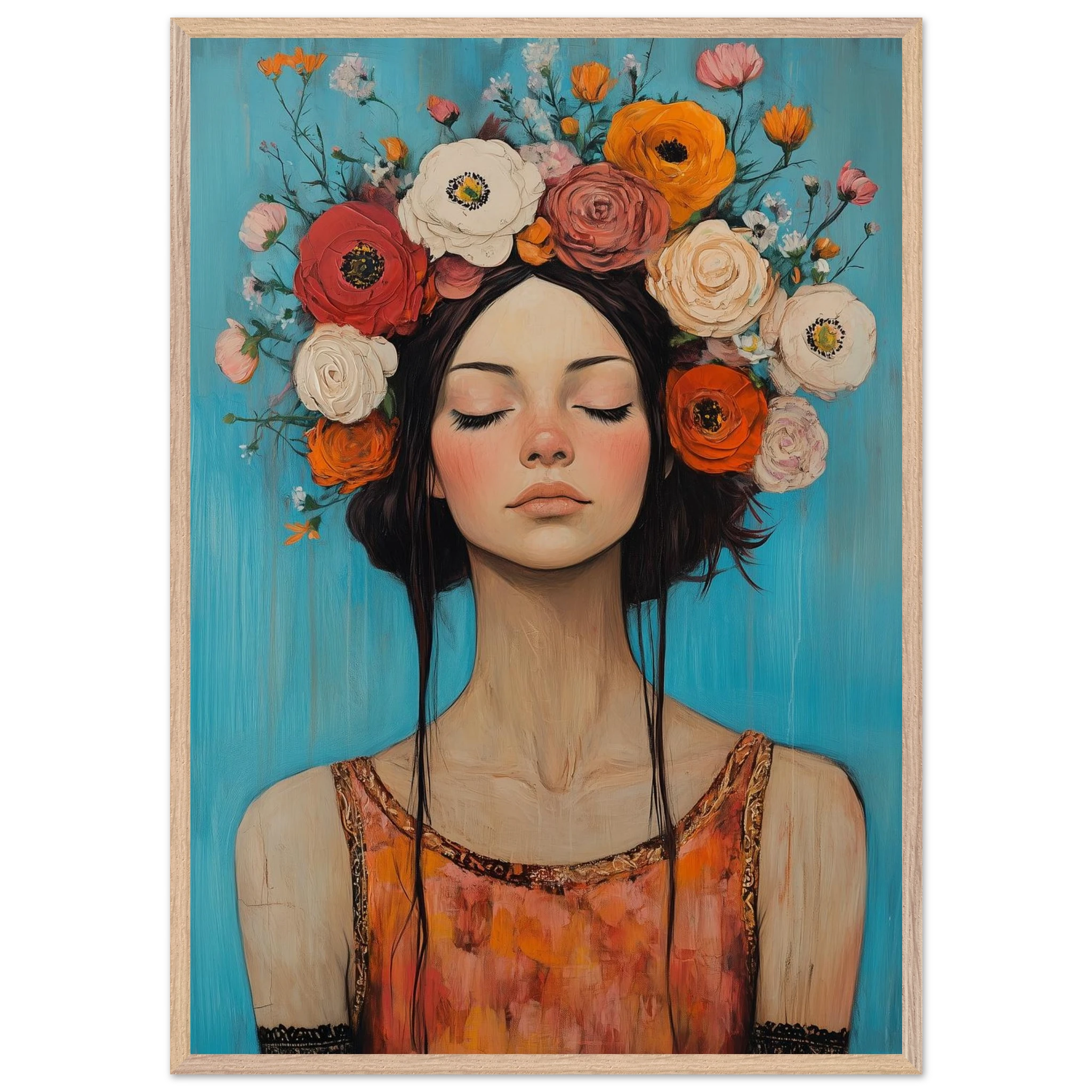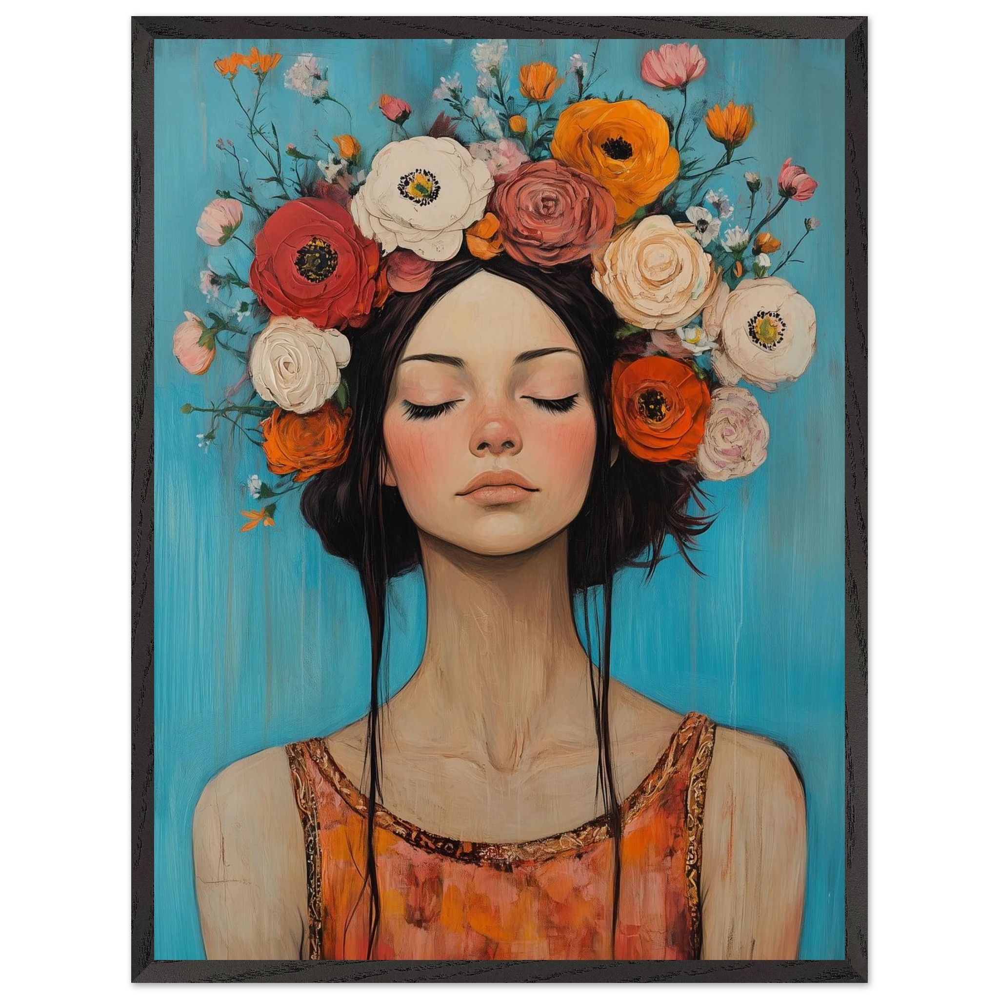 She wears no jewels, only flowers. This portrait channels rooted elegance—strength in softness, silence with depth. A bold yet gentle artwork for interiors that speak in beauty and stillness.