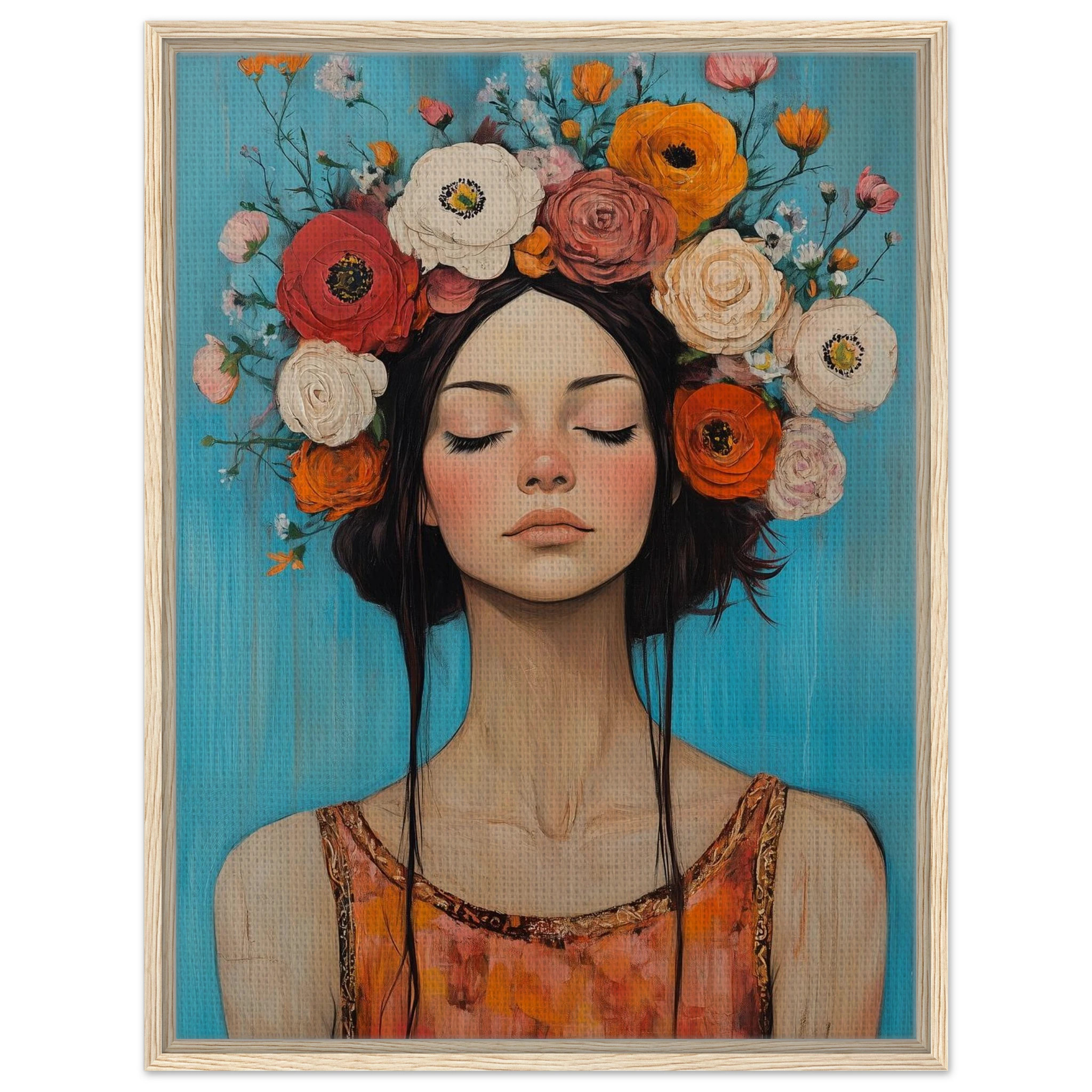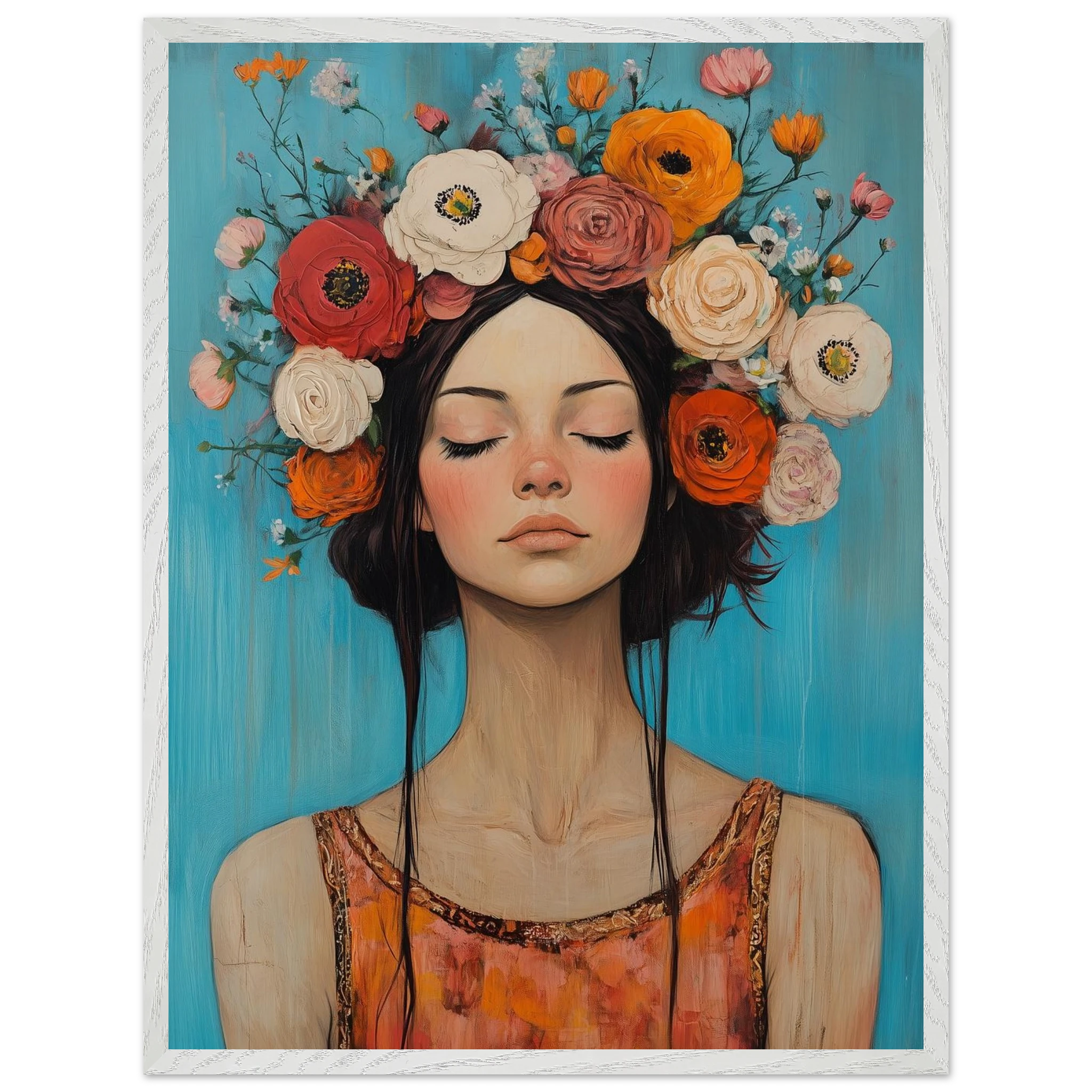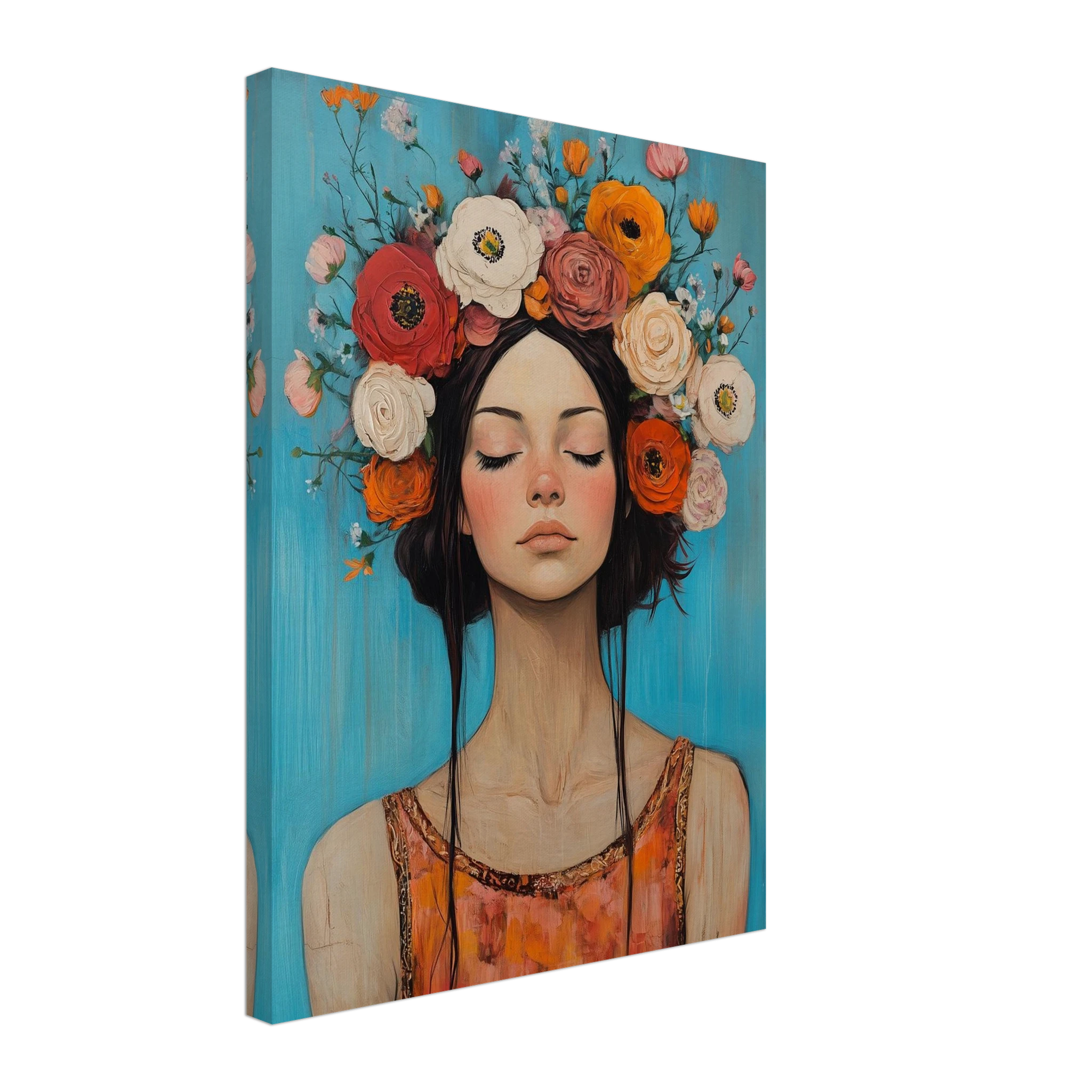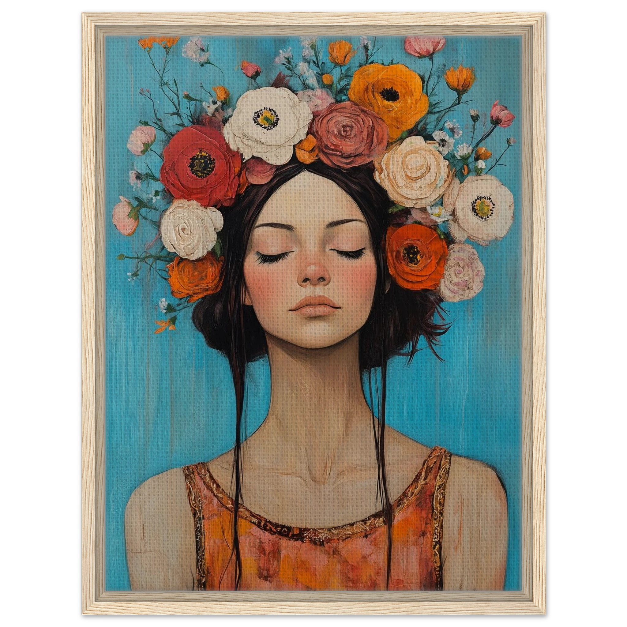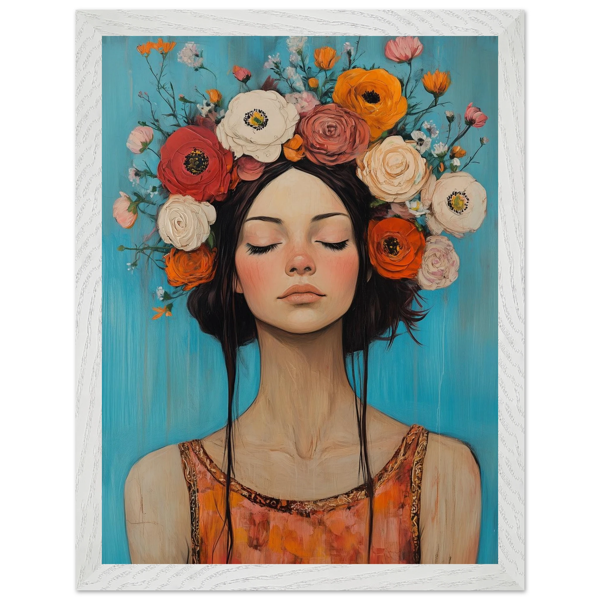 She wears no jewels, only flowers. This portrait channels rooted elegance—strength in softness, silence with depth. A bold yet gentle artwork for interiors that speak in beauty and stillness.