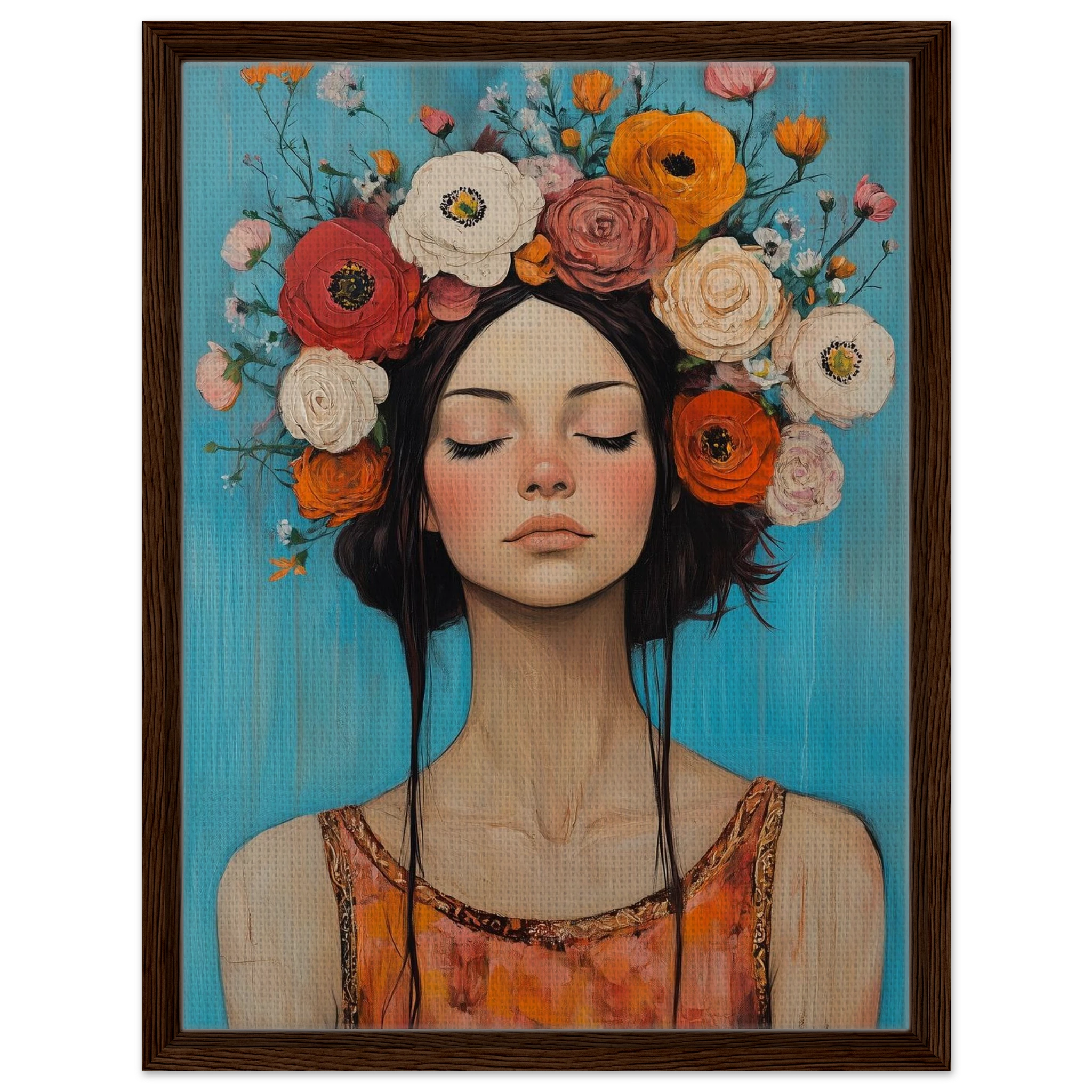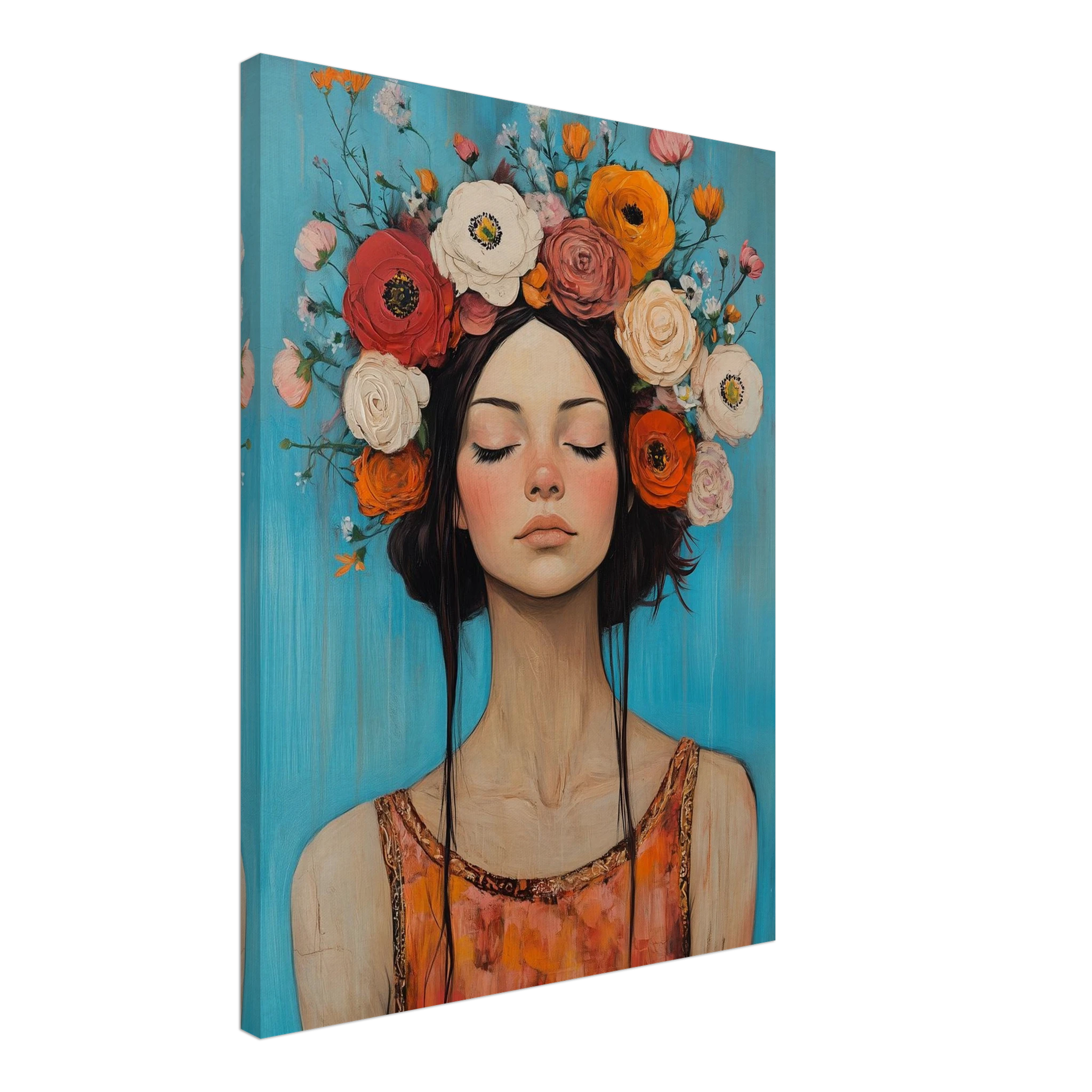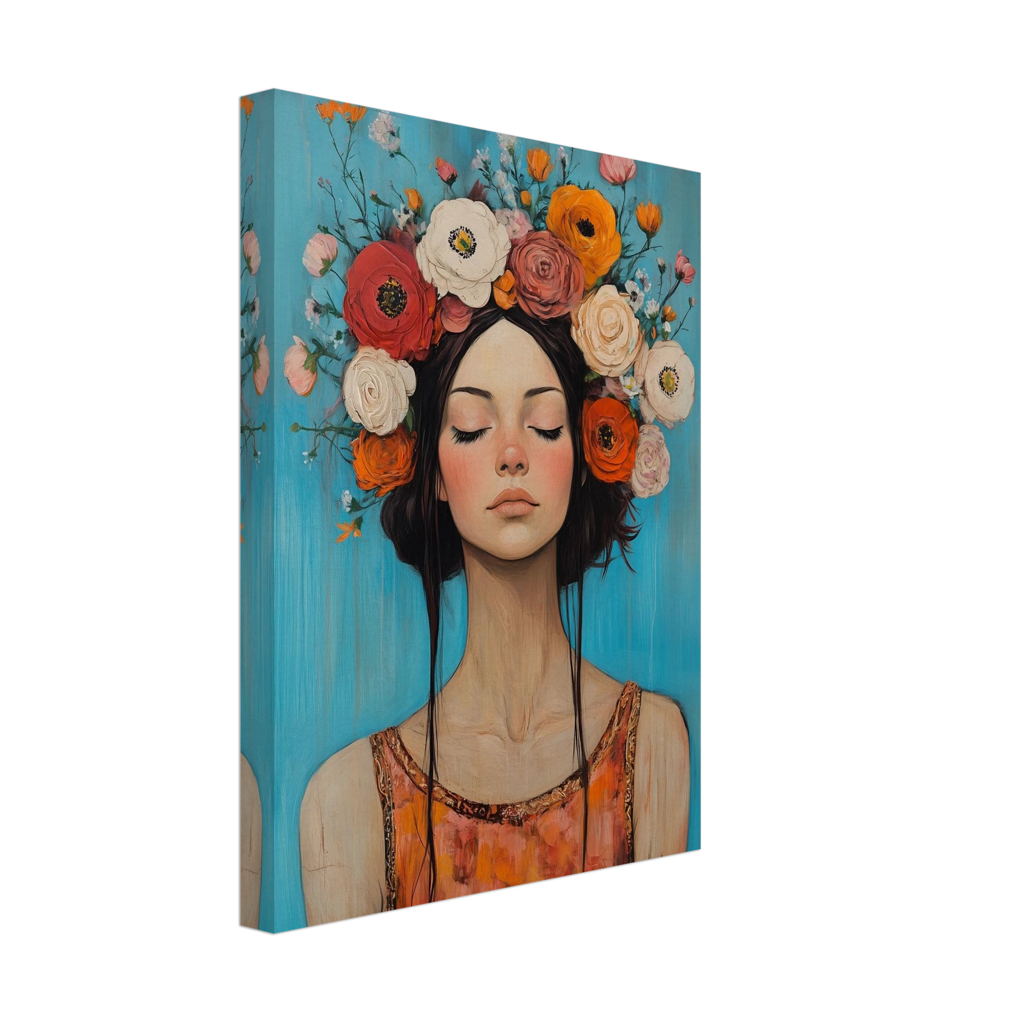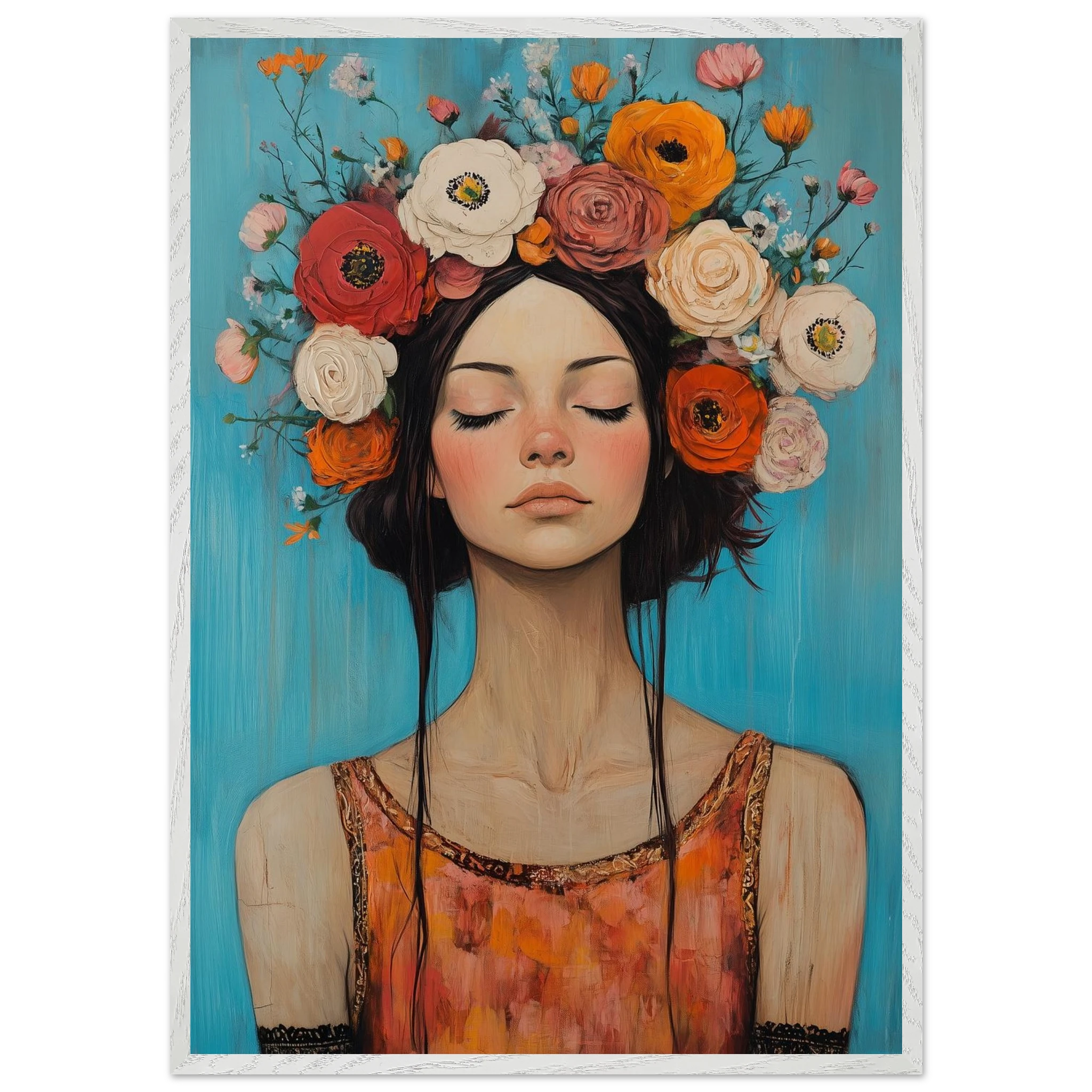 She wears no jewels, only flowers. This portrait channels rooted elegance—strength in softness, silence with depth. A bold yet gentle artwork for interiors that speak in beauty and stillness.