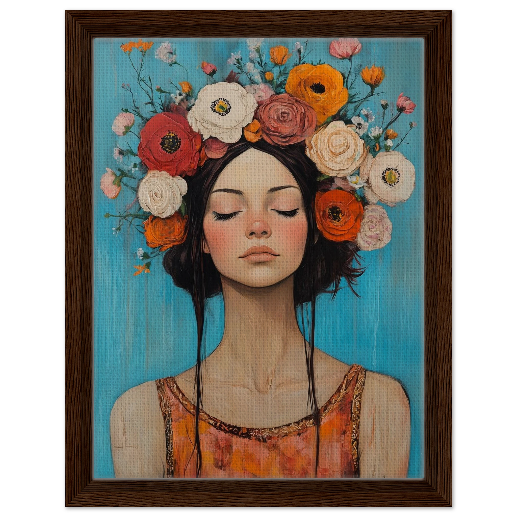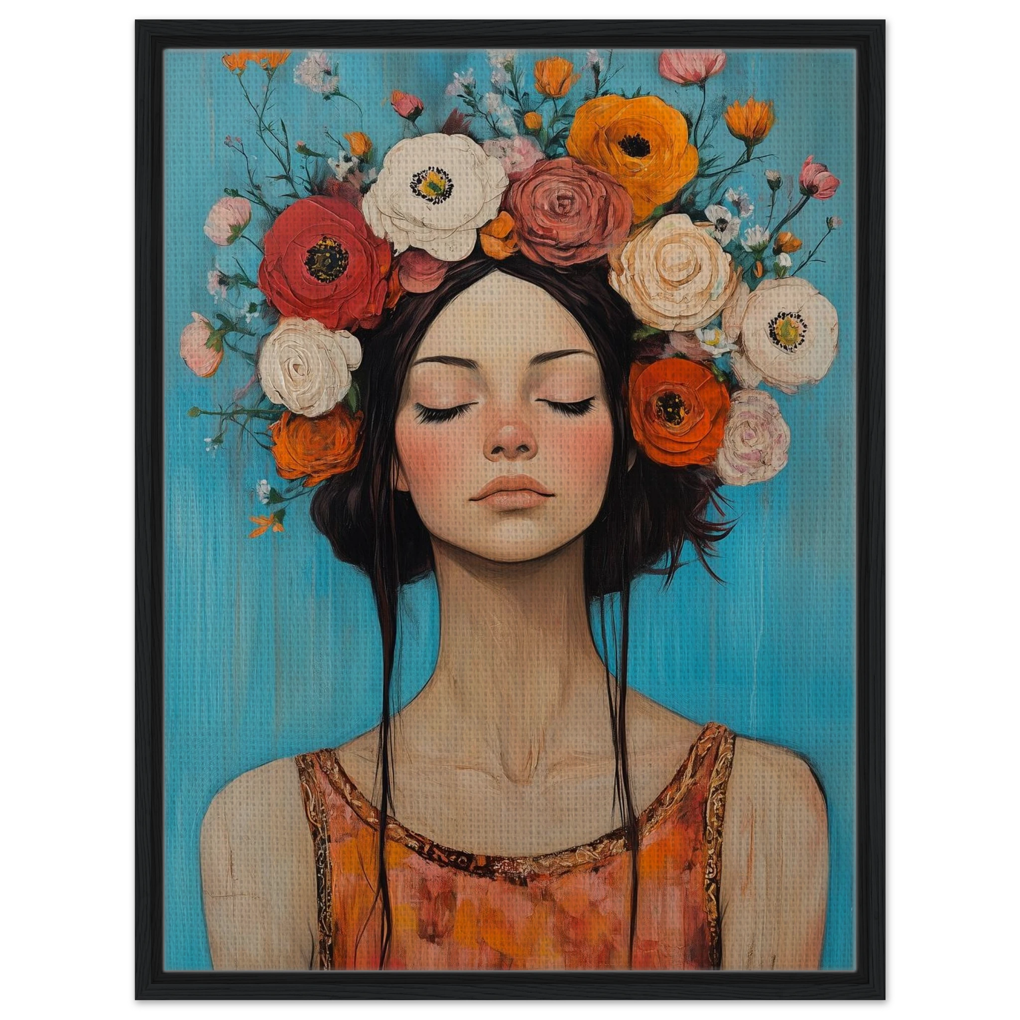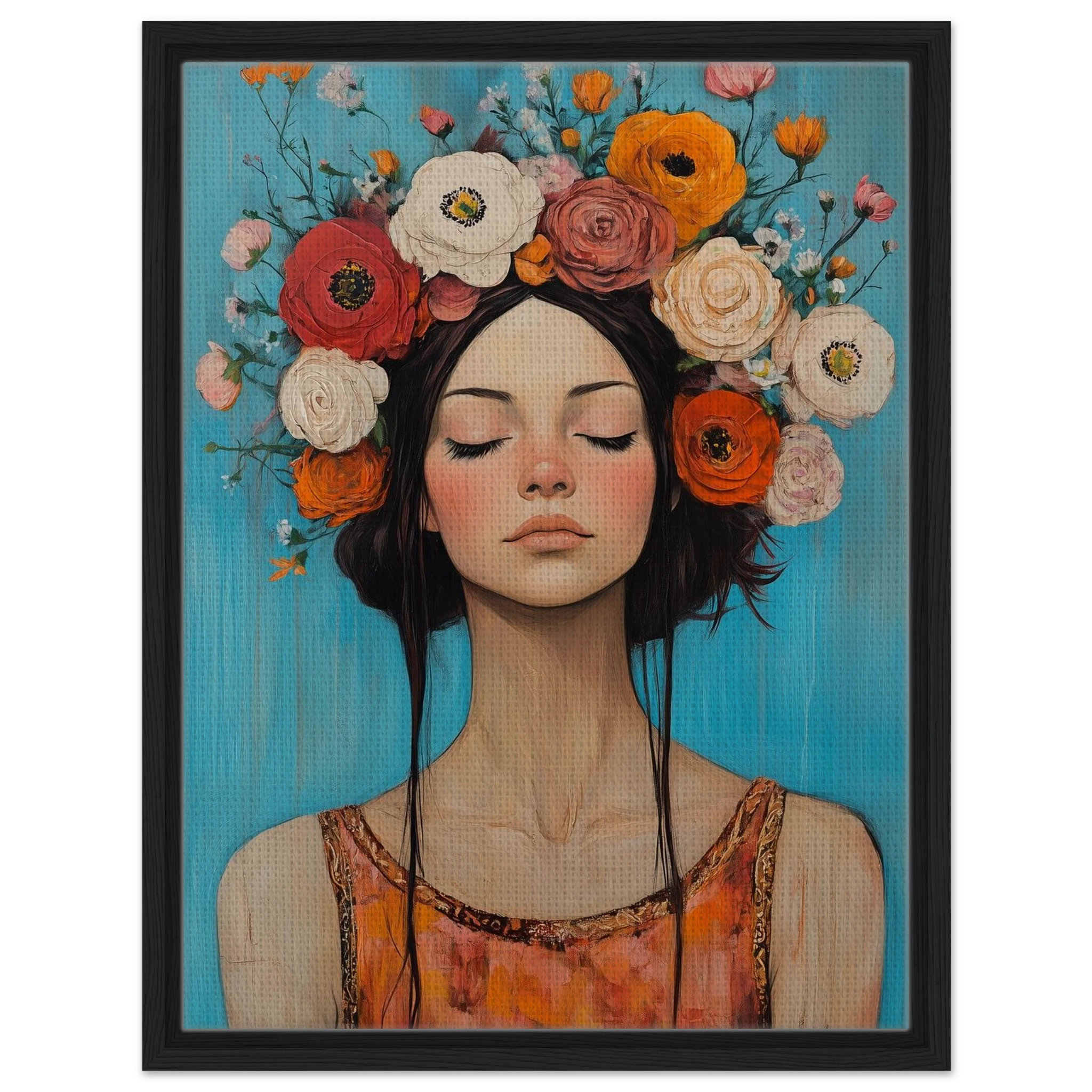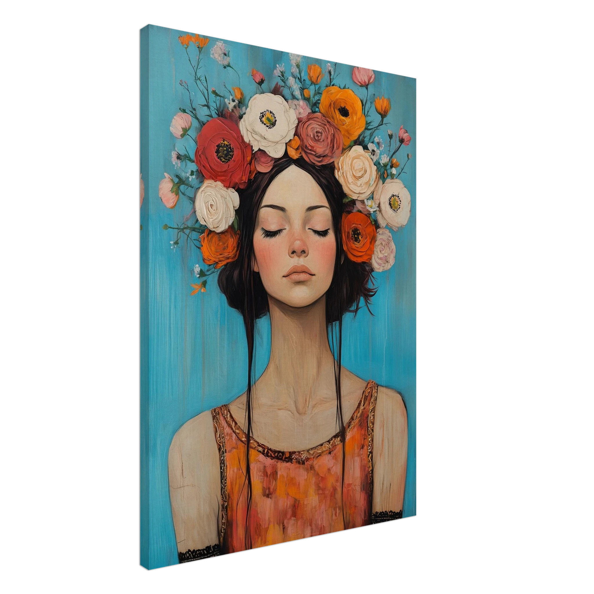 She wears no jewels, only flowers. This portrait channels rooted elegance—strength in softness, silence with depth. A bold yet gentle artwork for interiors that speak in beauty and stillness.
