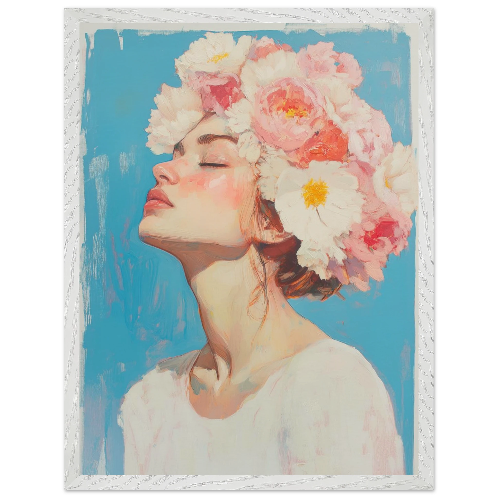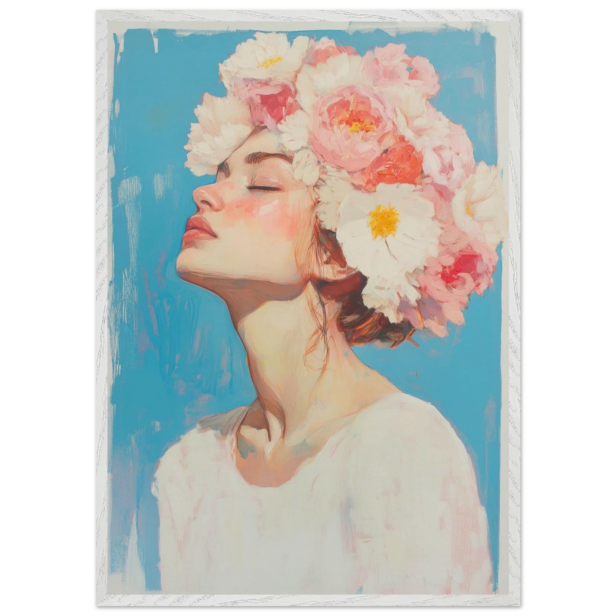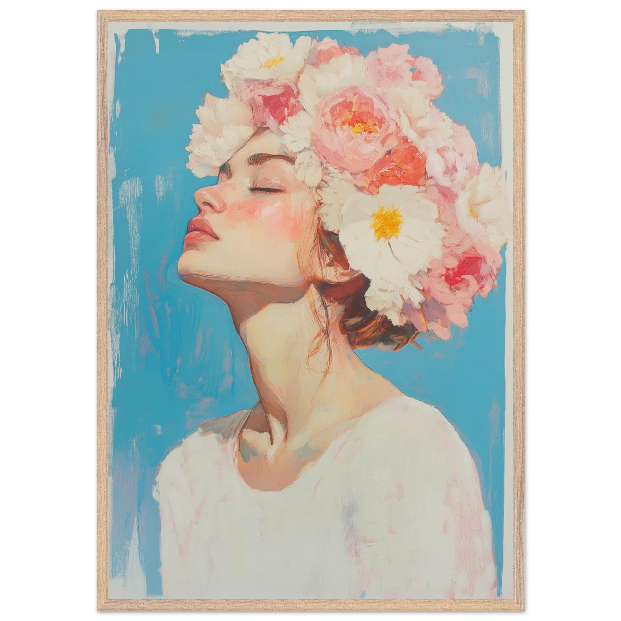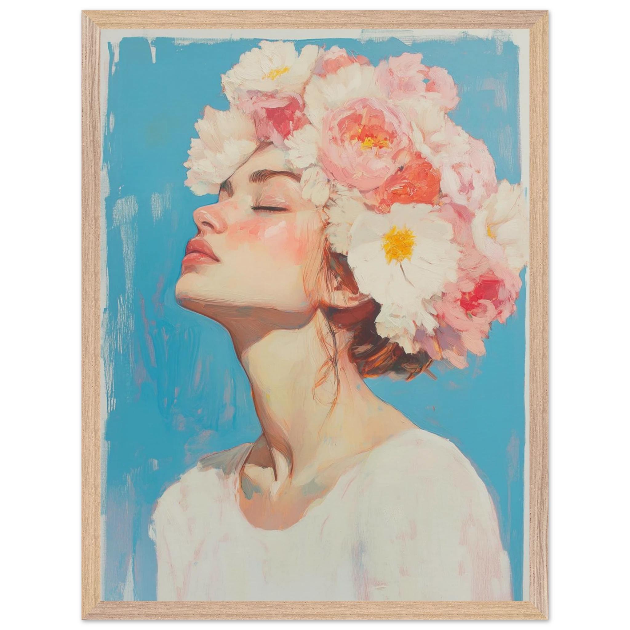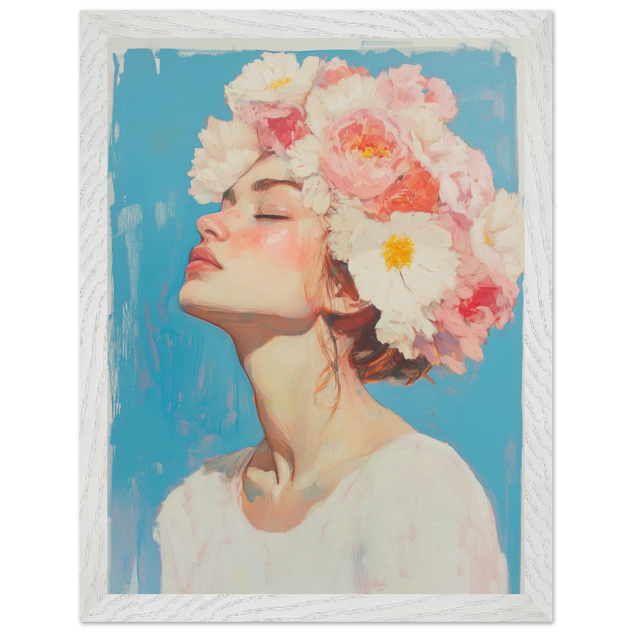 Head tilted to the sky, crowned in blush petals, she becomes the definition of radiant stillness. This piece feels like a sigh, a prayer, and a blooming all at once.