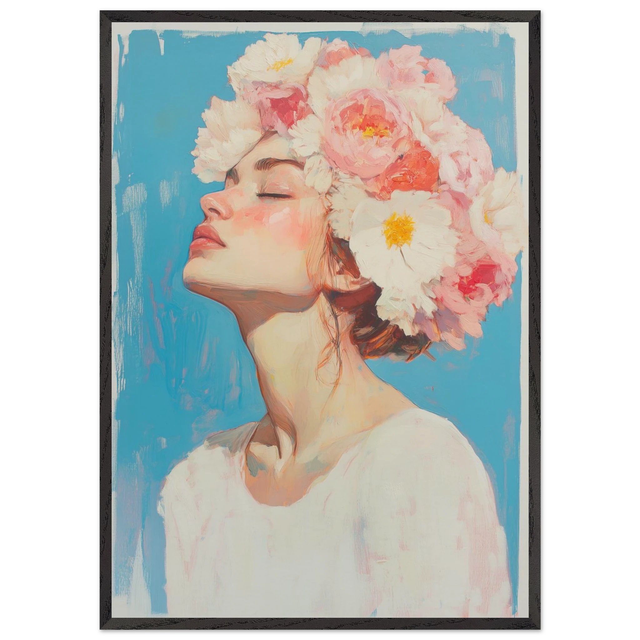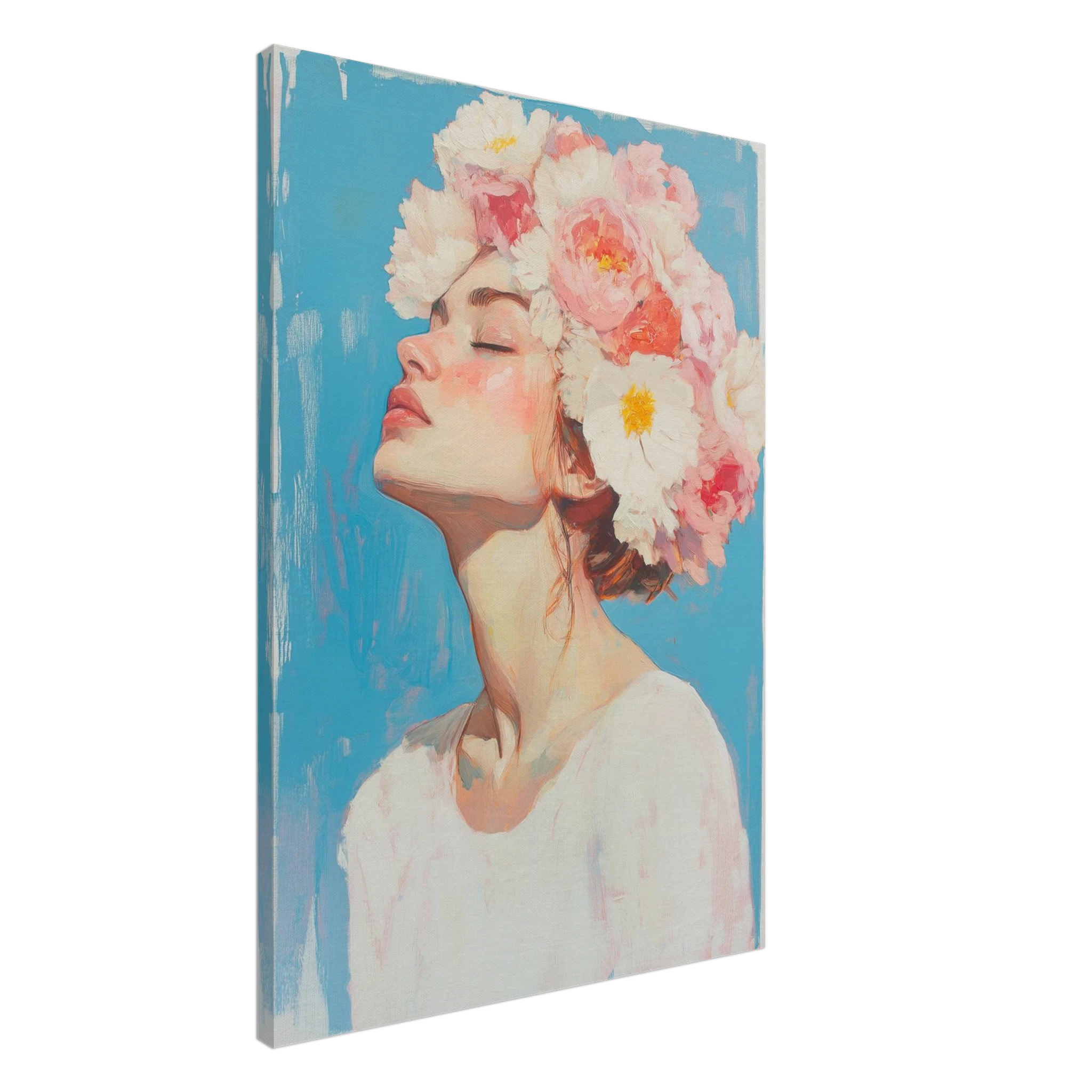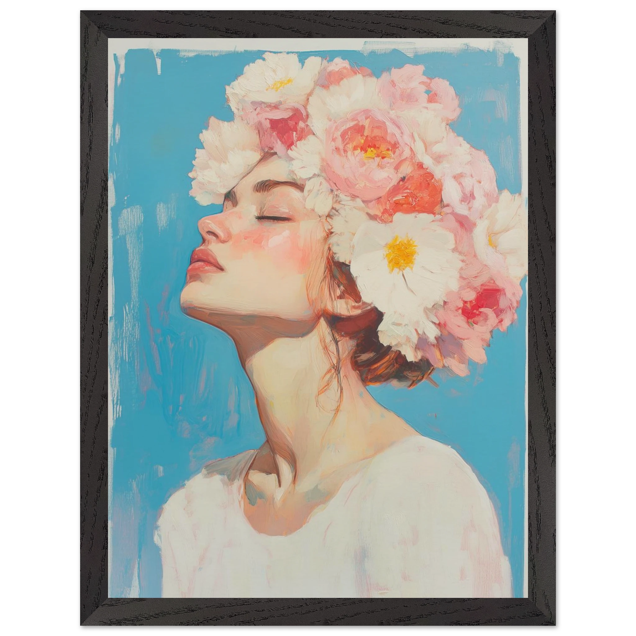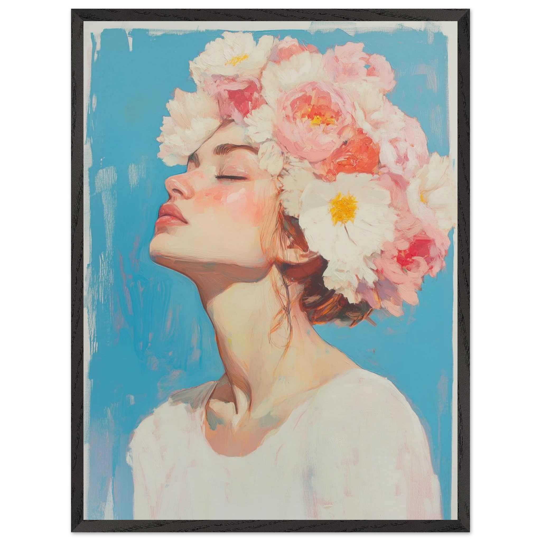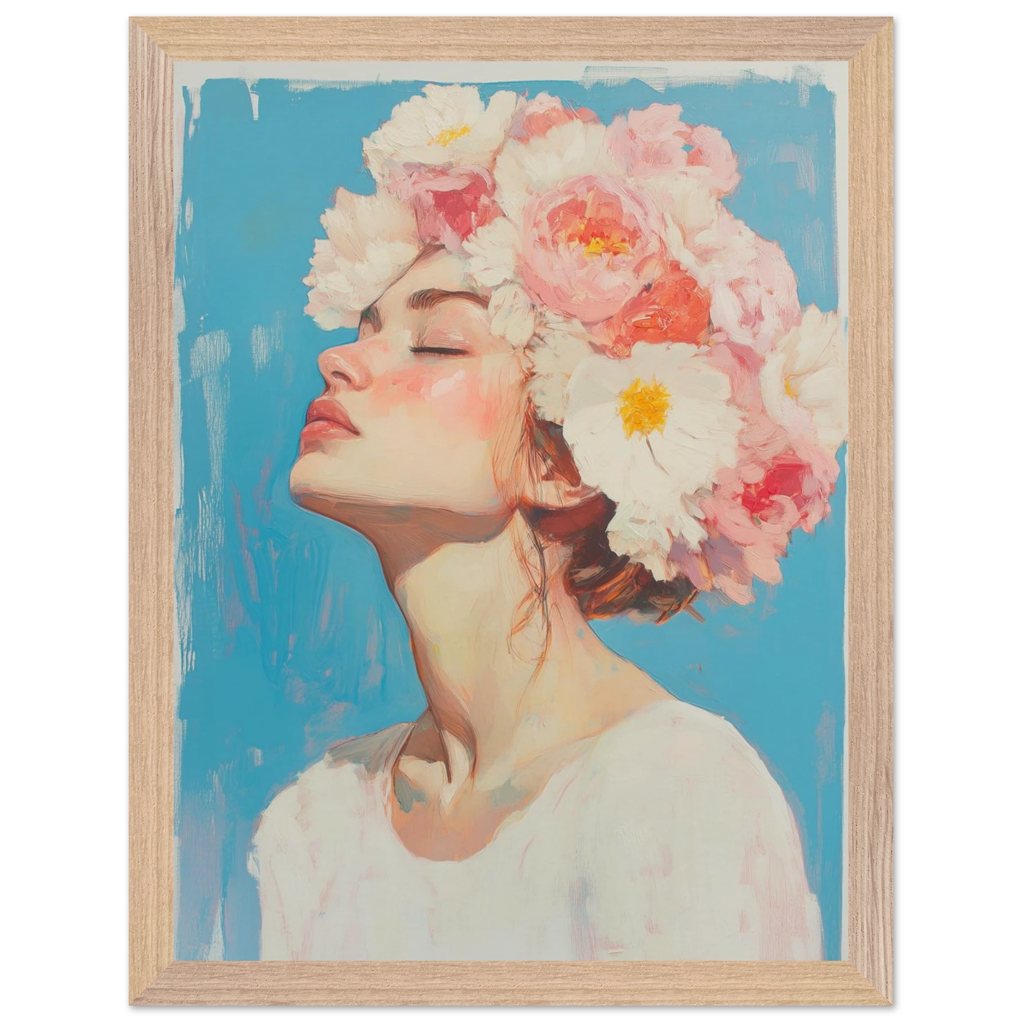 Head tilted to the sky, crowned in blush petals, she becomes the definition of radiant stillness. This piece feels like a sigh, a prayer, and a blooming all at once.