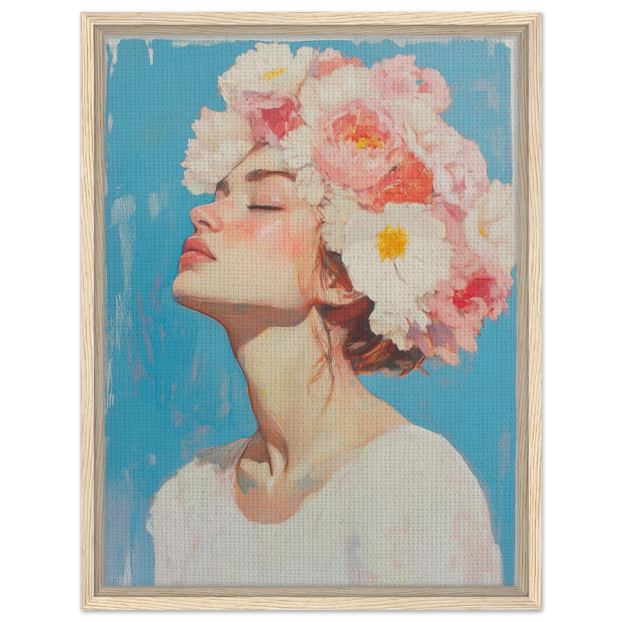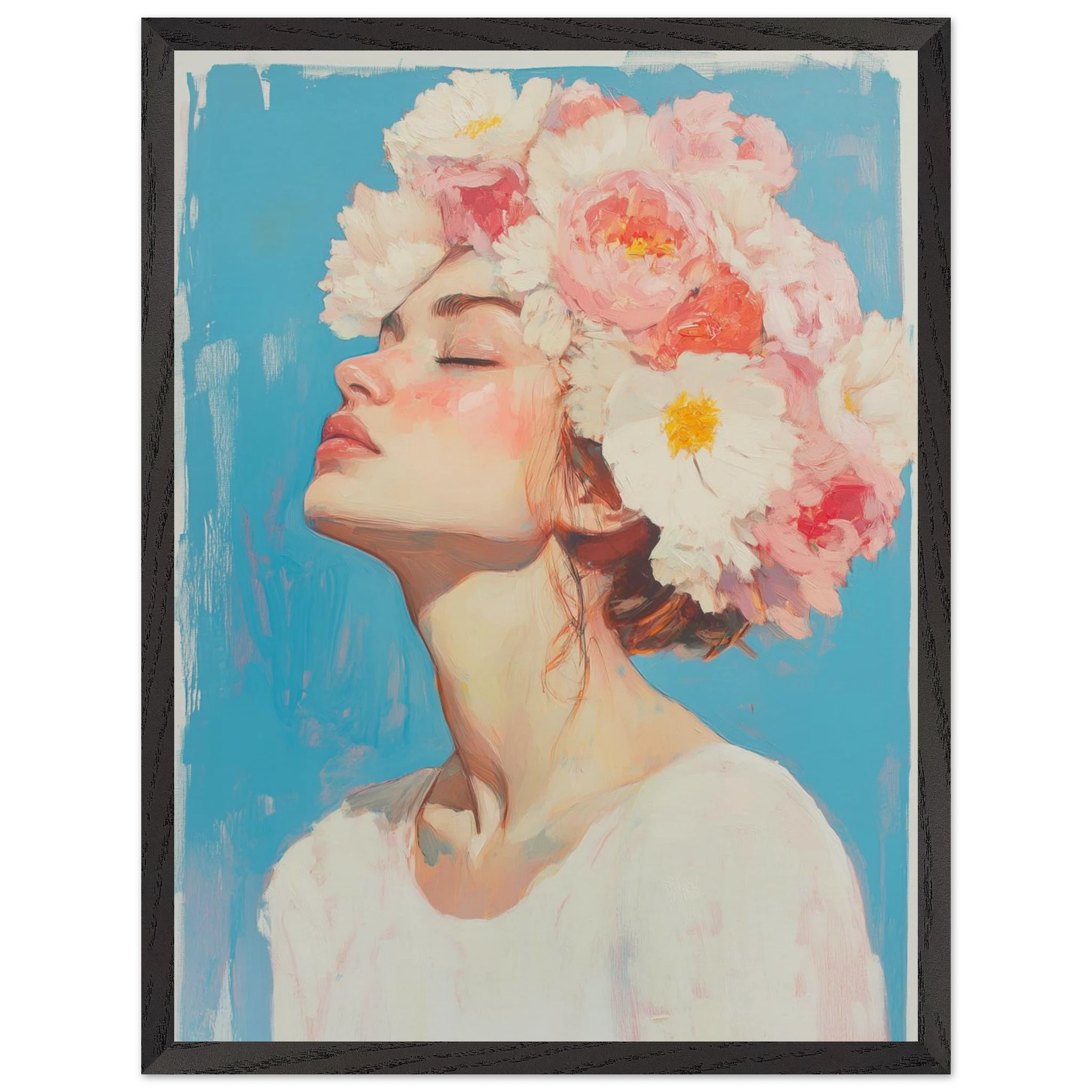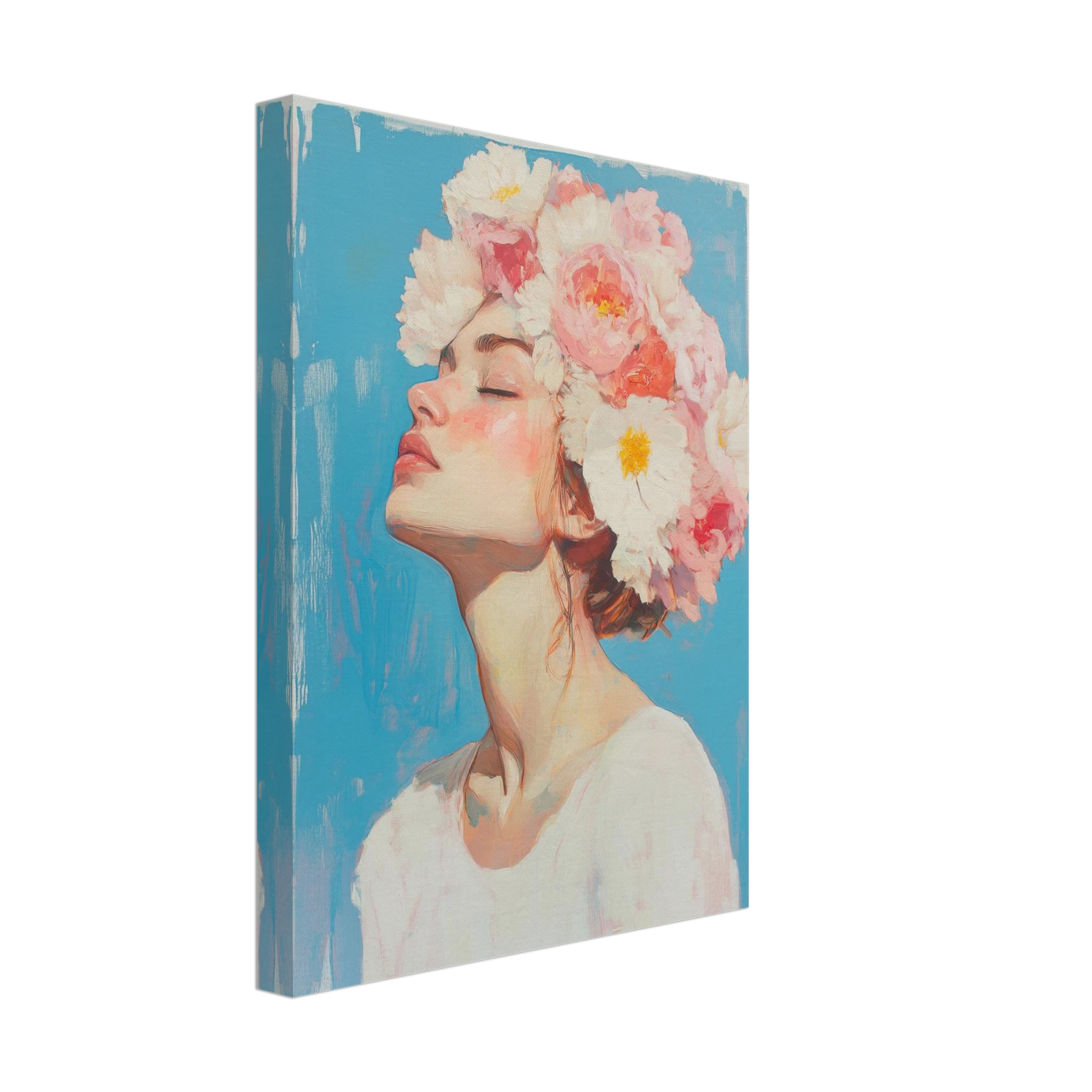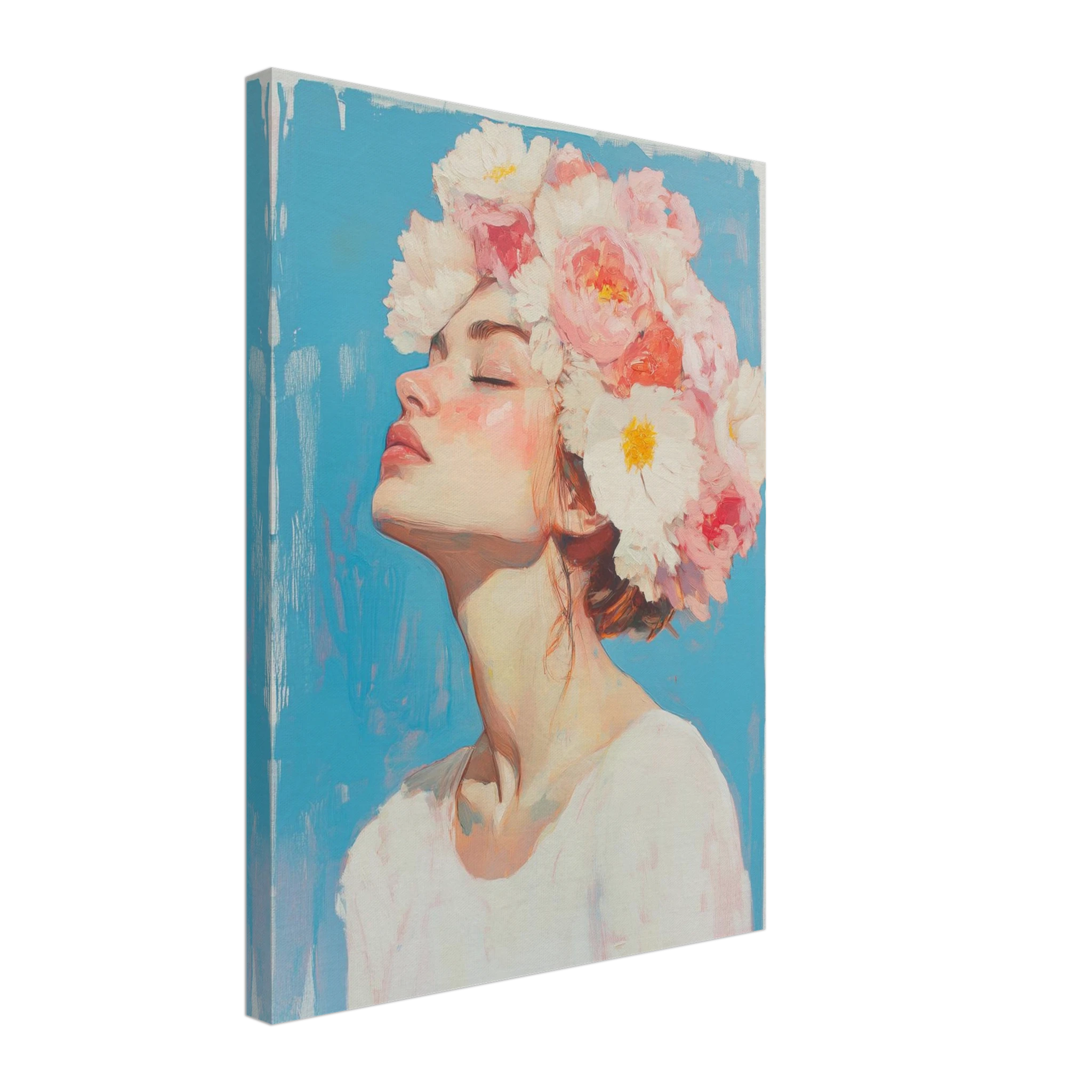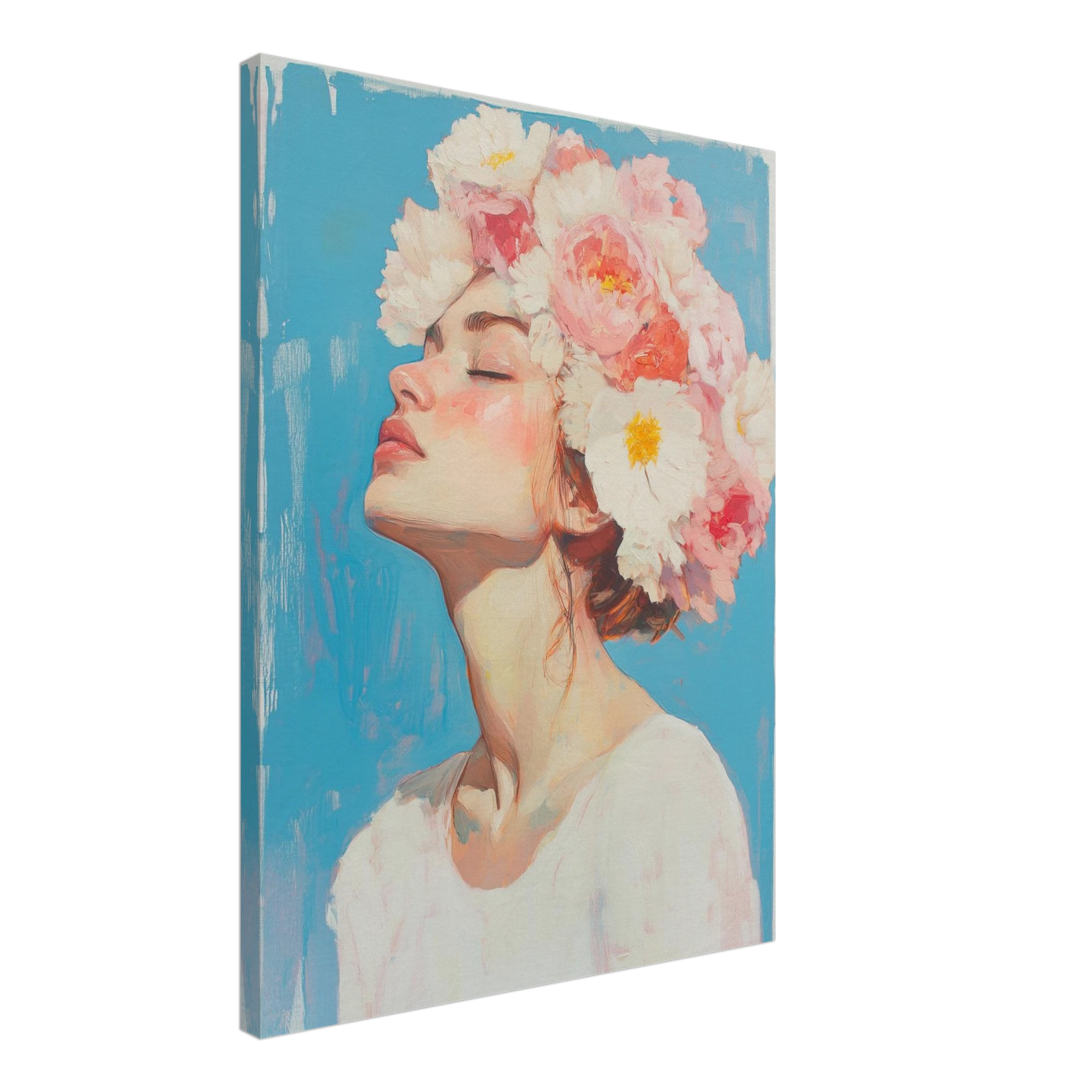 Head tilted to the sky, crowned in blush petals, she becomes the definition of radiant stillness. This piece feels like a sigh, a prayer, and a blooming all at once.