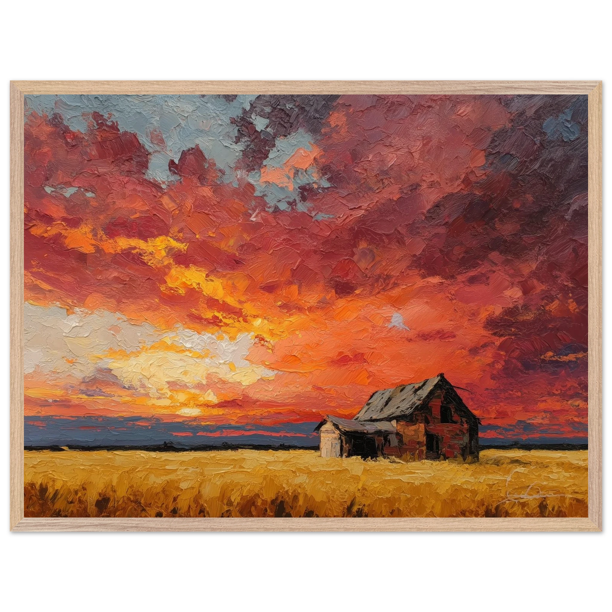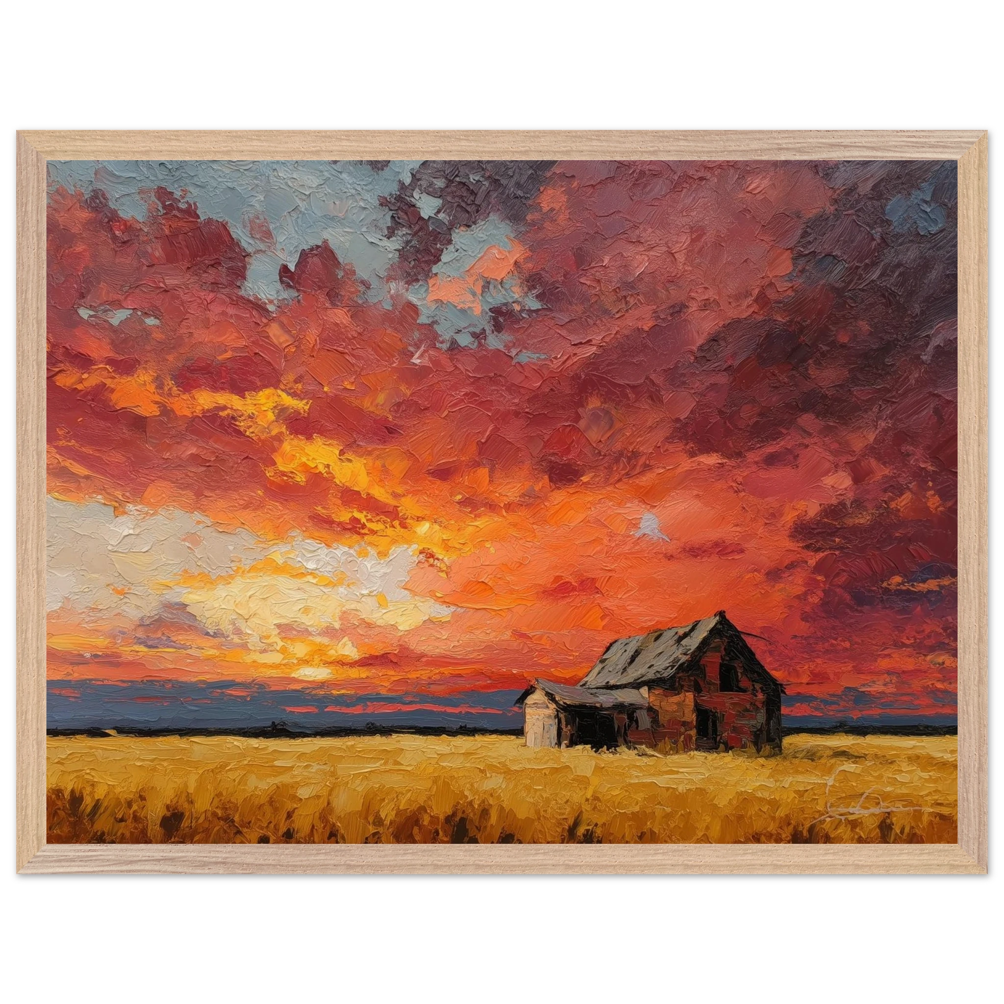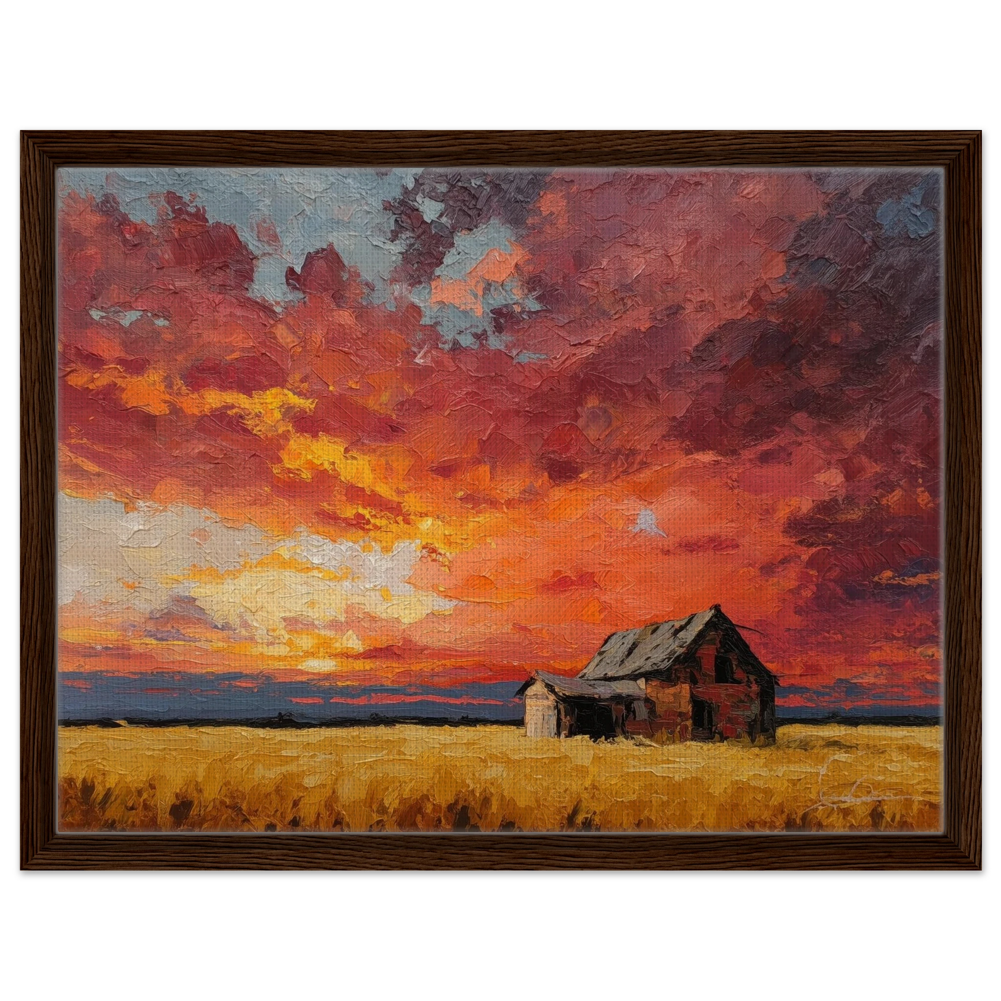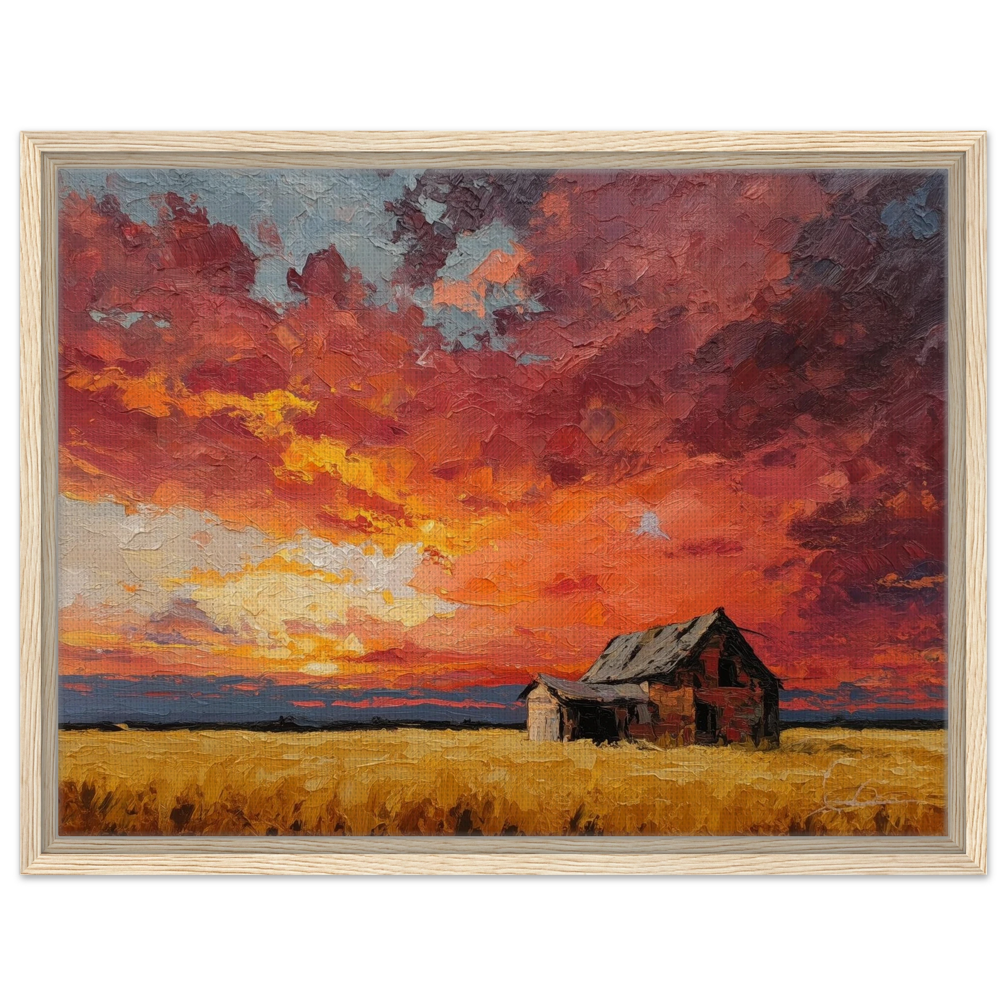 Nestled in golden fields, the barn watches the sun fall like wheat from the heavens — warm, abundant, final.