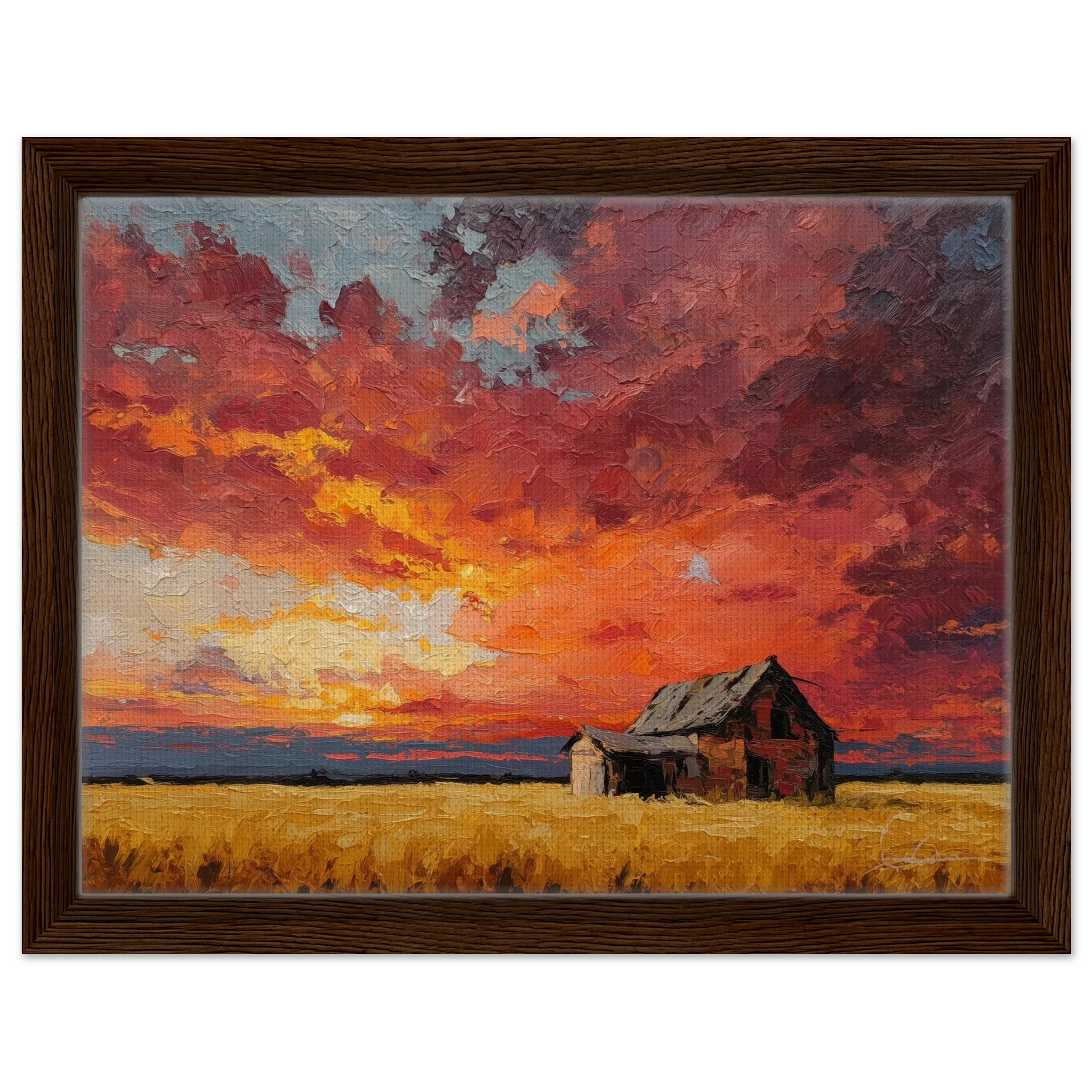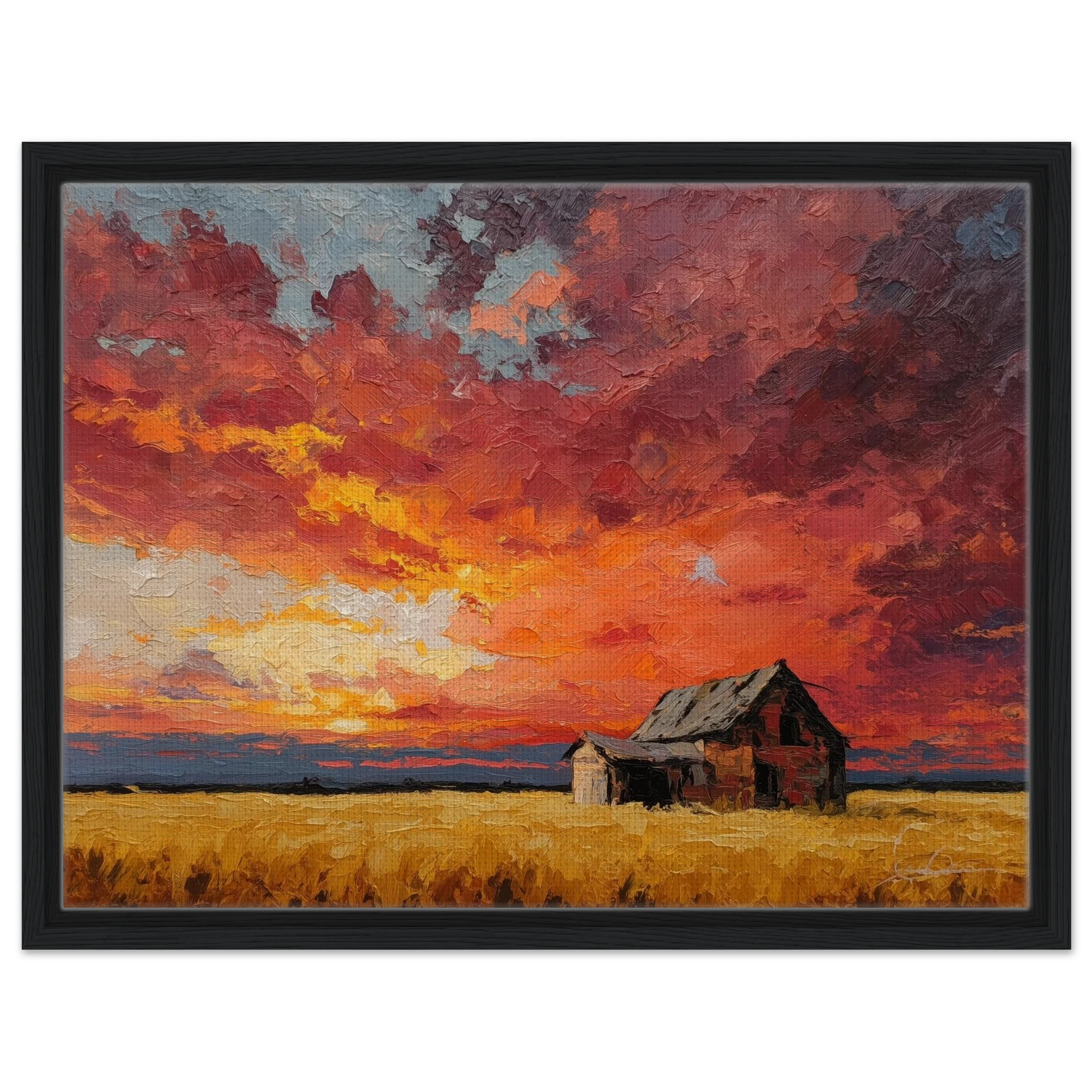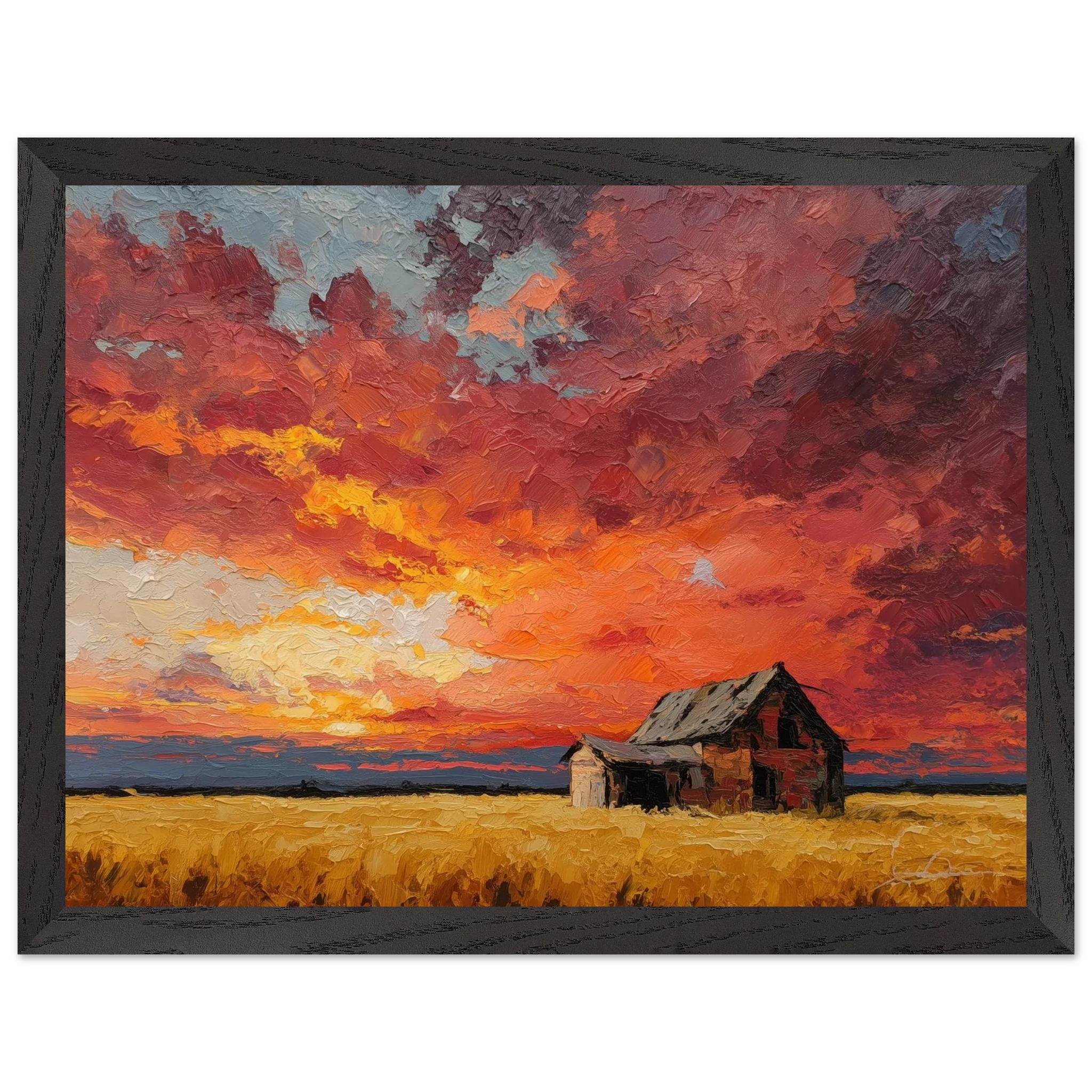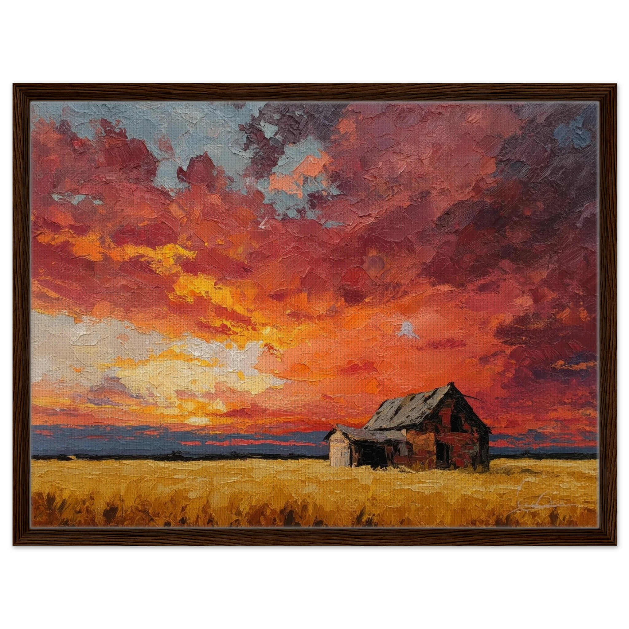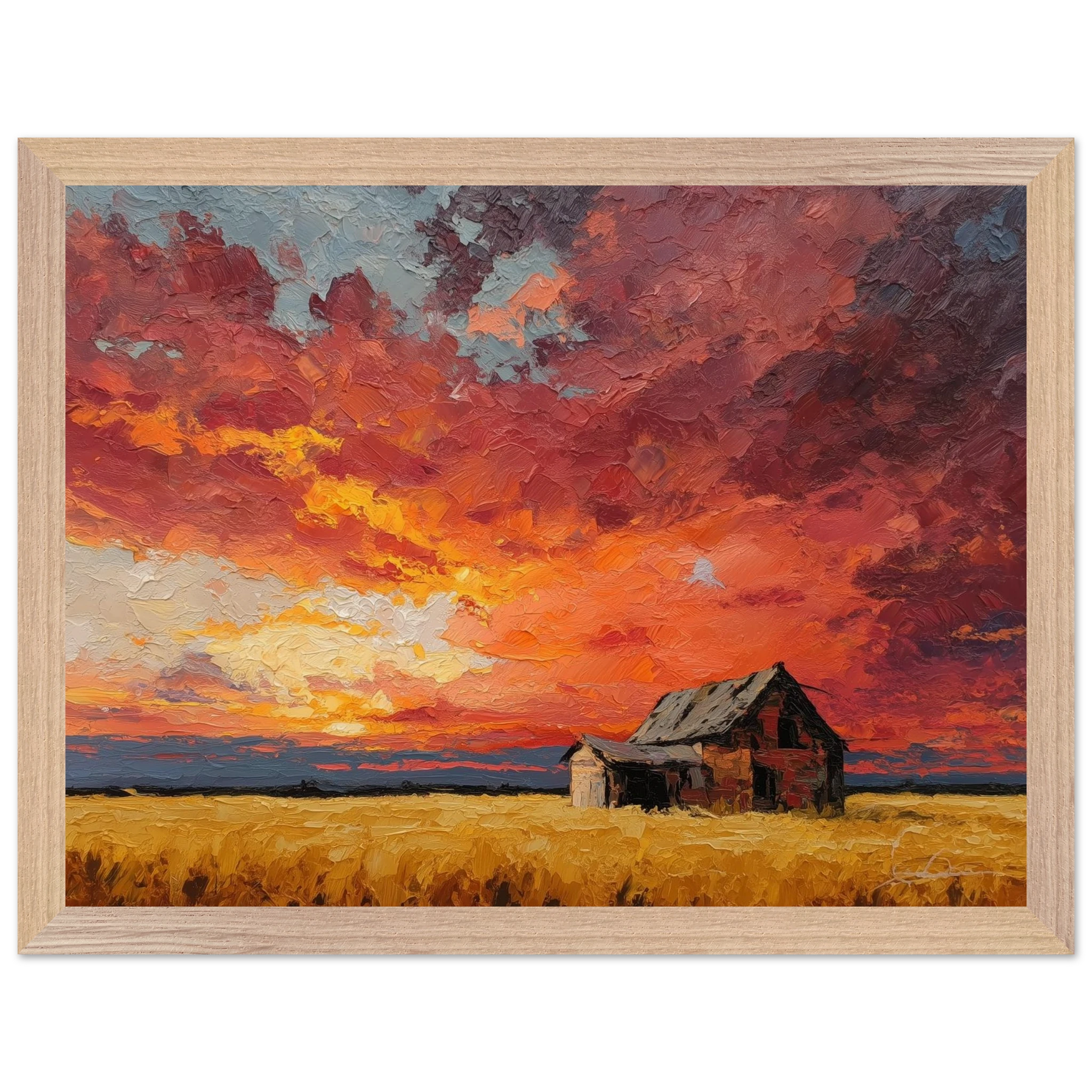 Nestled in golden fields, the barn watches the sun fall like wheat from the heavens — warm, abundant, final.
