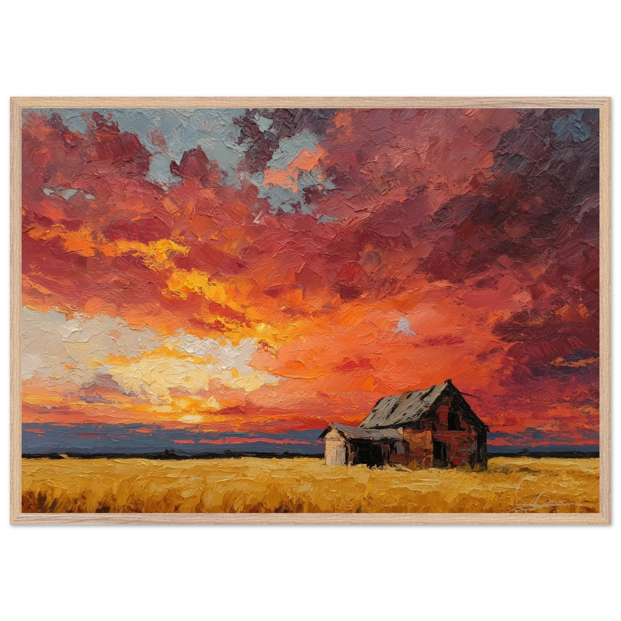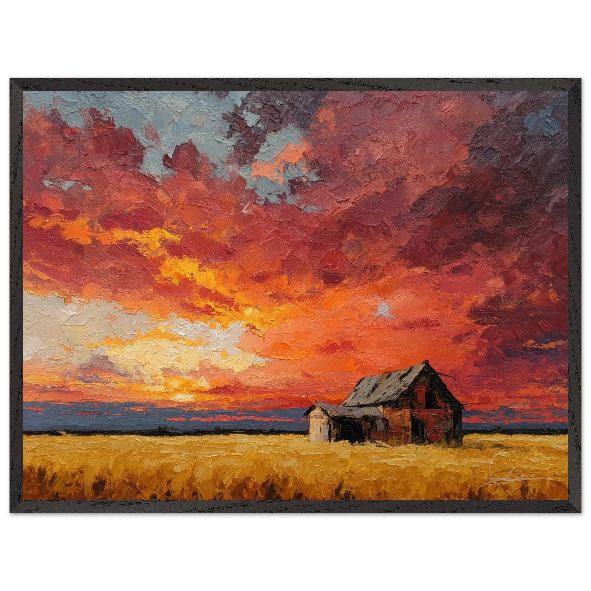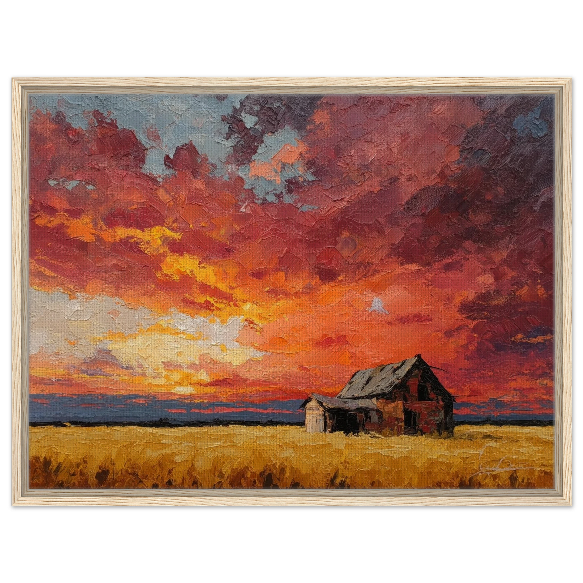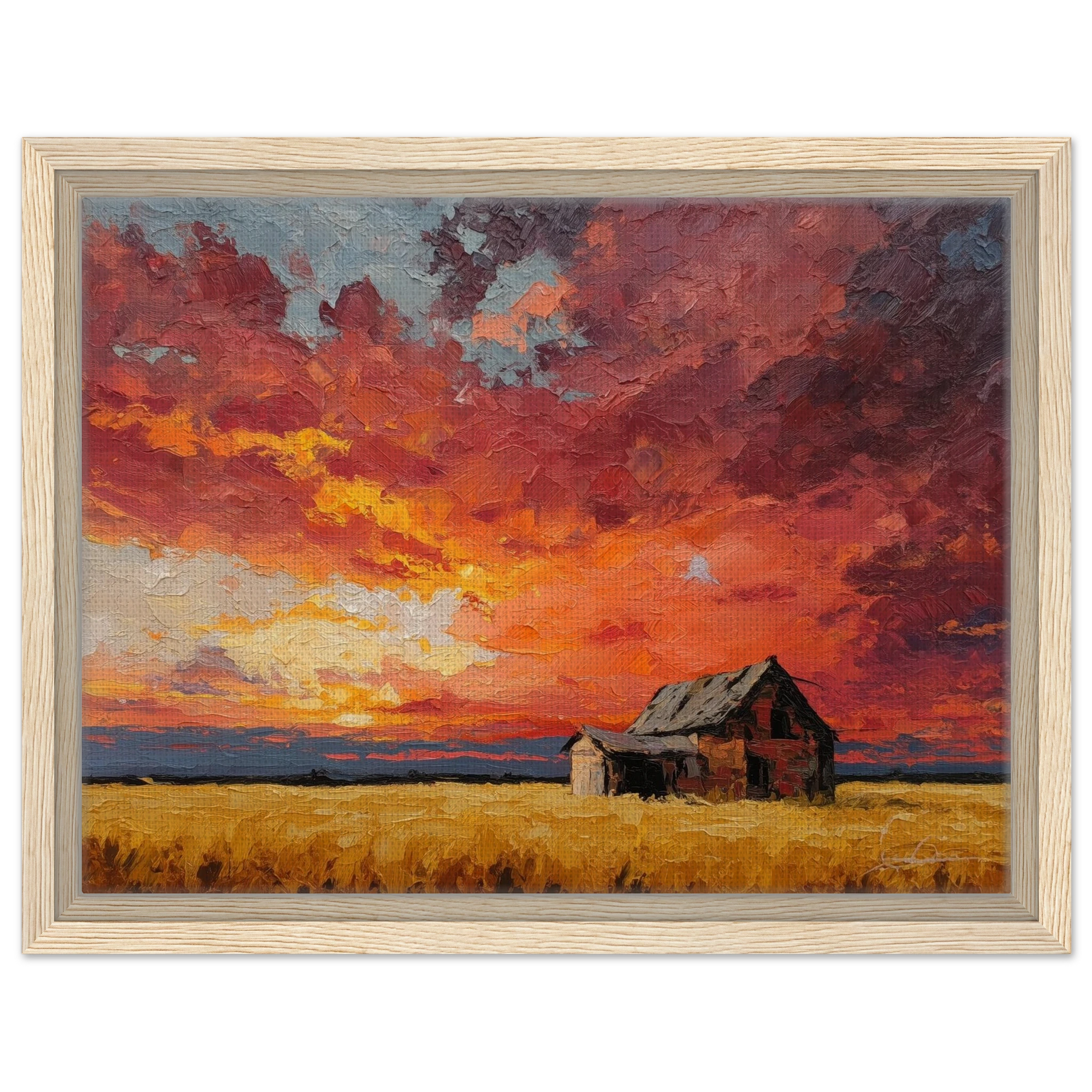 Nestled in golden fields, the barn watches the sun fall like wheat from the heavens — warm, abundant, final.