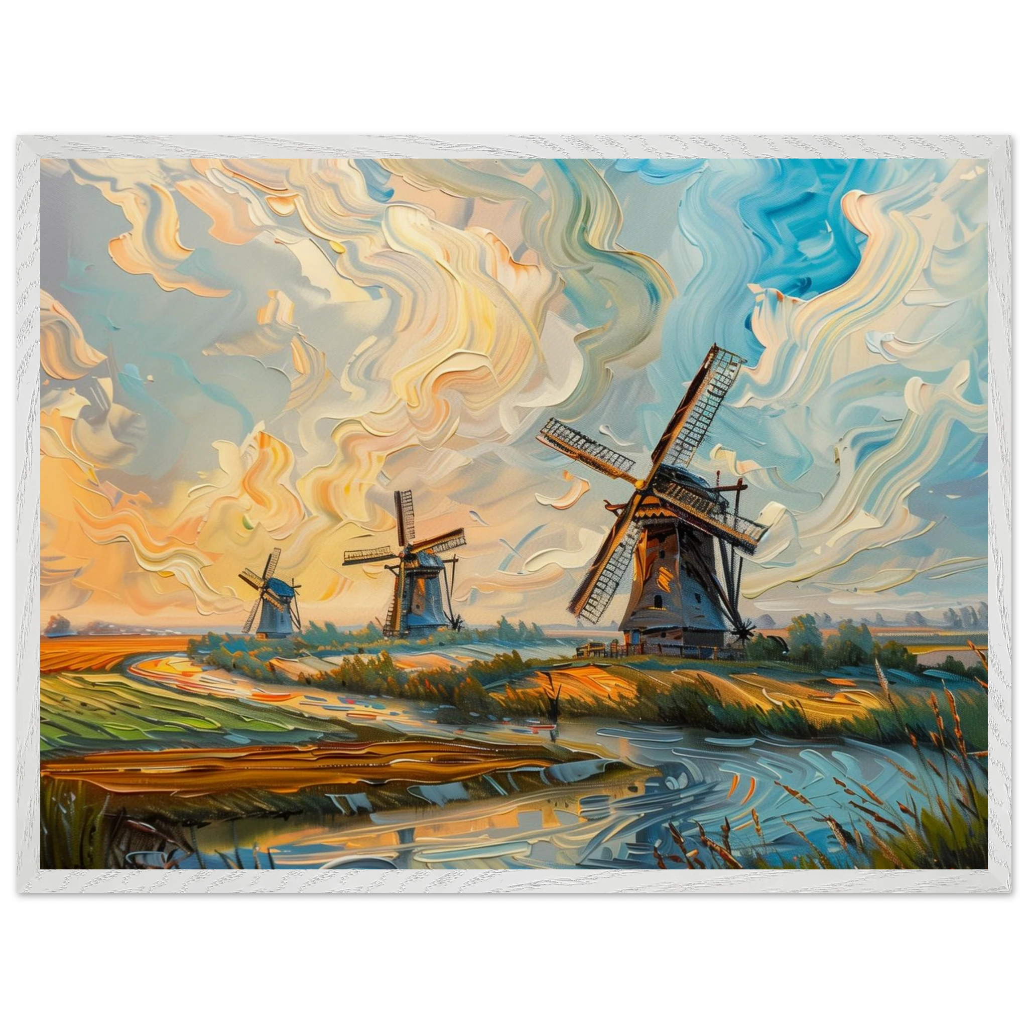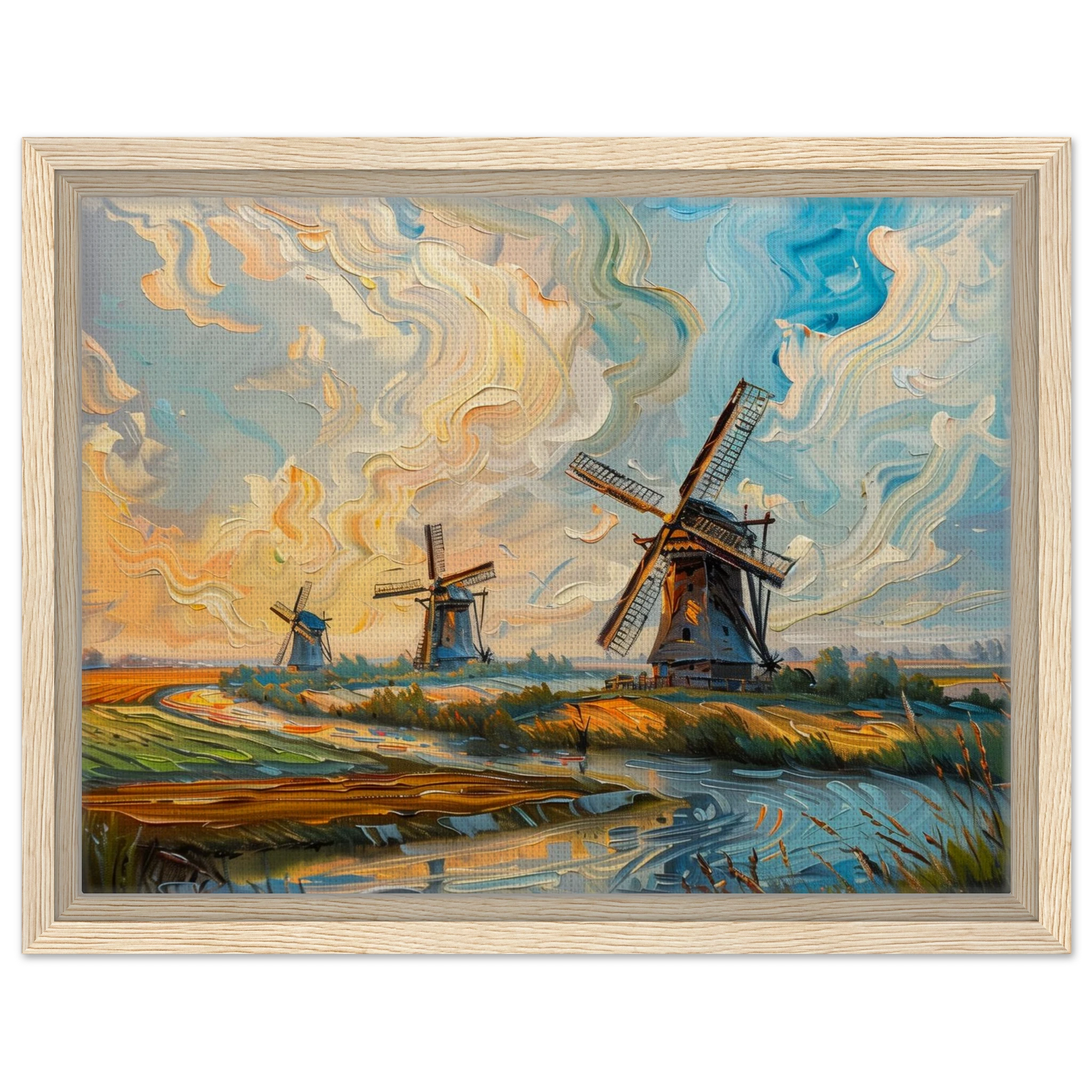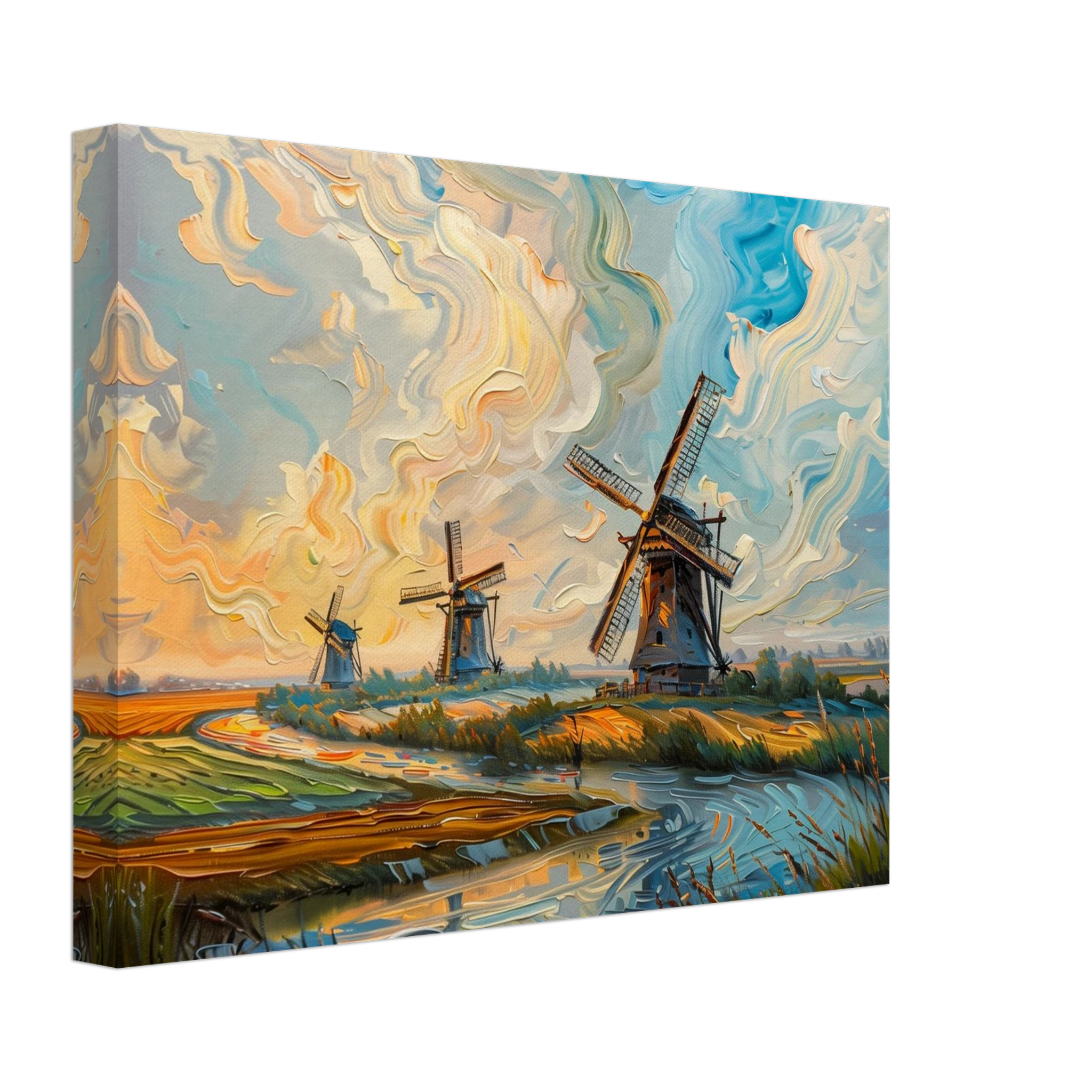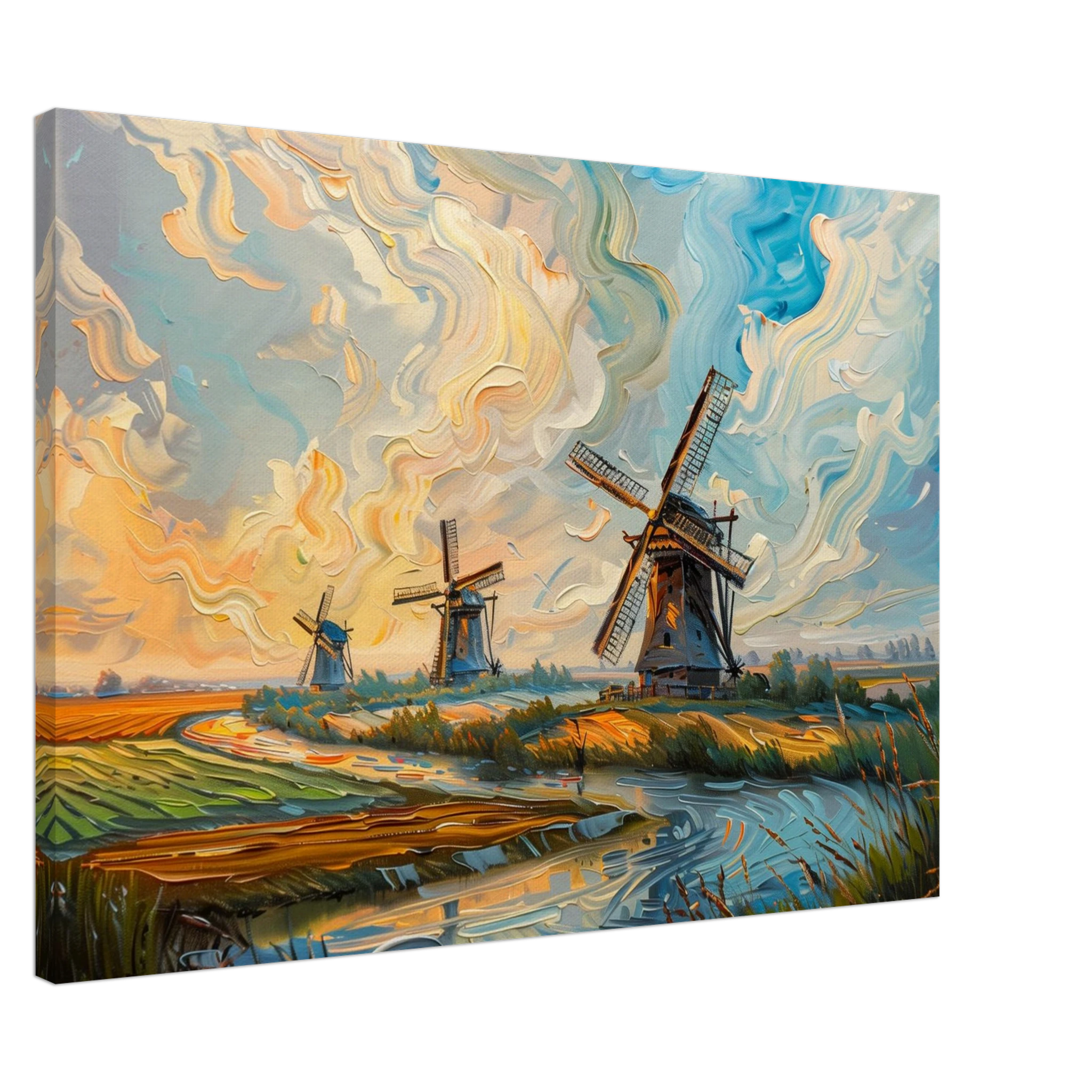 Every brushstroke is alive with motion — the sky stirs, the grass sways, and the windmills turn like old souls still singing.