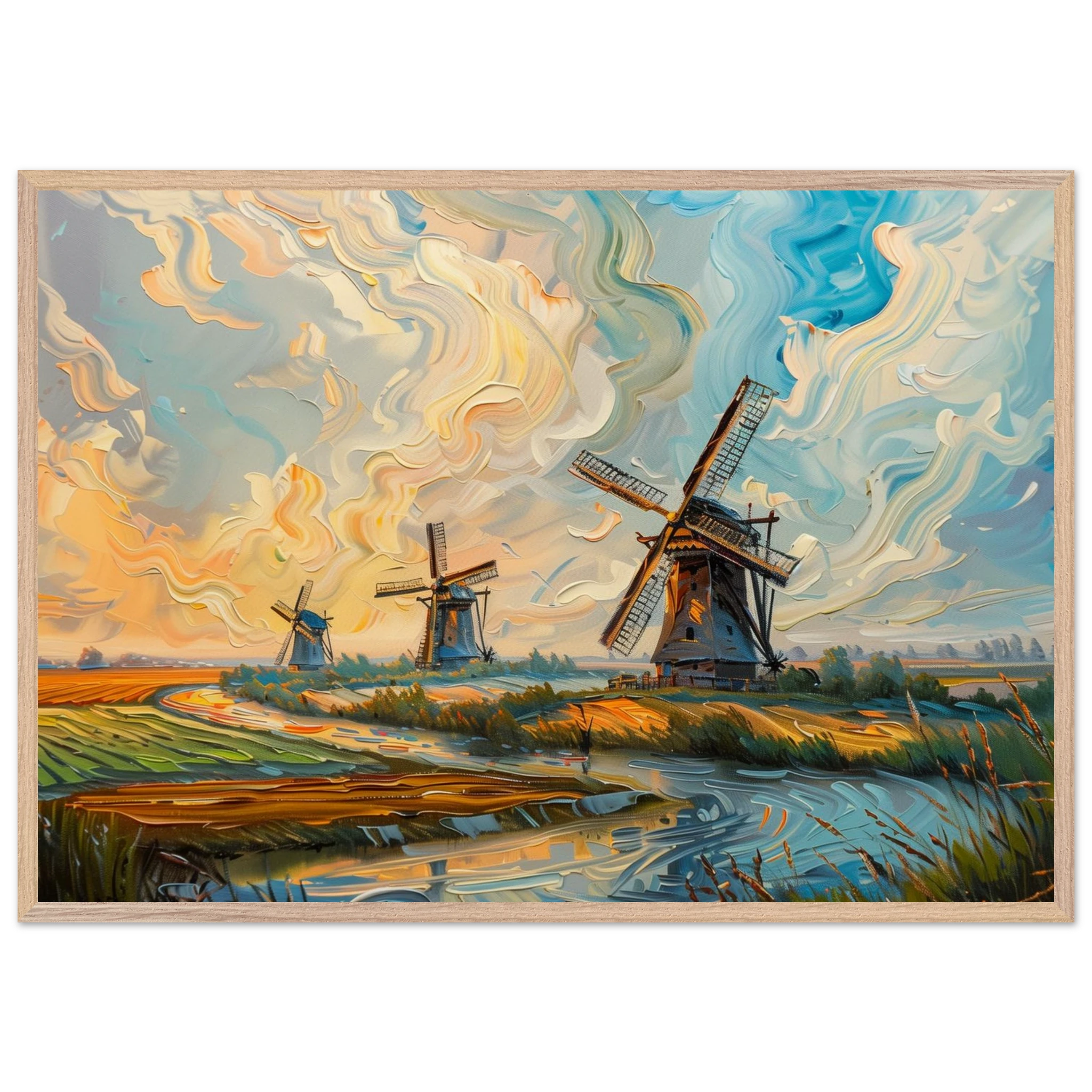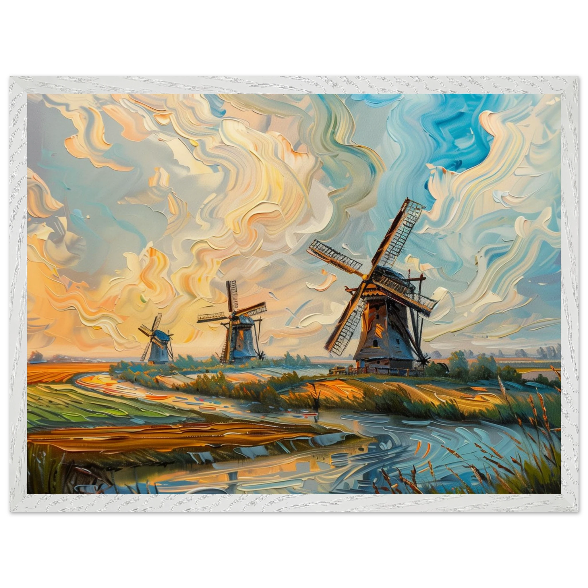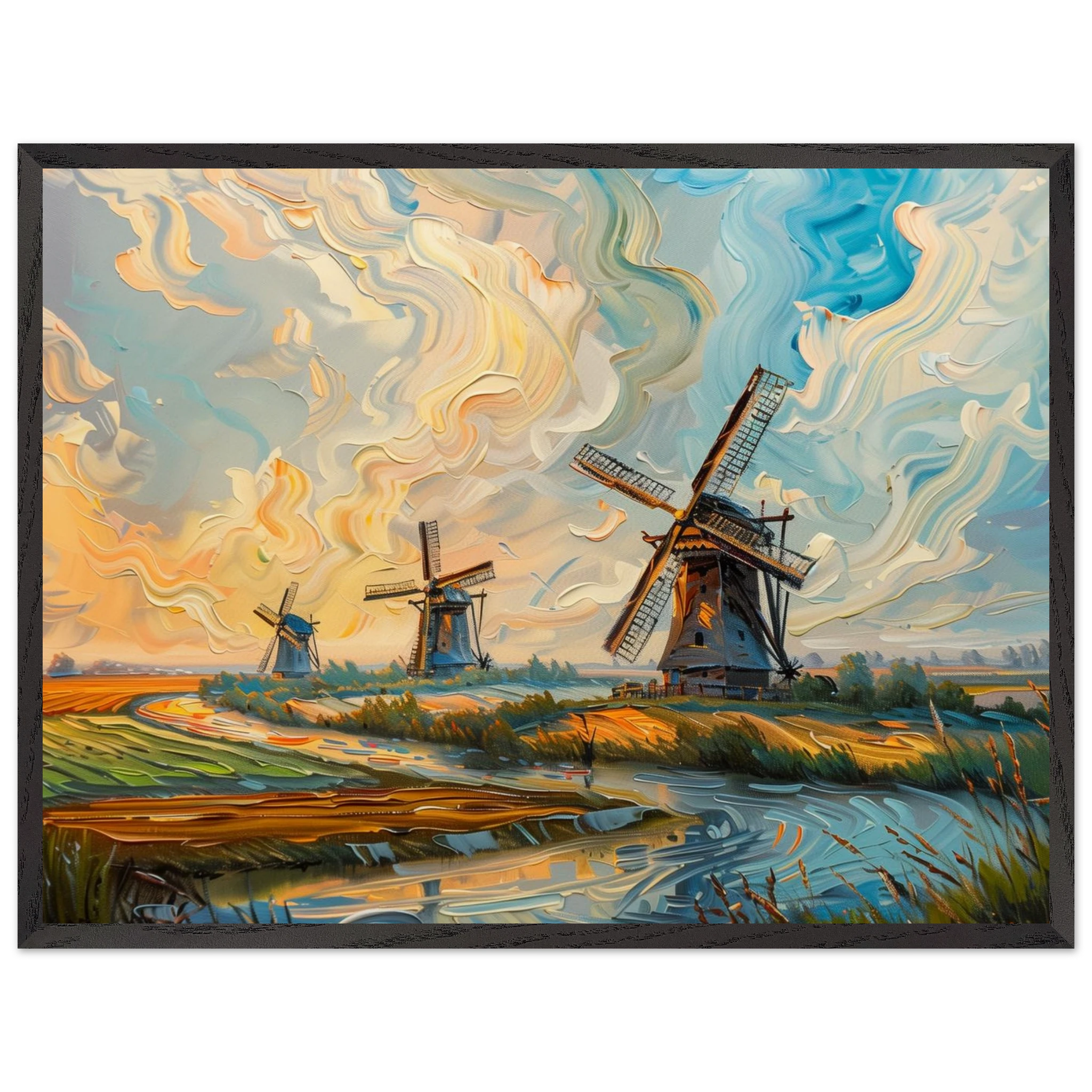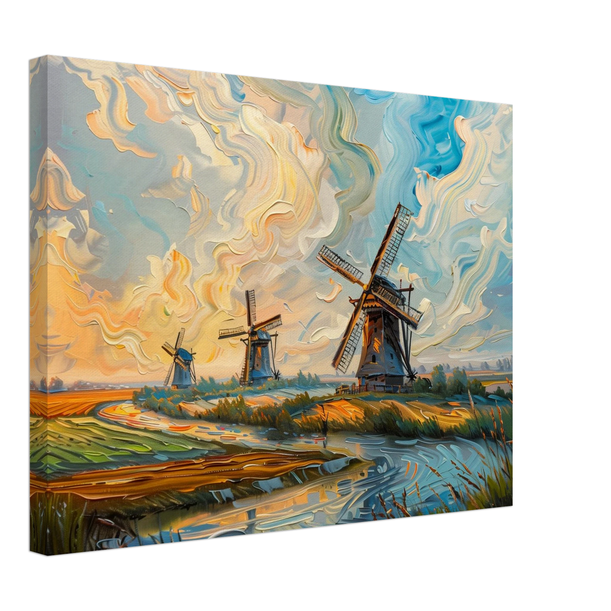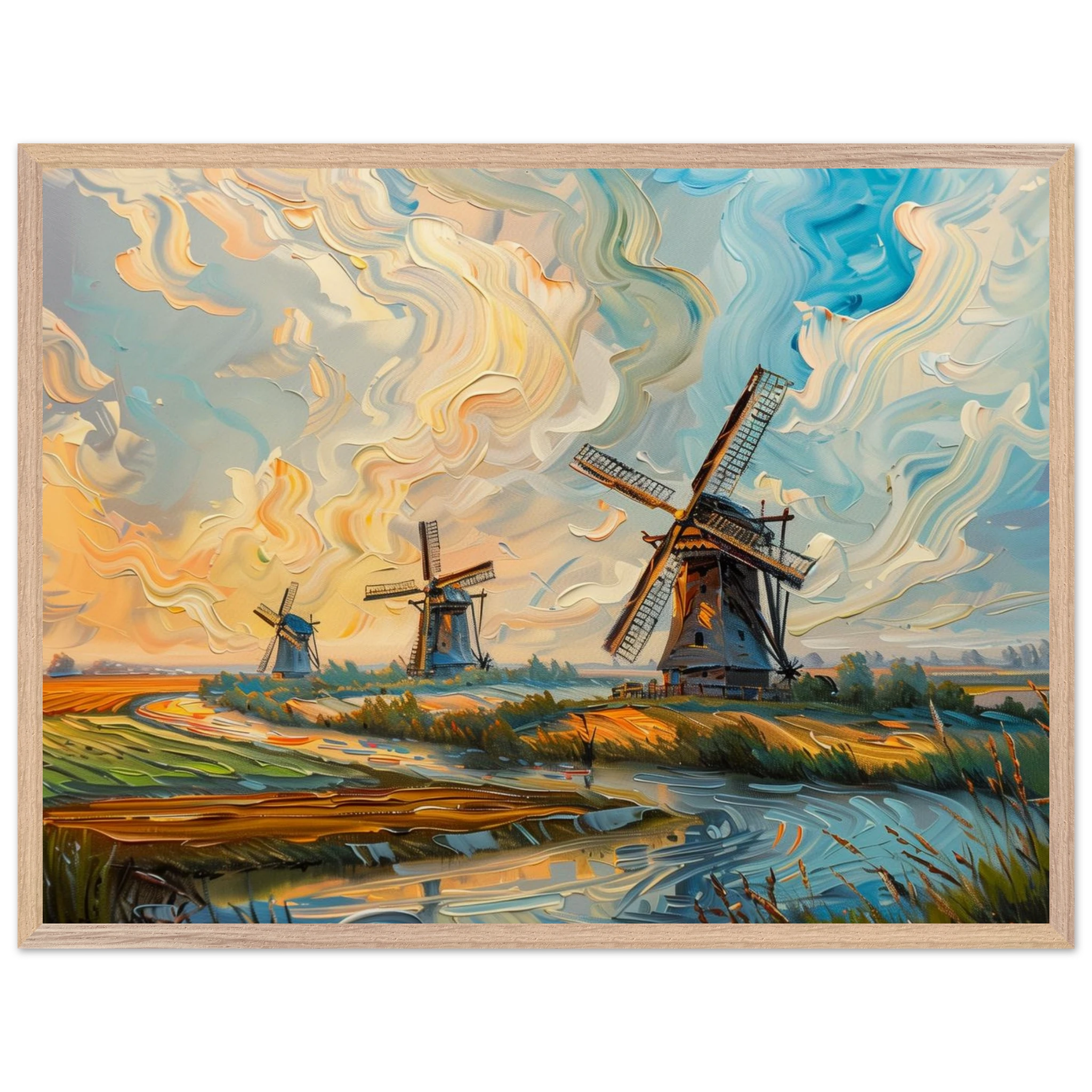 Every brushstroke is alive with motion — the sky stirs, the grass sways, and the windmills turn like old souls still singing.
