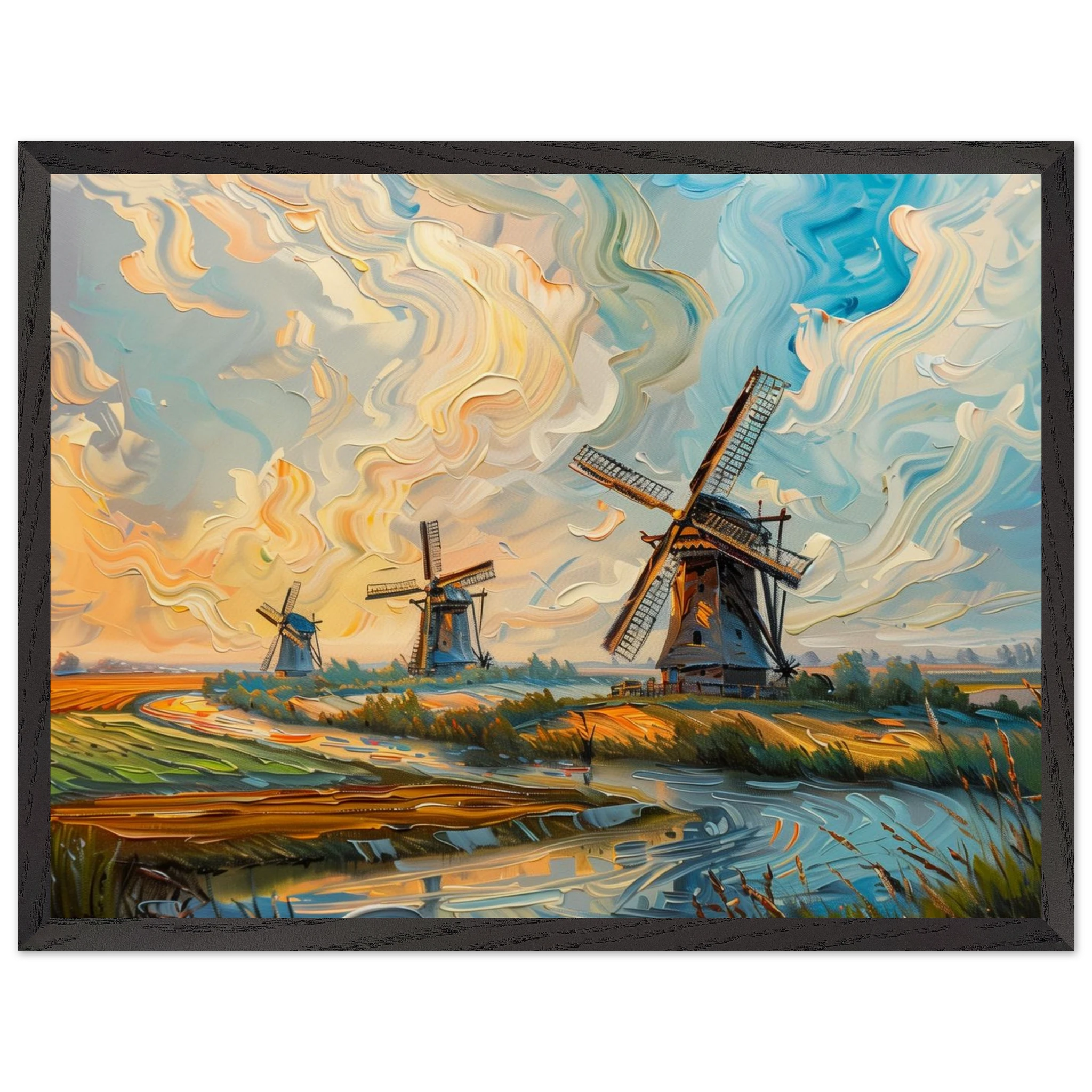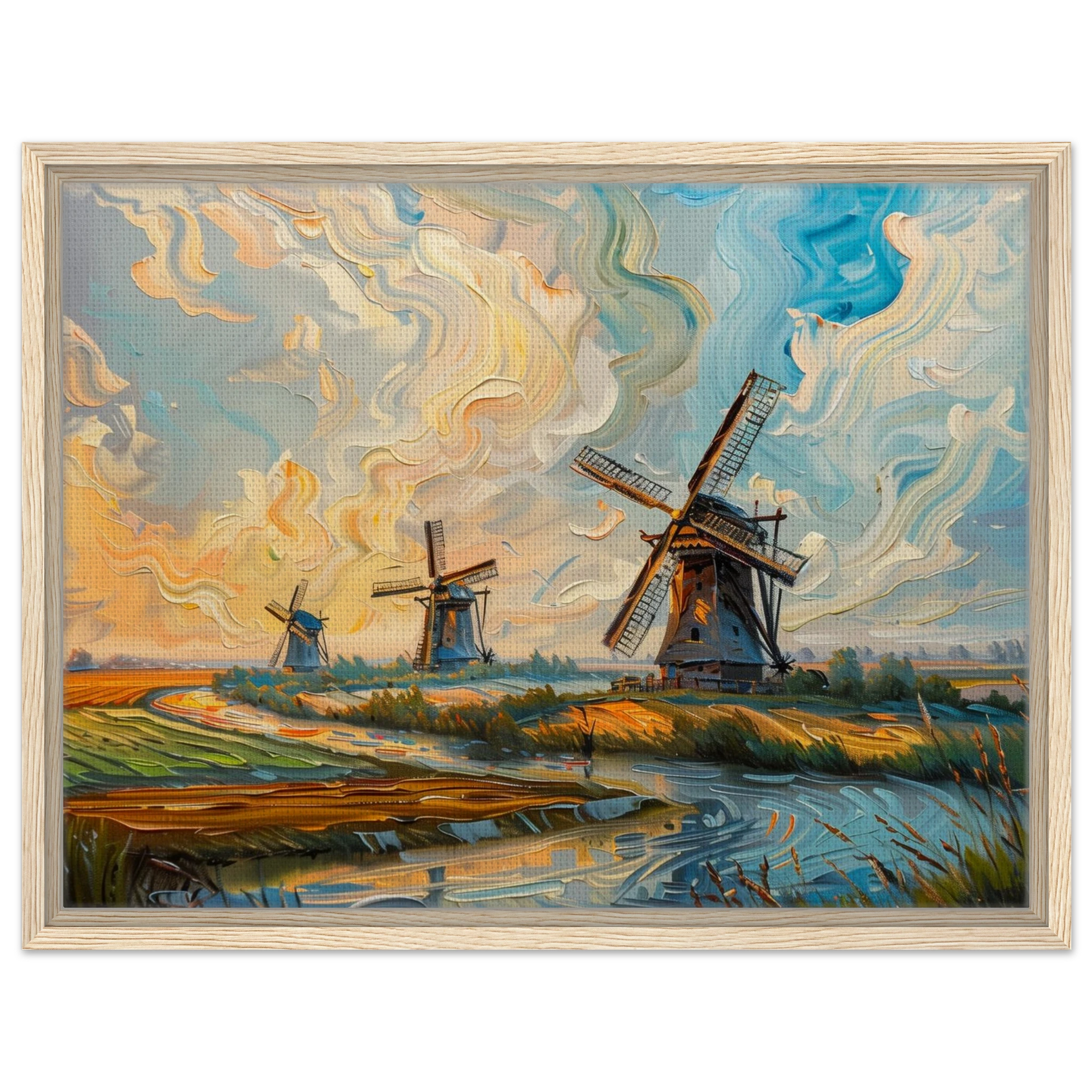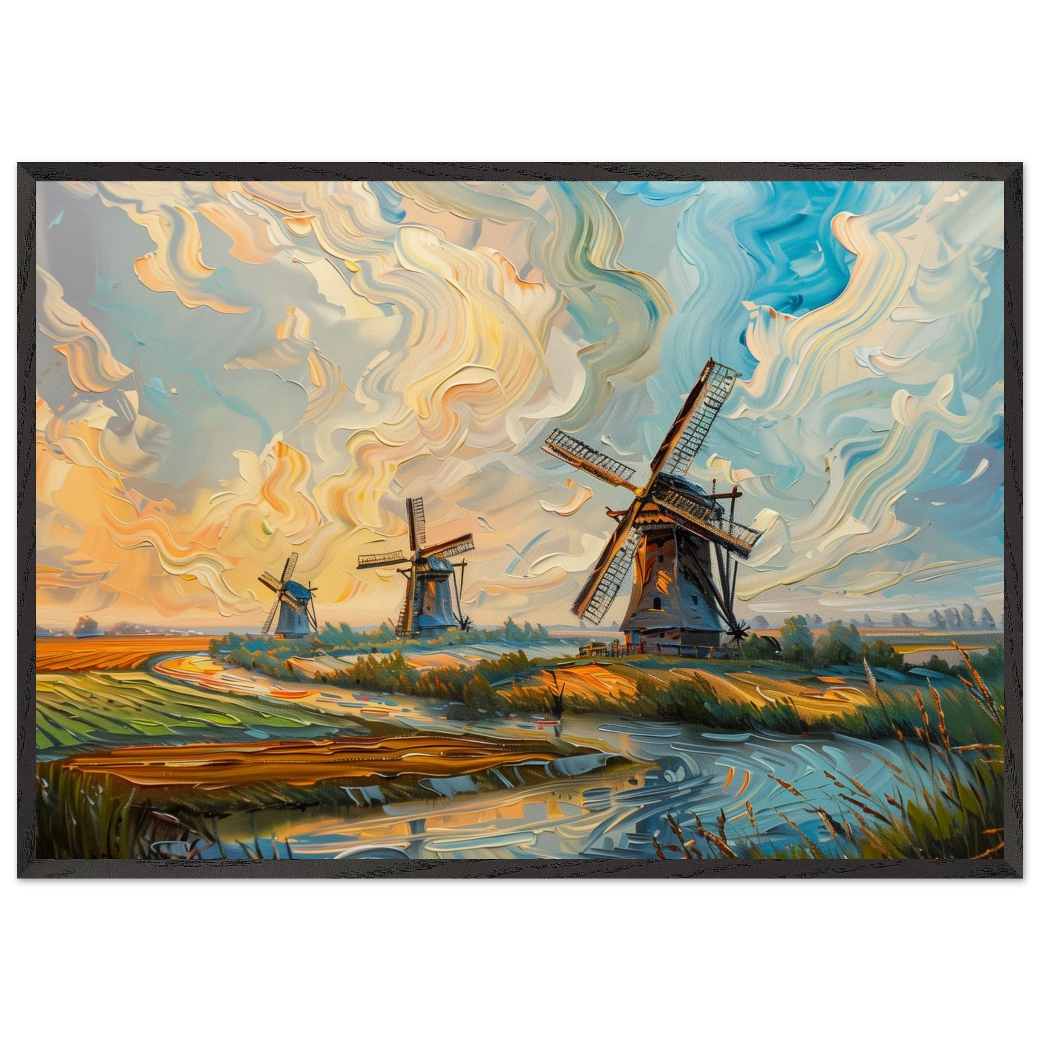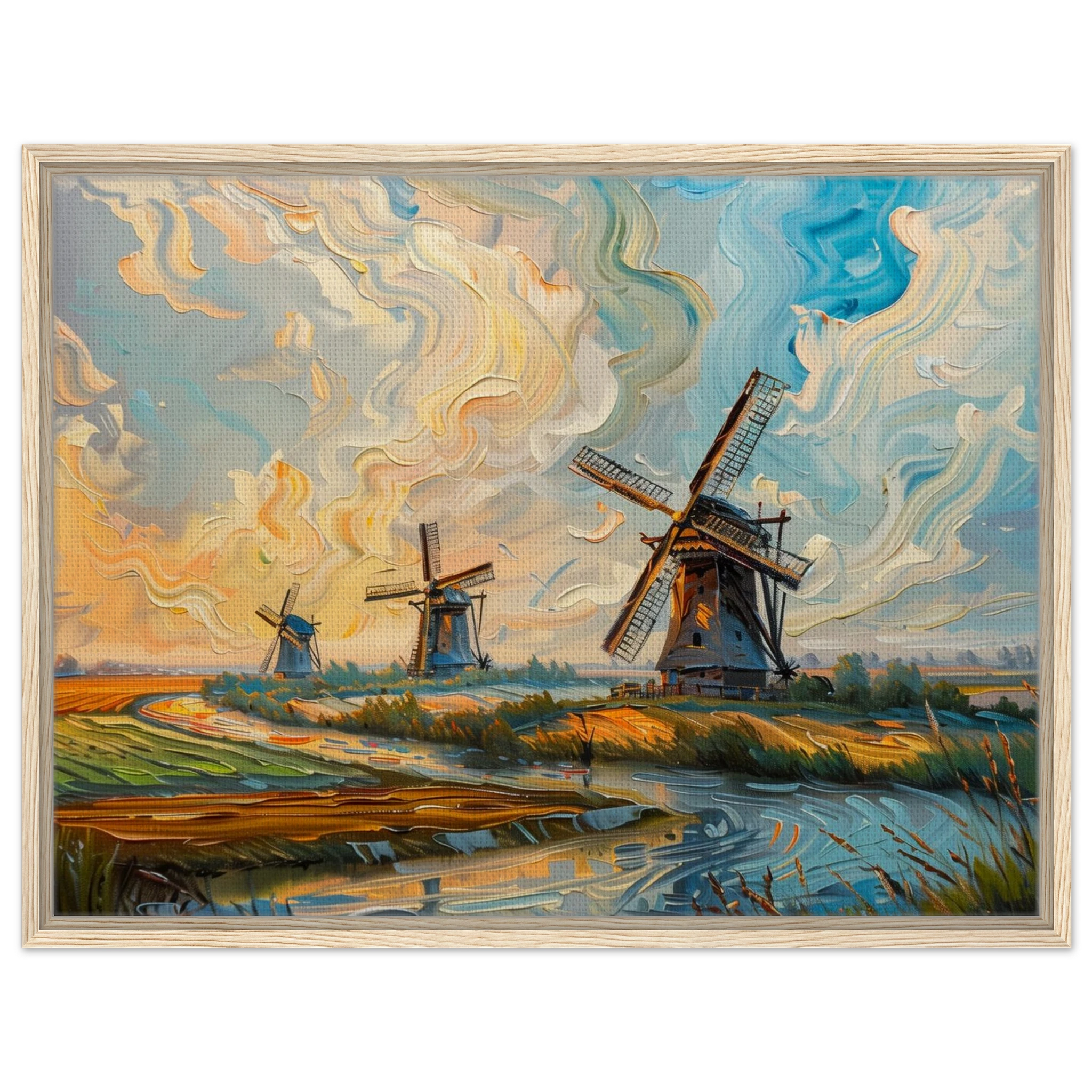 Every brushstroke is alive with motion — the sky stirs, the grass sways, and the windmills turn like old souls still singing.