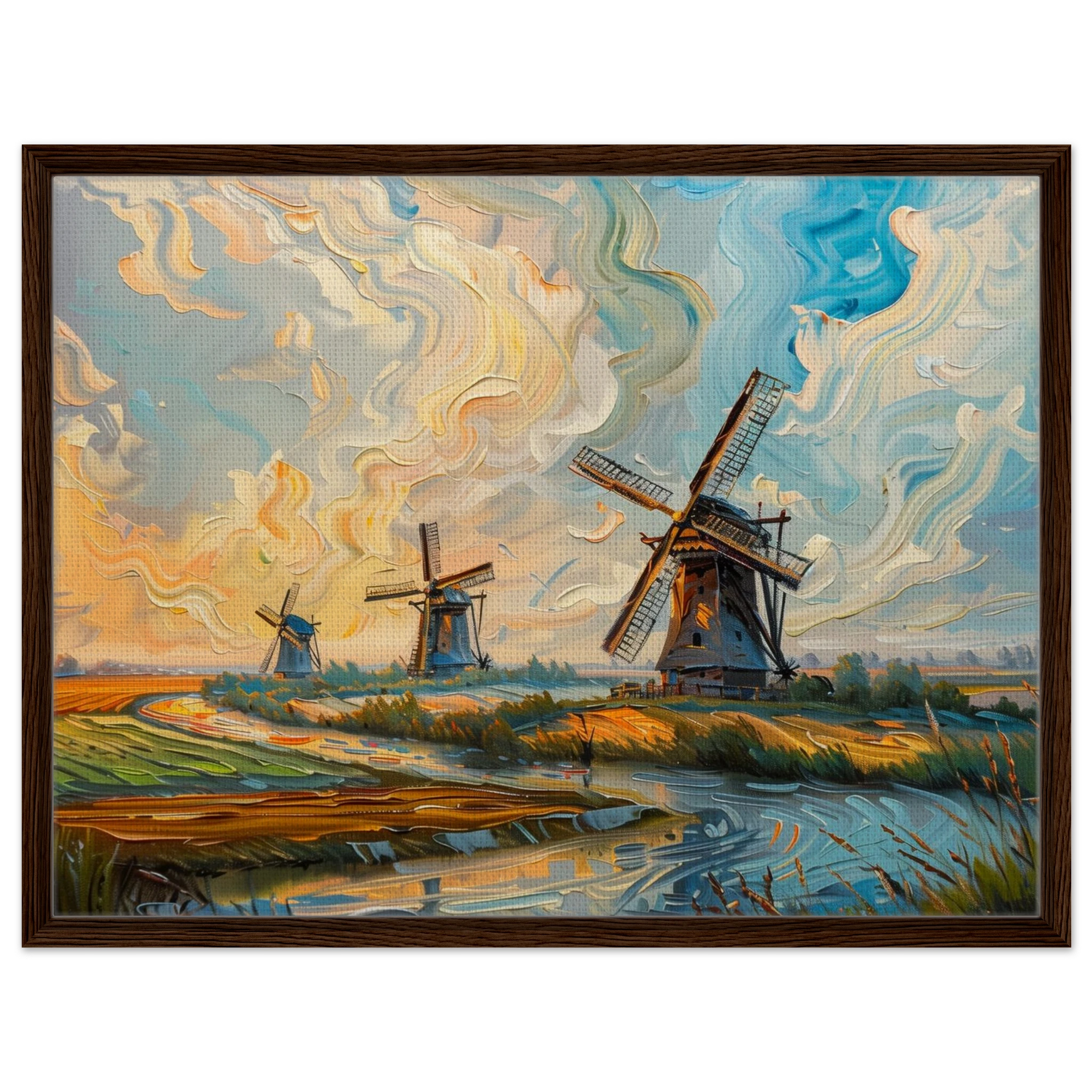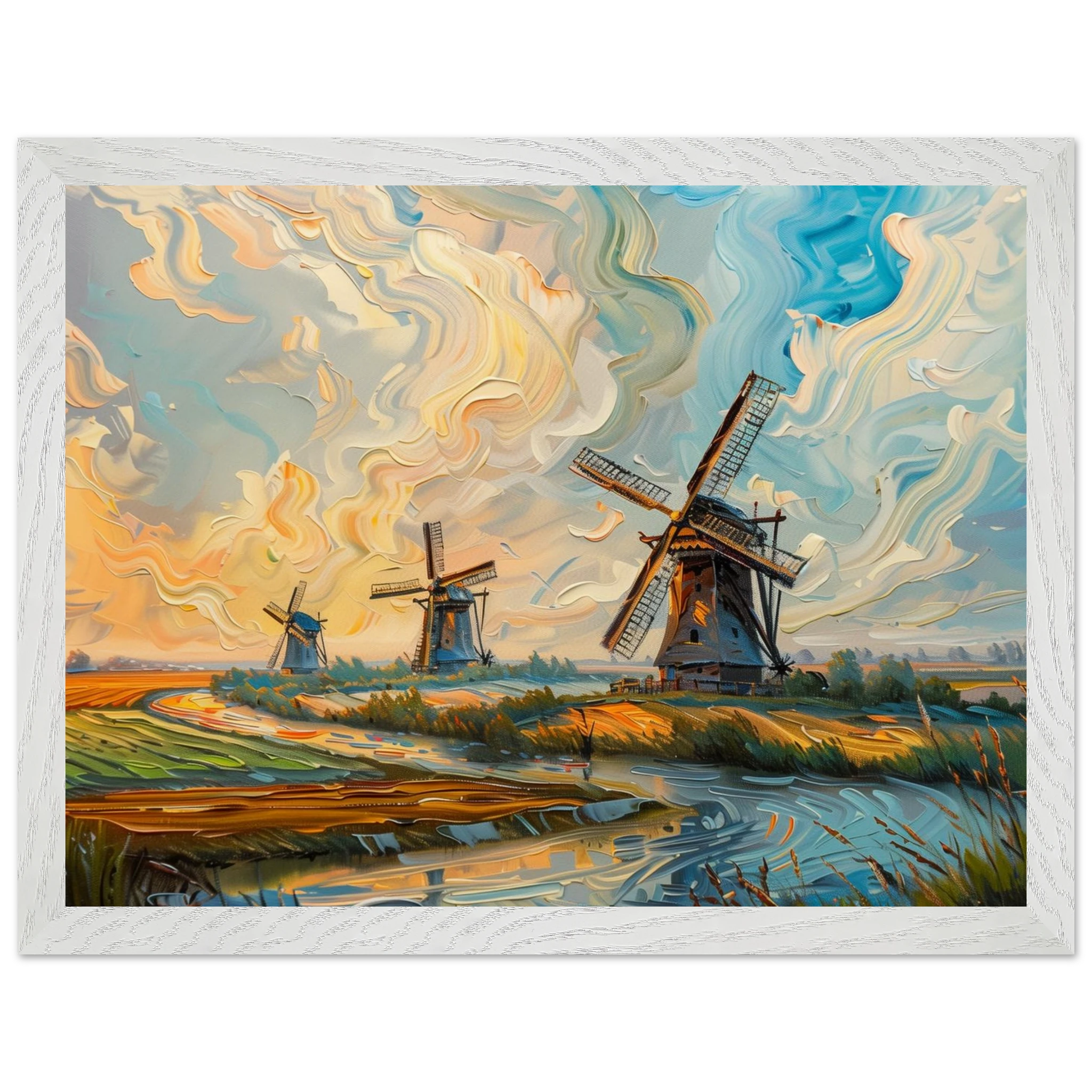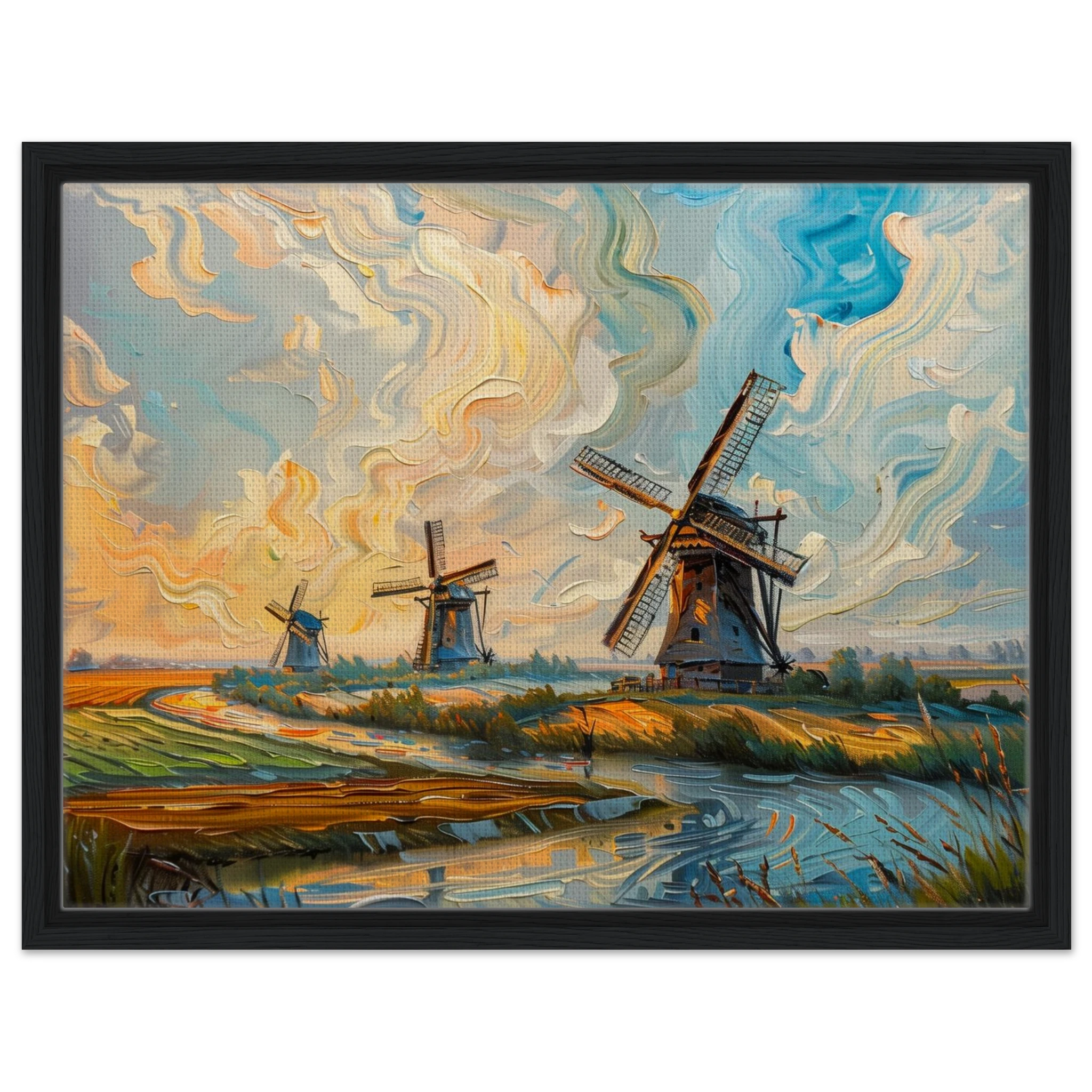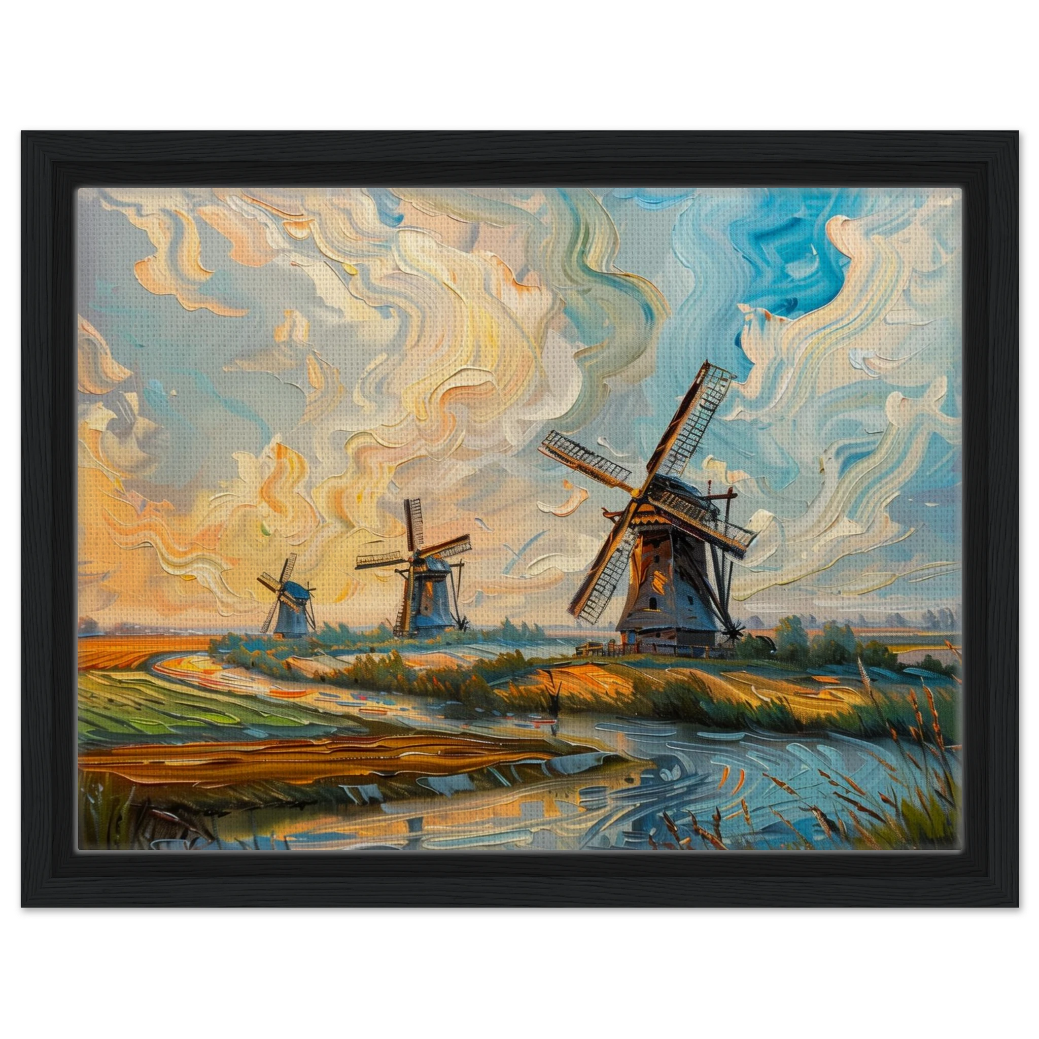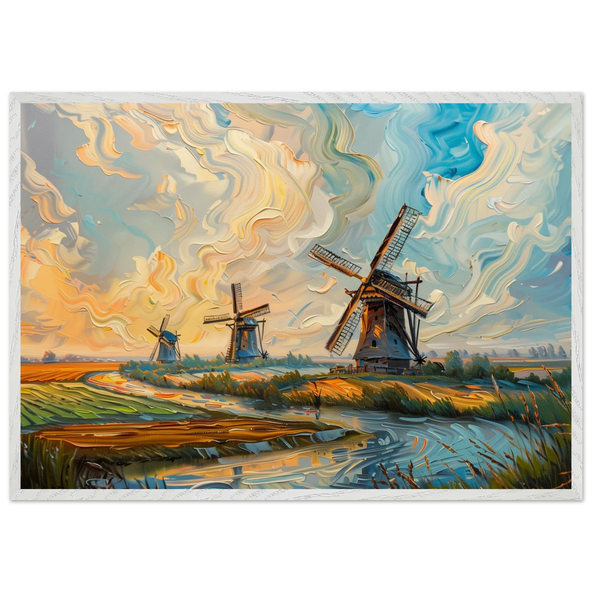 Every brushstroke is alive with motion — the sky stirs, the grass sways, and the windmills turn like old souls still singing.