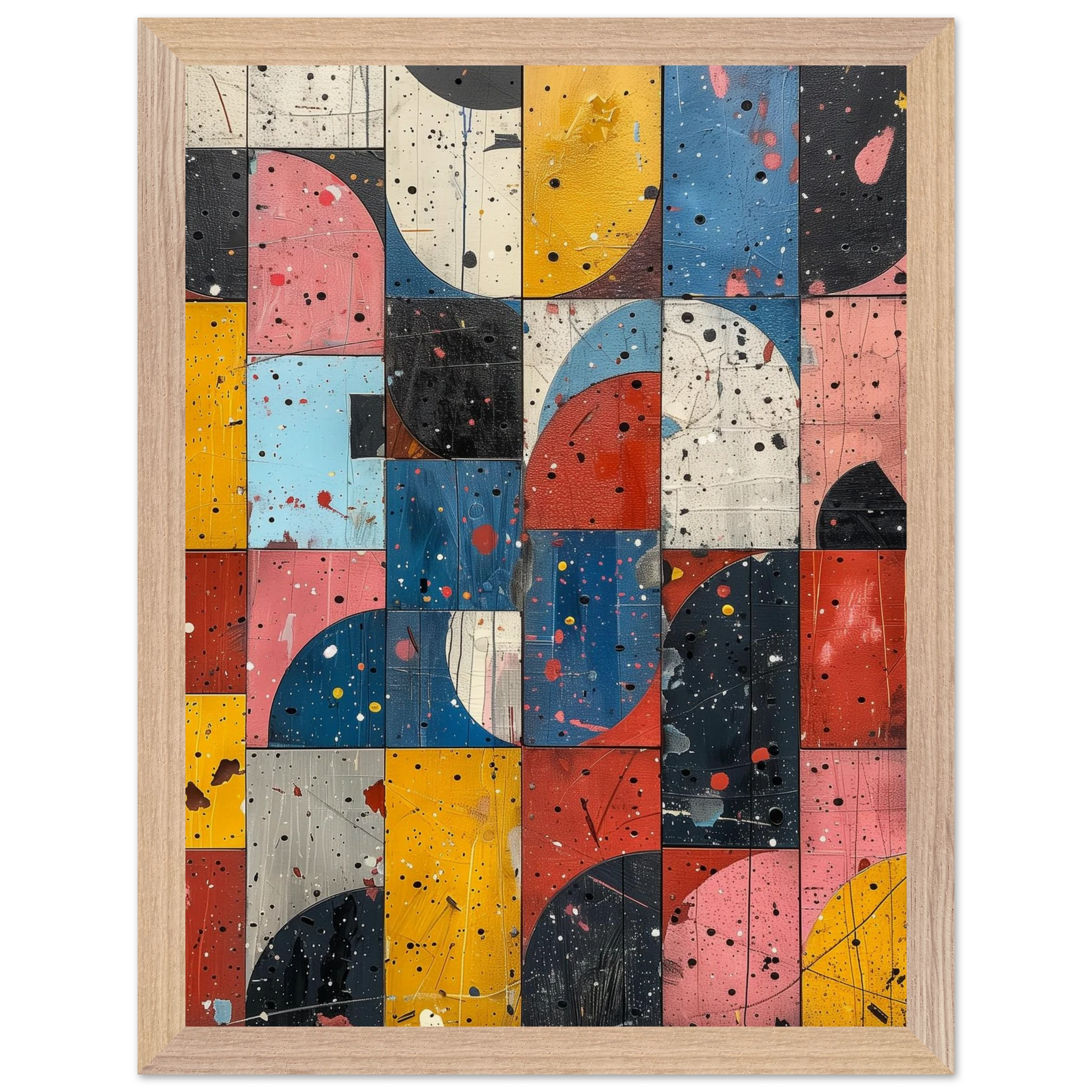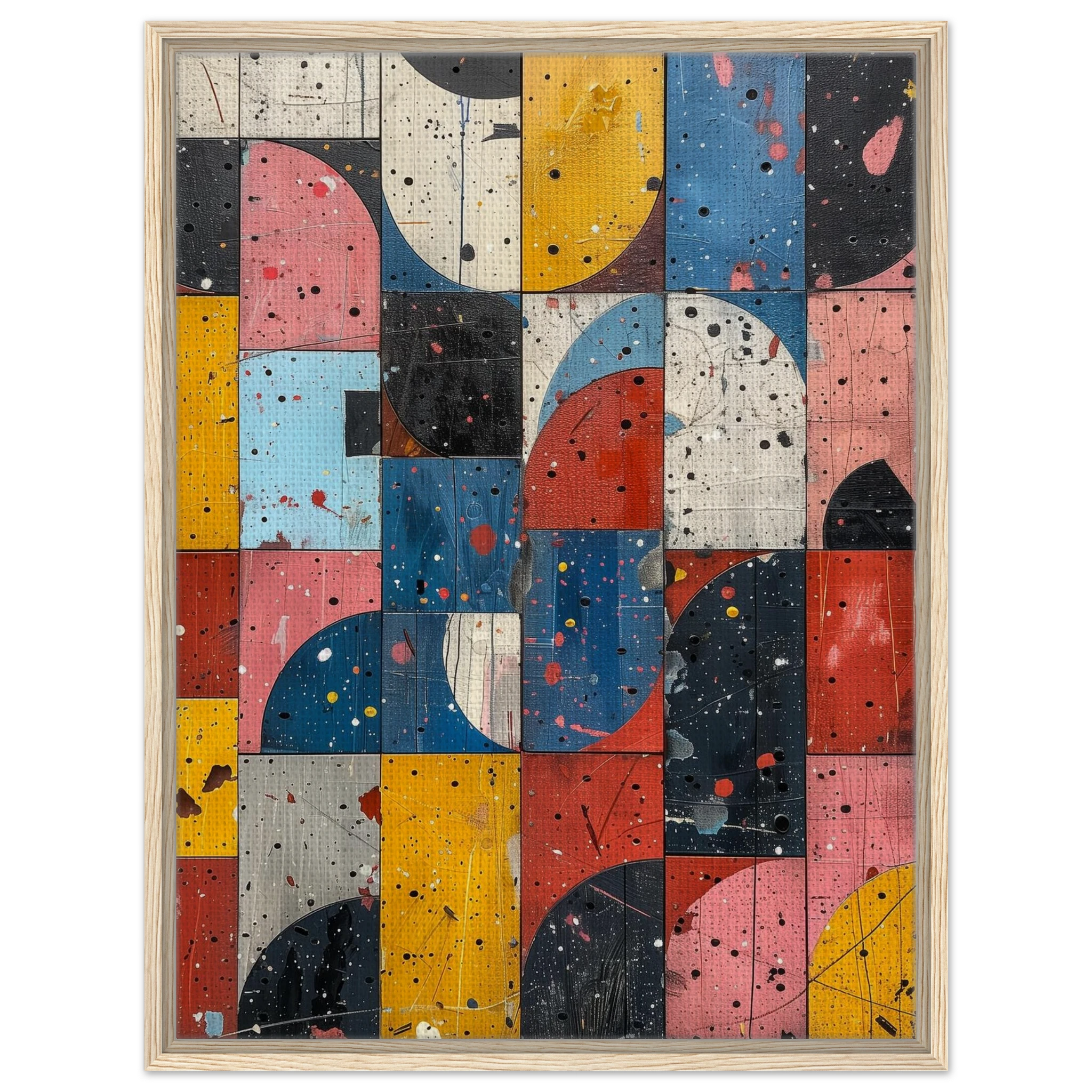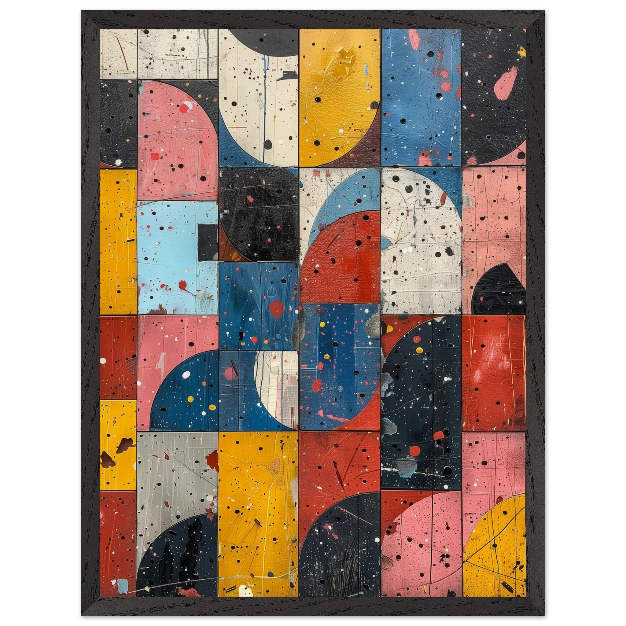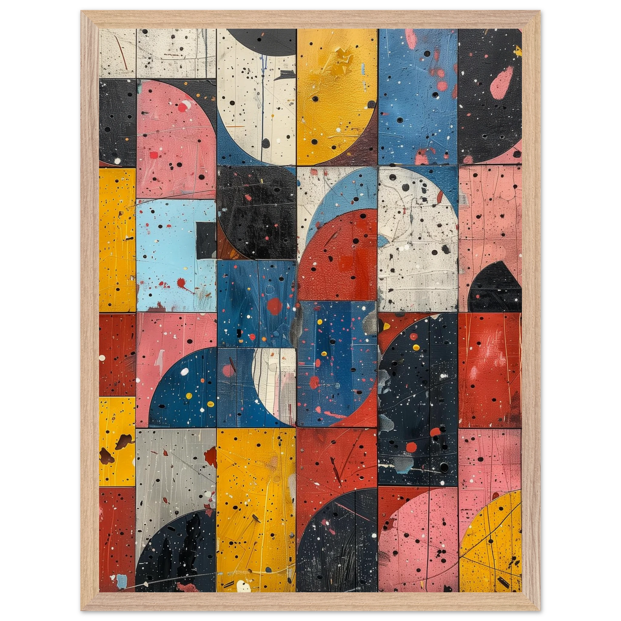 A fractured mosaic where retro hues and paint splatters mimic digital noise—nostalgia encrypted in texture.
