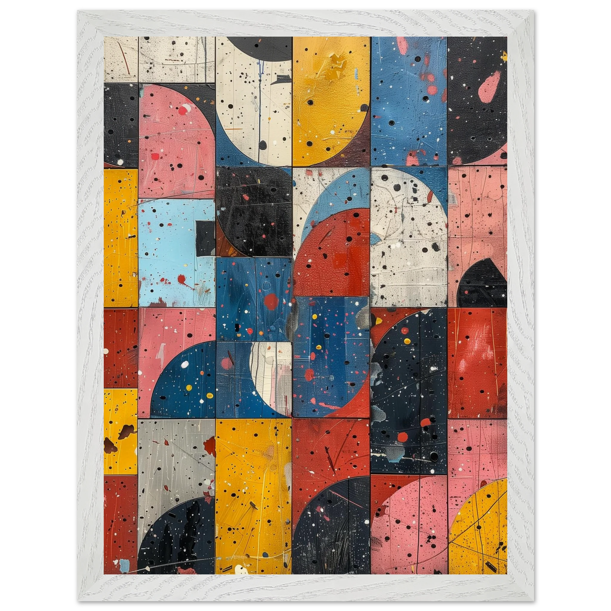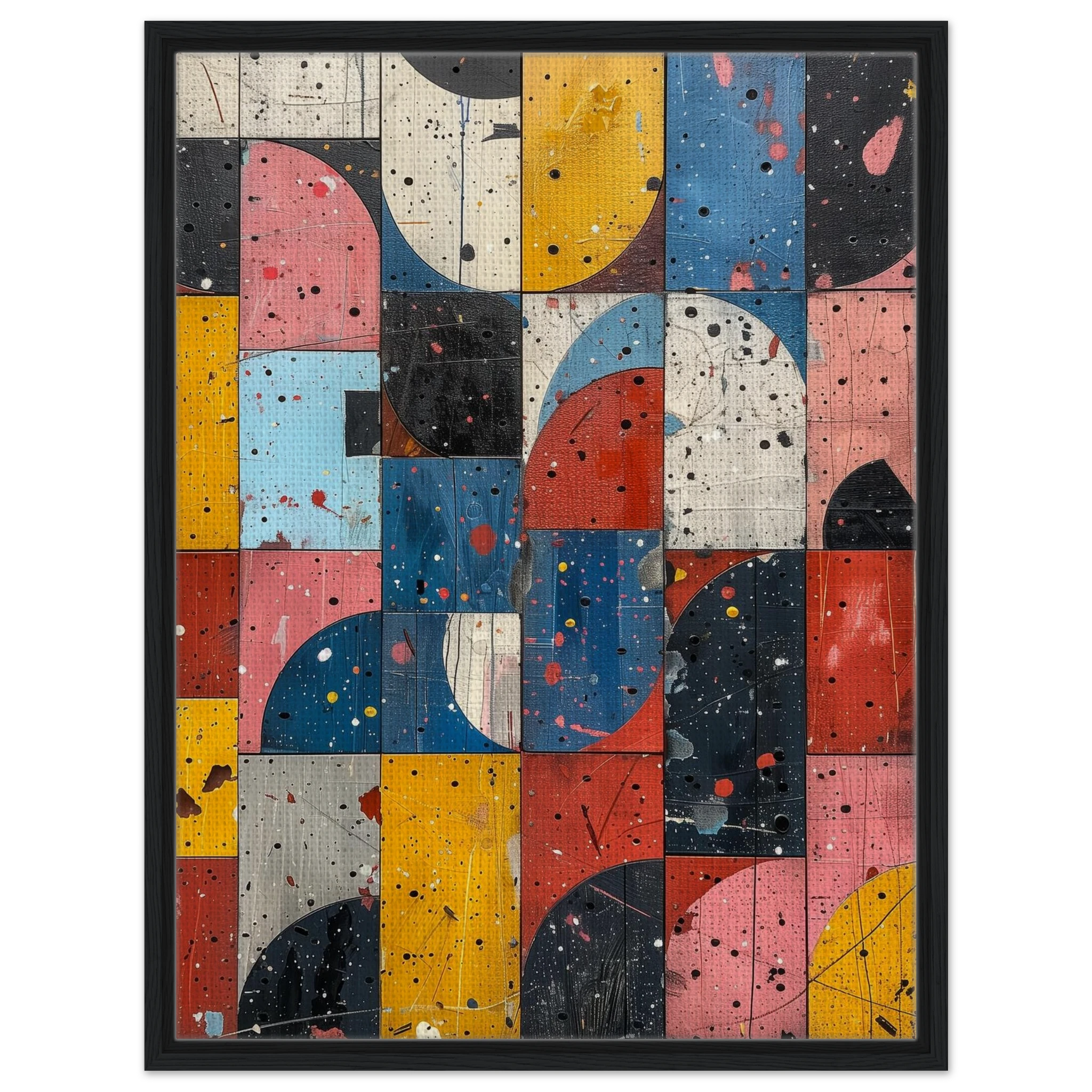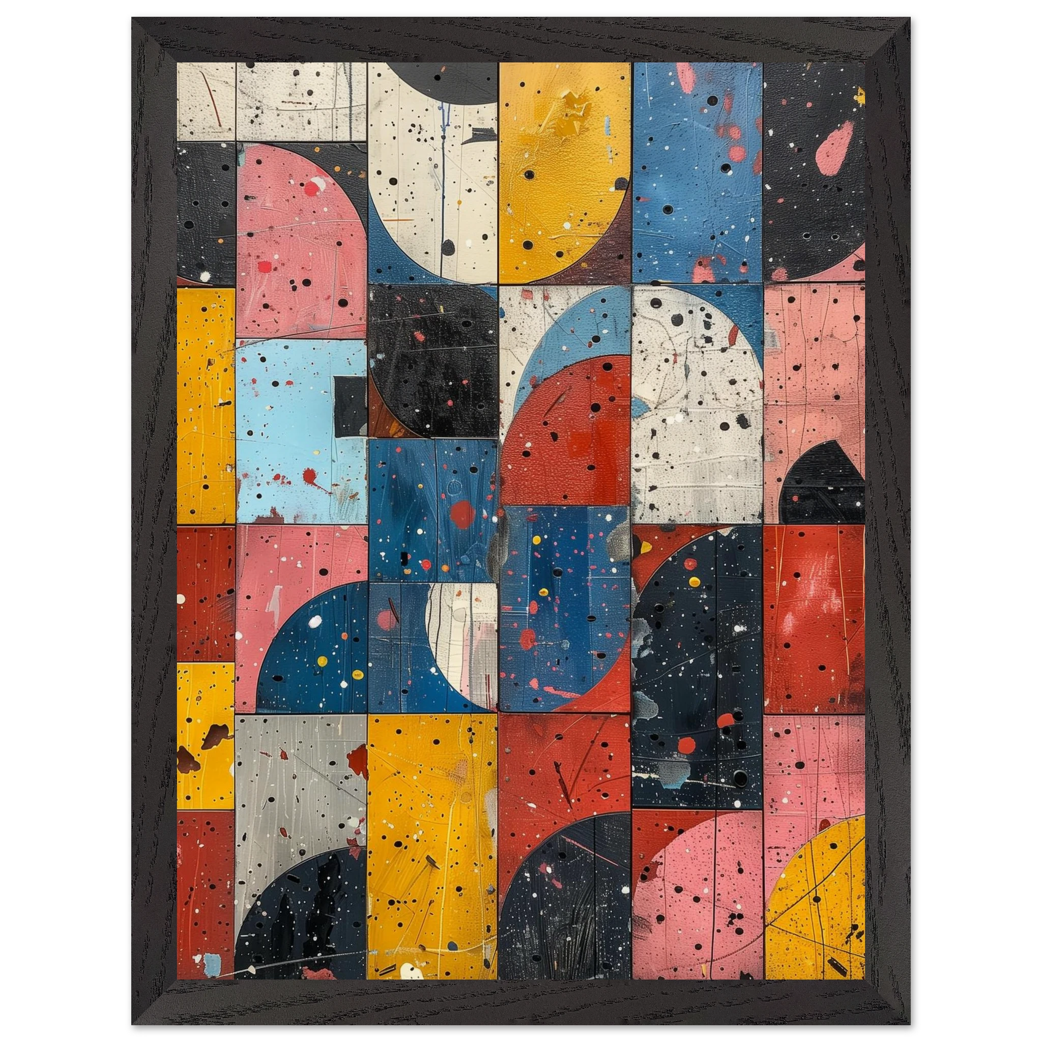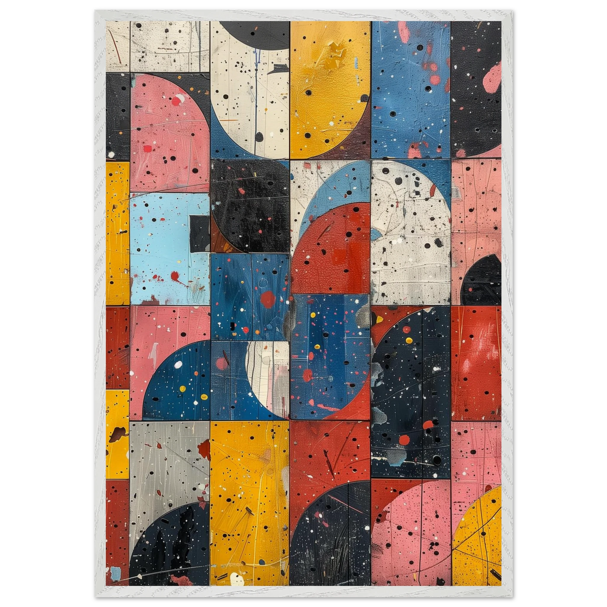 A fractured mosaic where retro hues and paint splatters mimic digital noise—nostalgia encrypted in texture.