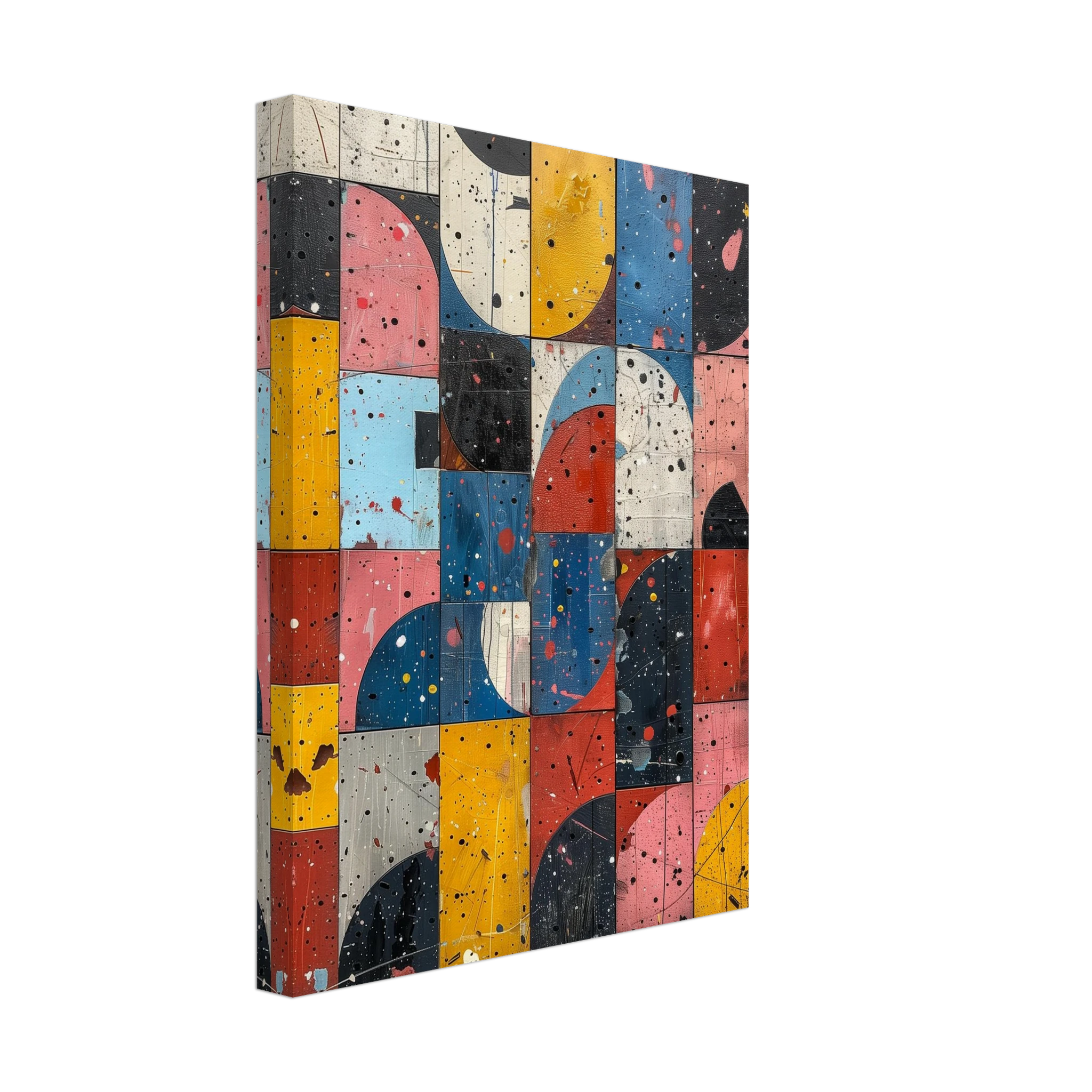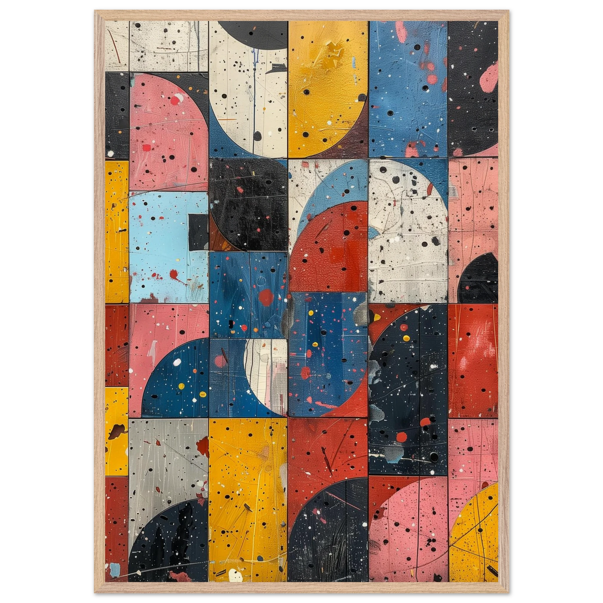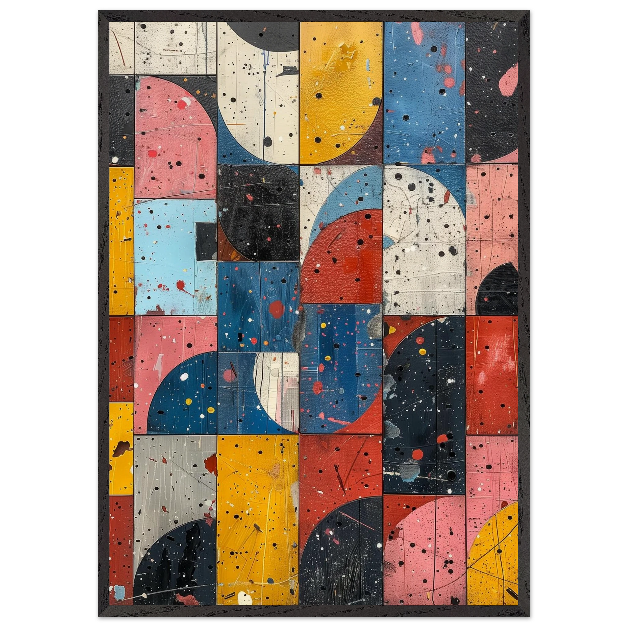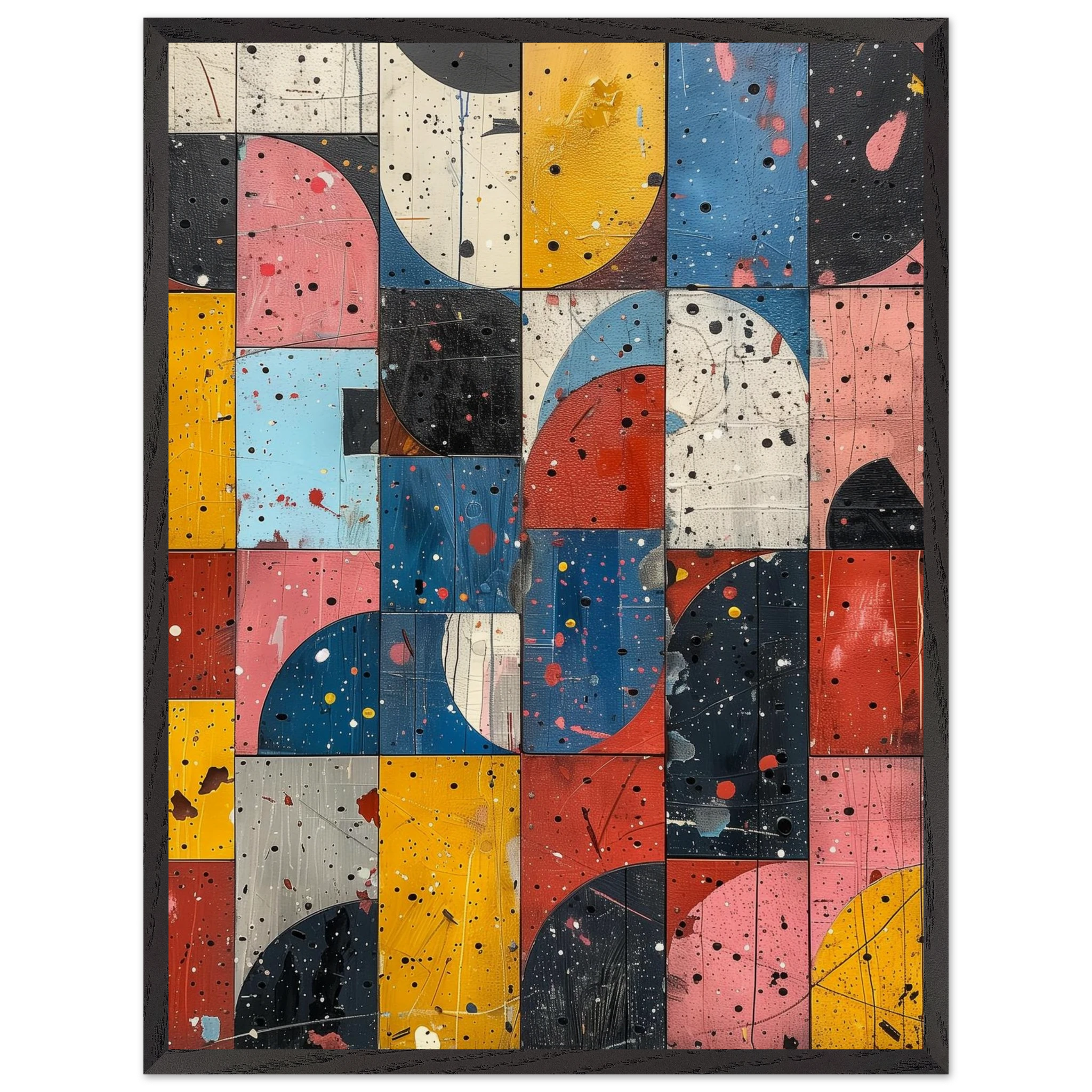 A fractured mosaic where retro hues and paint splatters mimic digital noise—nostalgia encrypted in texture.