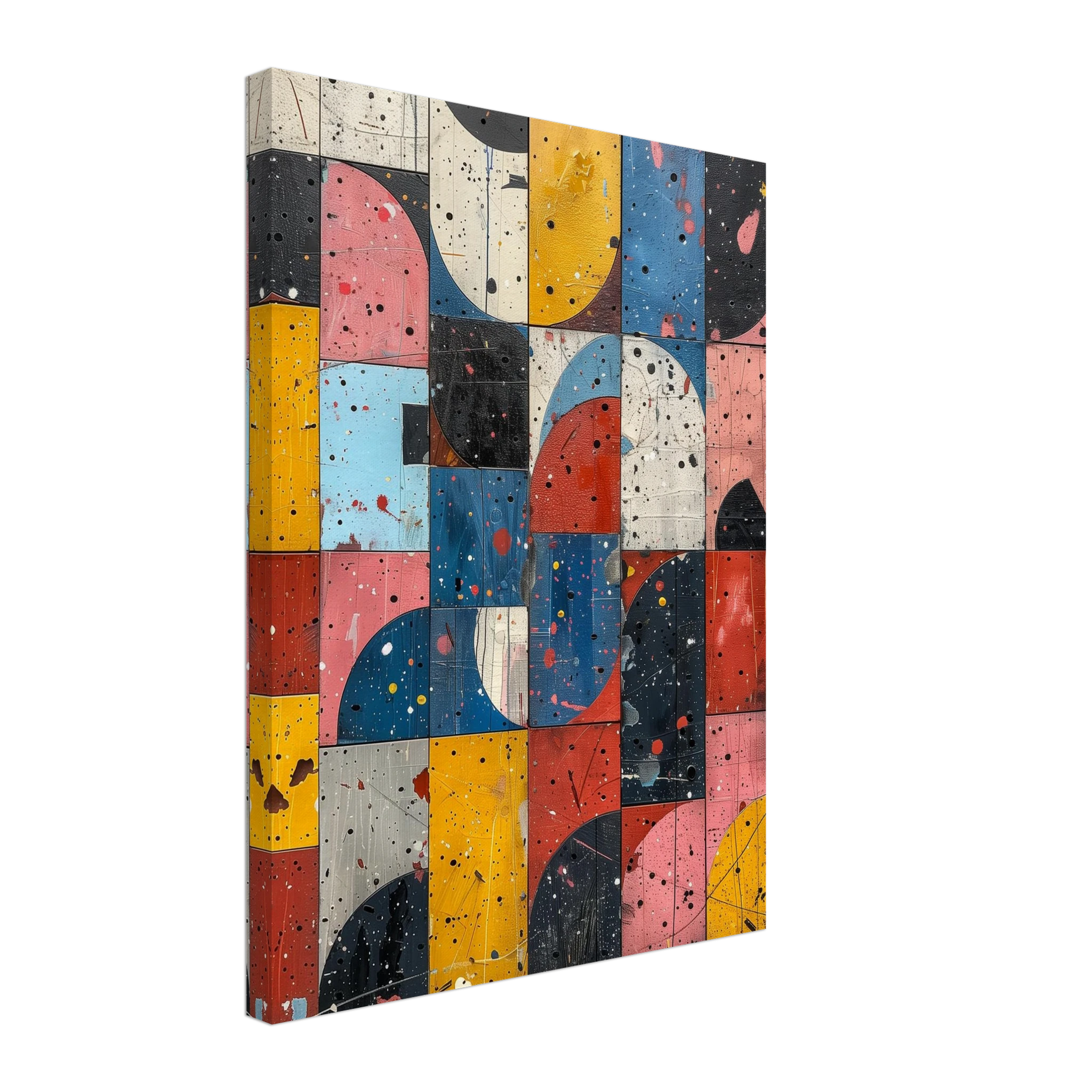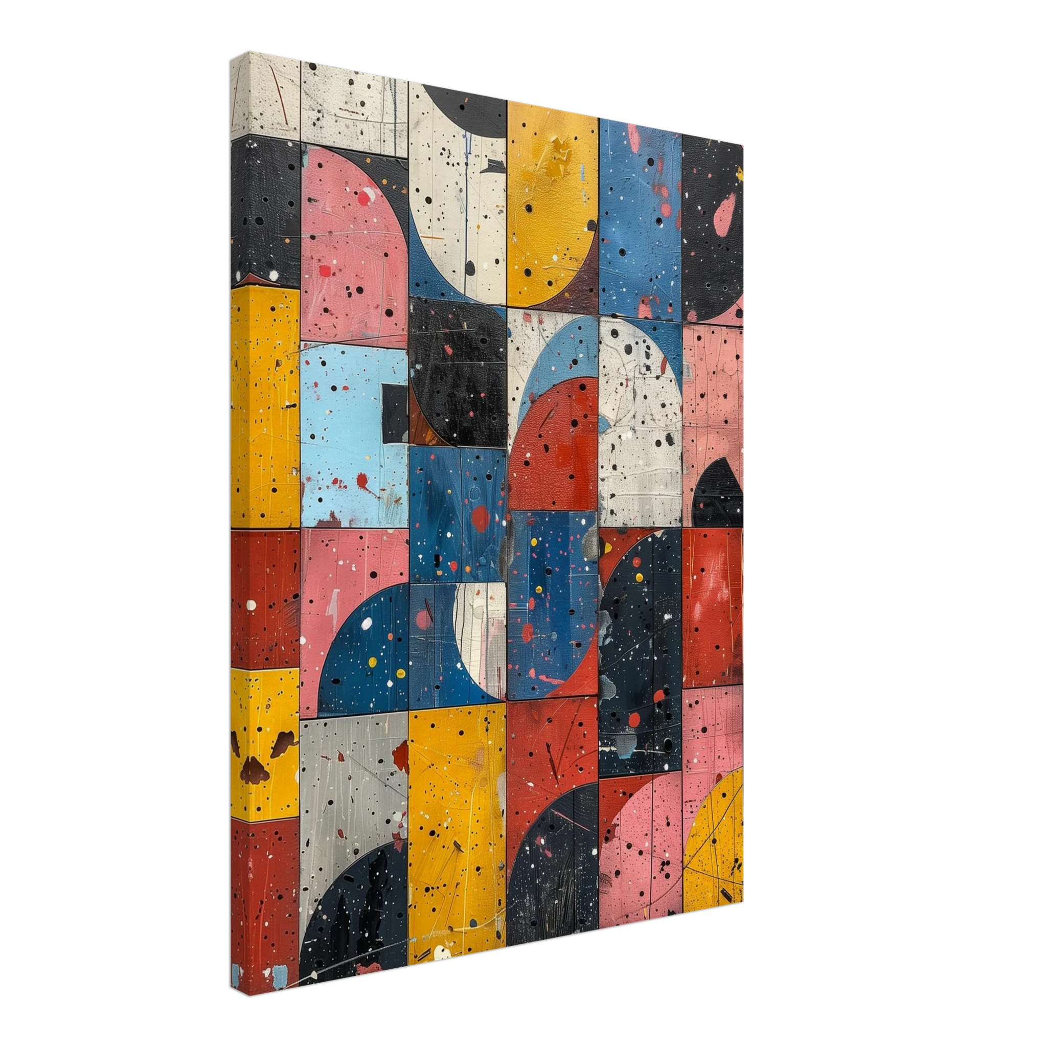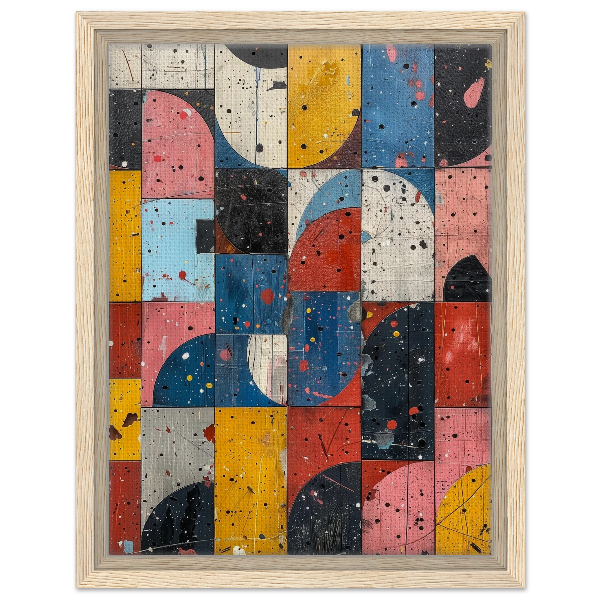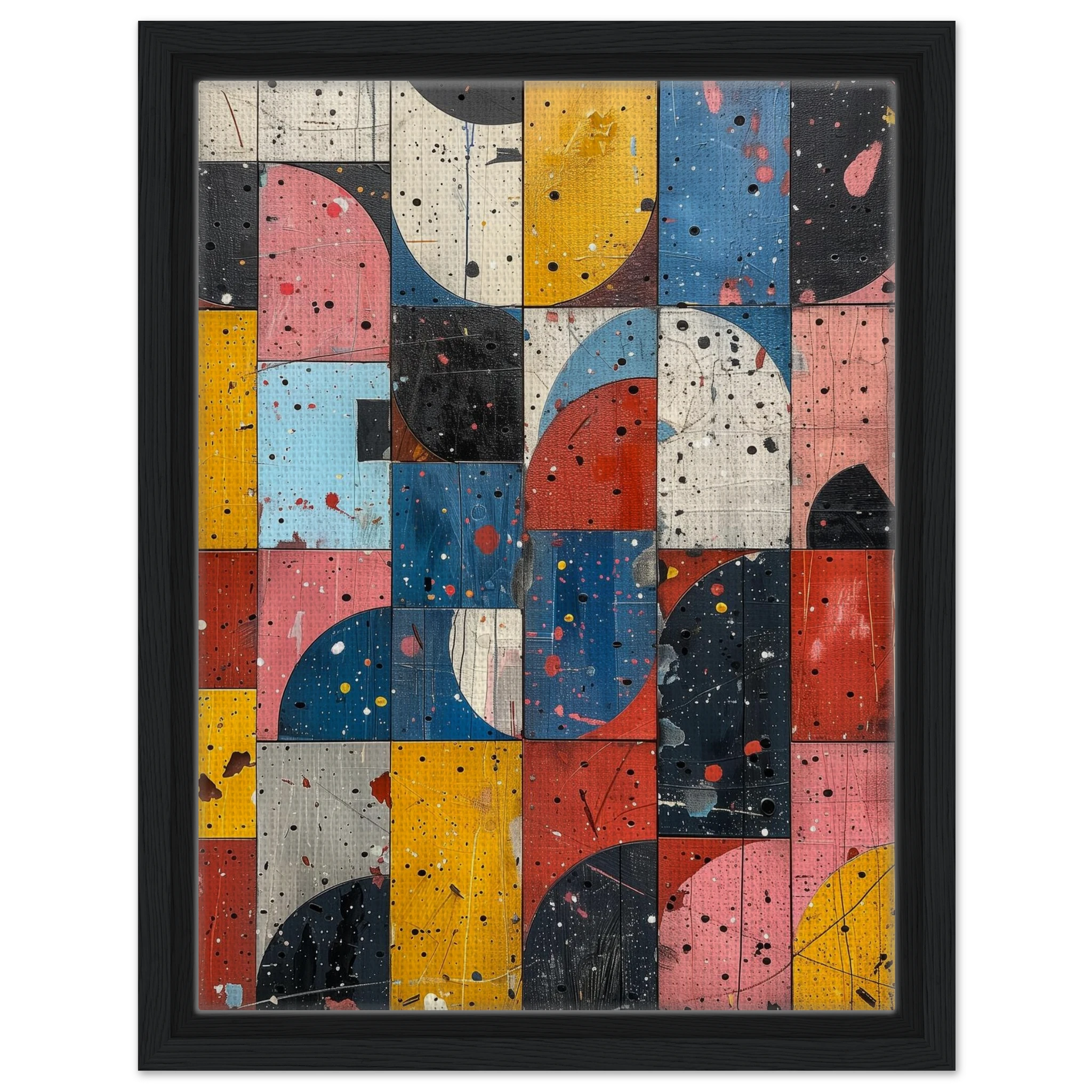 A fractured mosaic where retro hues and paint splatters mimic digital noise—nostalgia encrypted in texture.