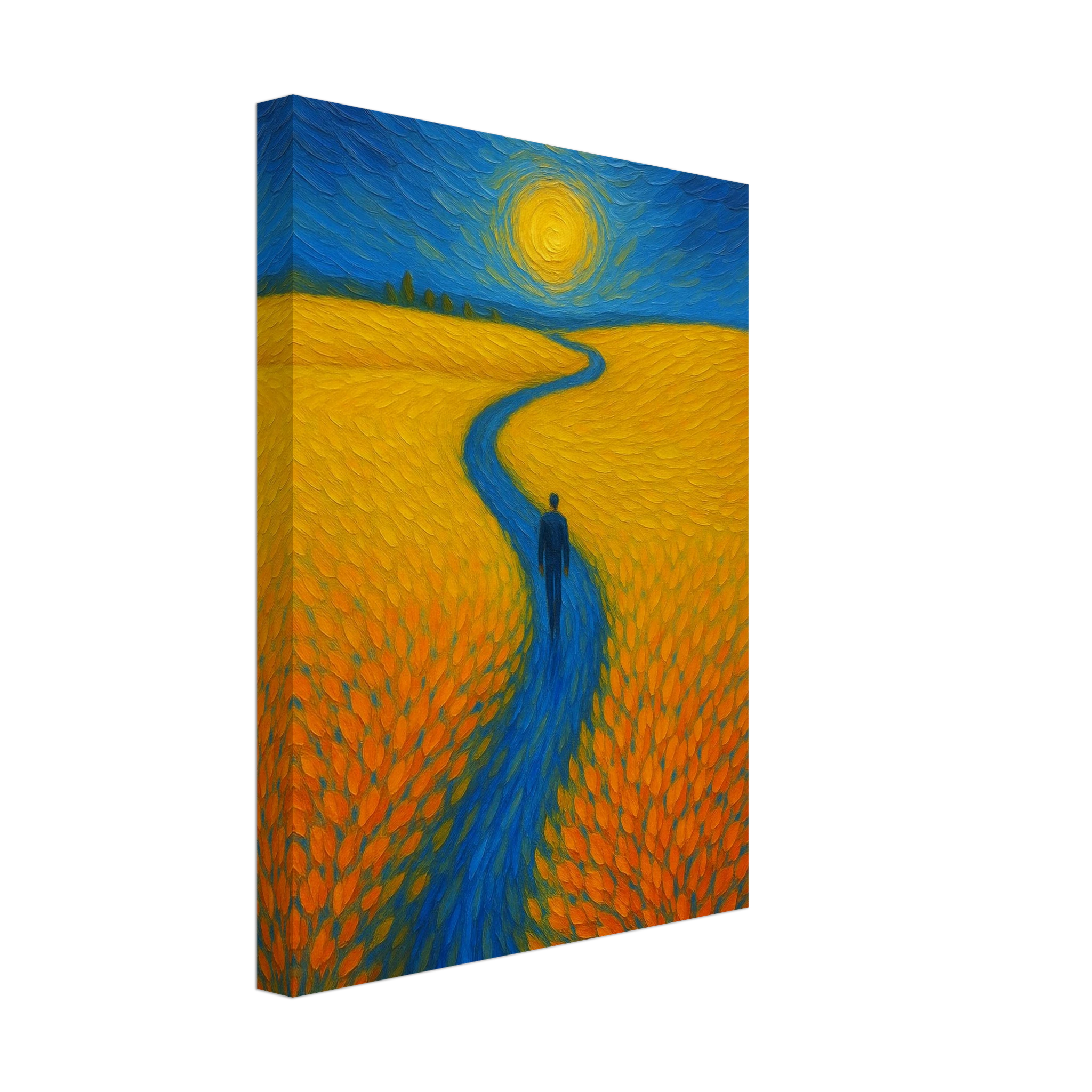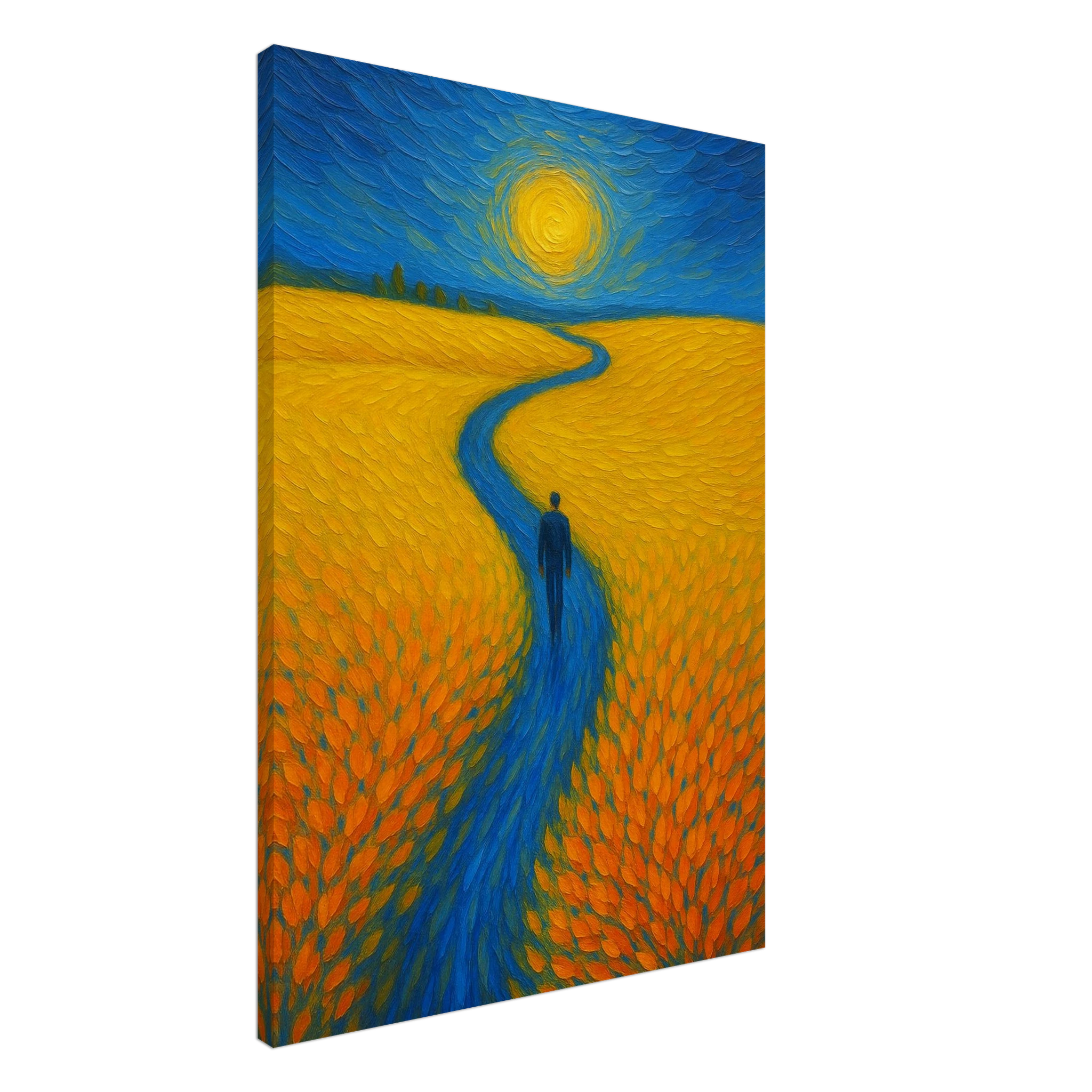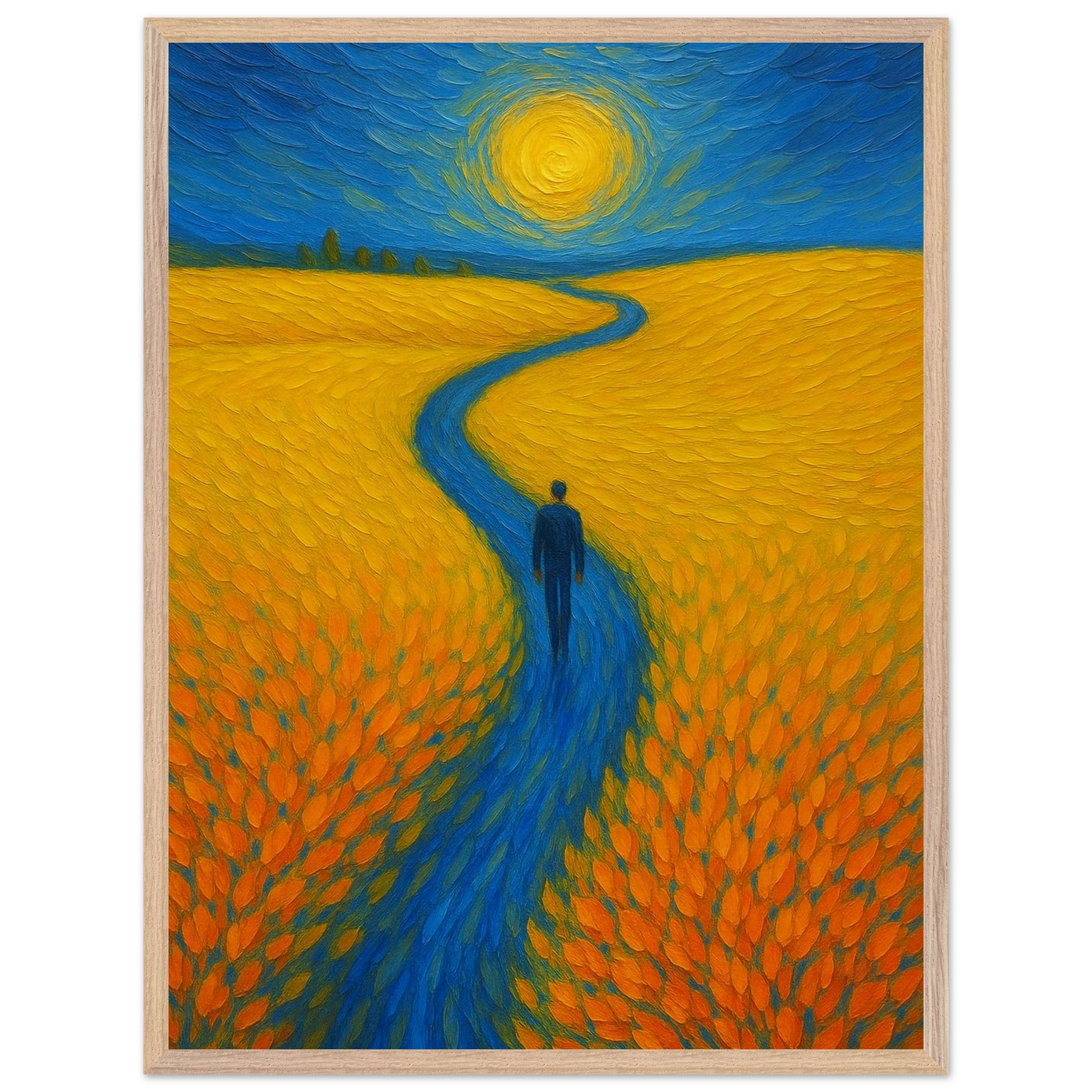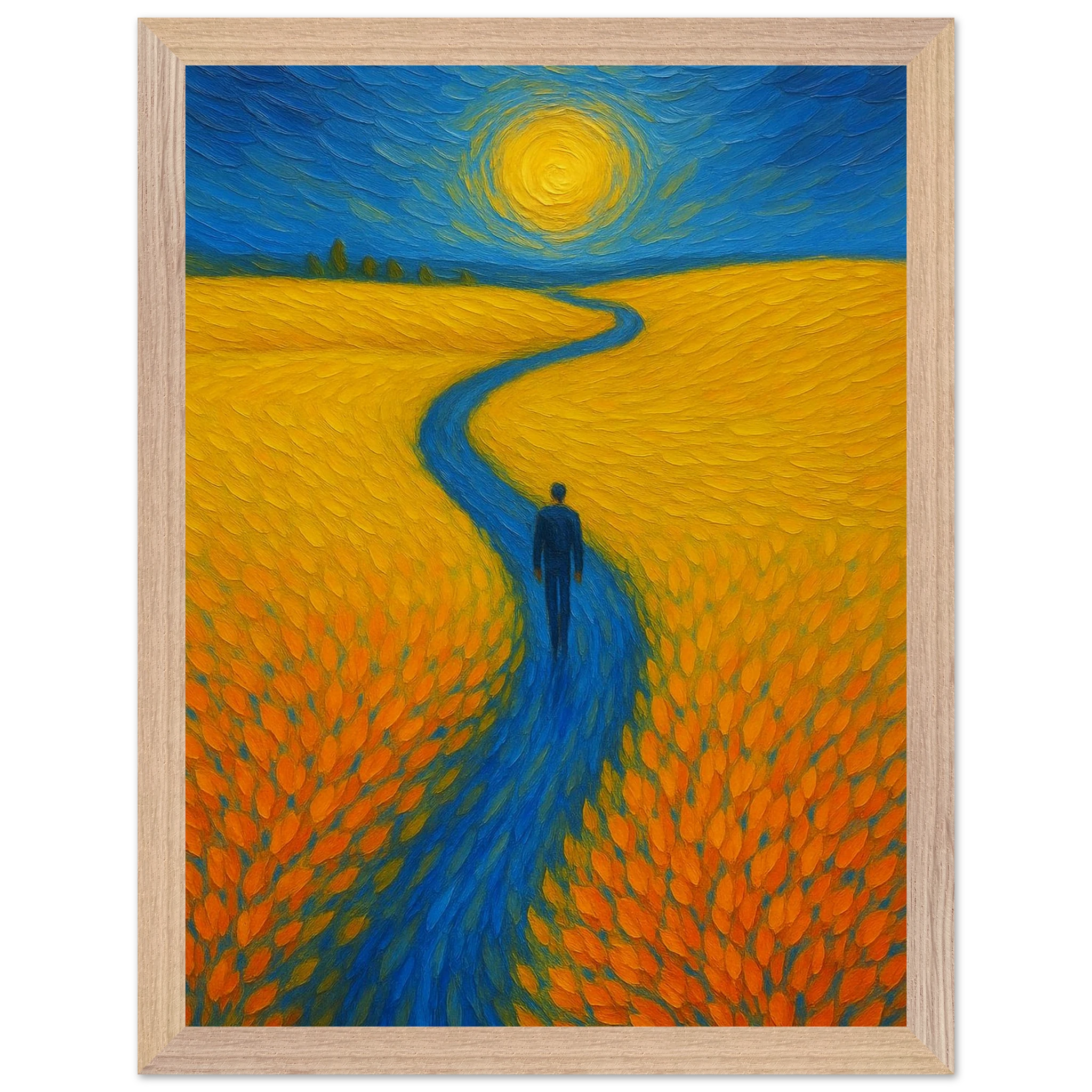 The golden fields stretch like memory, the road like time—curving, relentless, and lit by an eternal return.