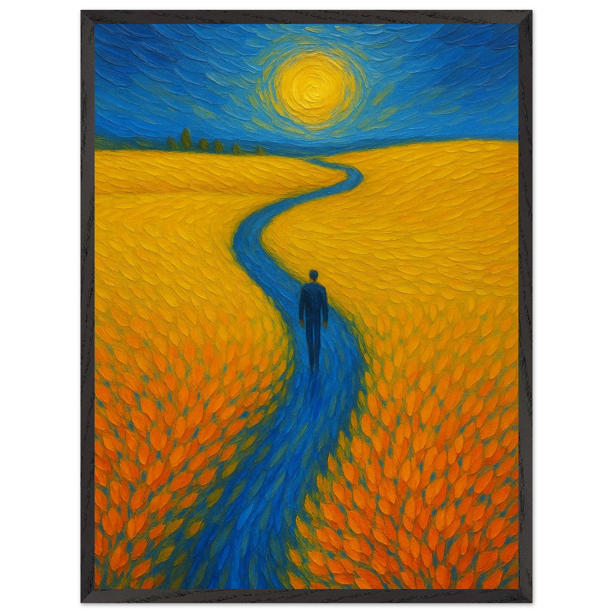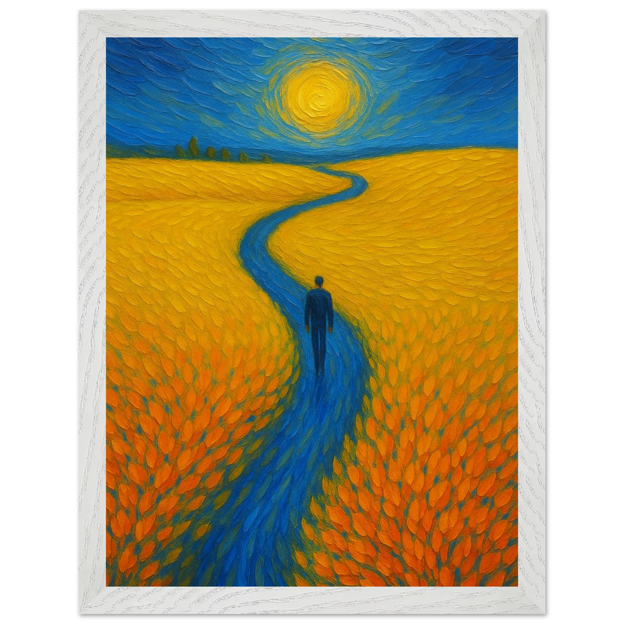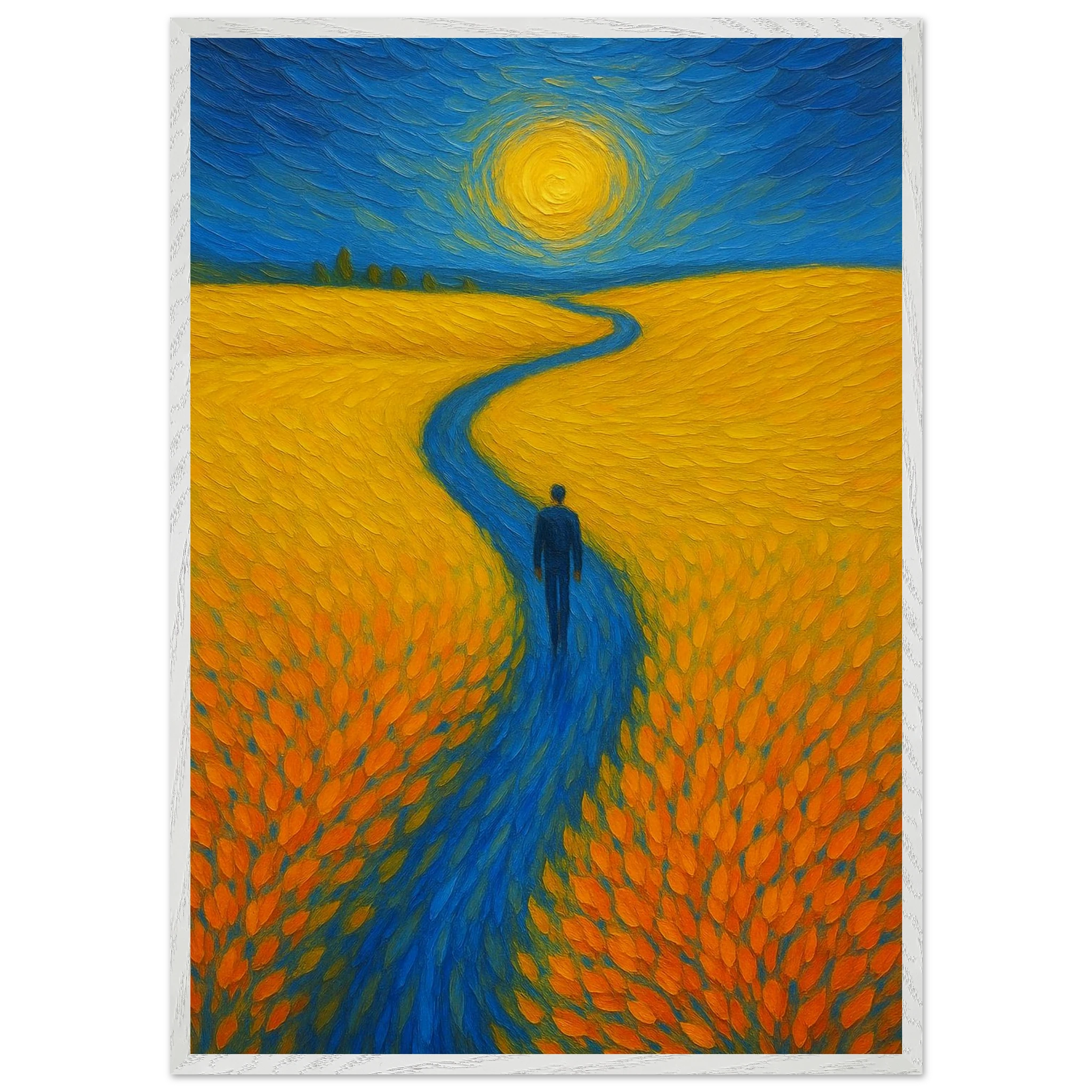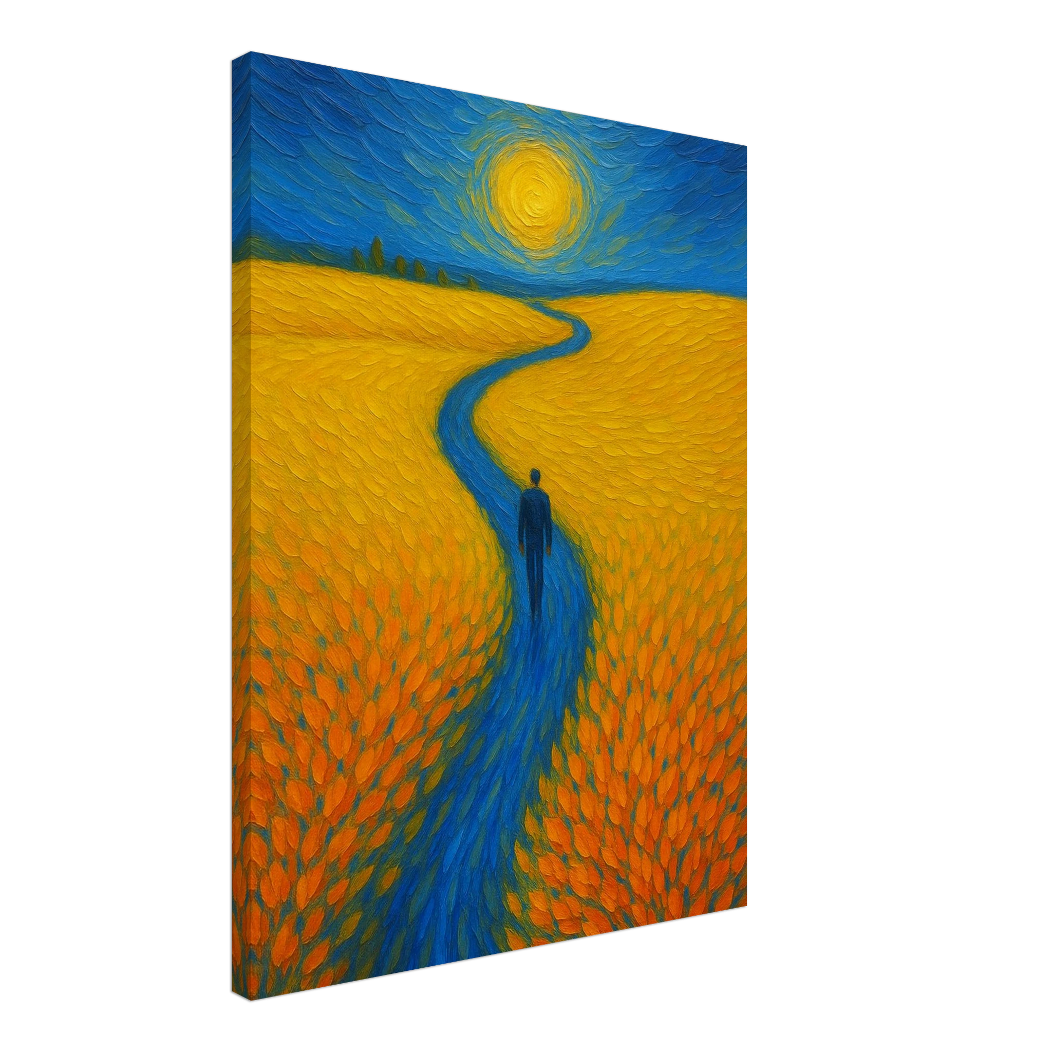 The golden fields stretch like memory, the road like time—curving, relentless, and lit by an eternal return.