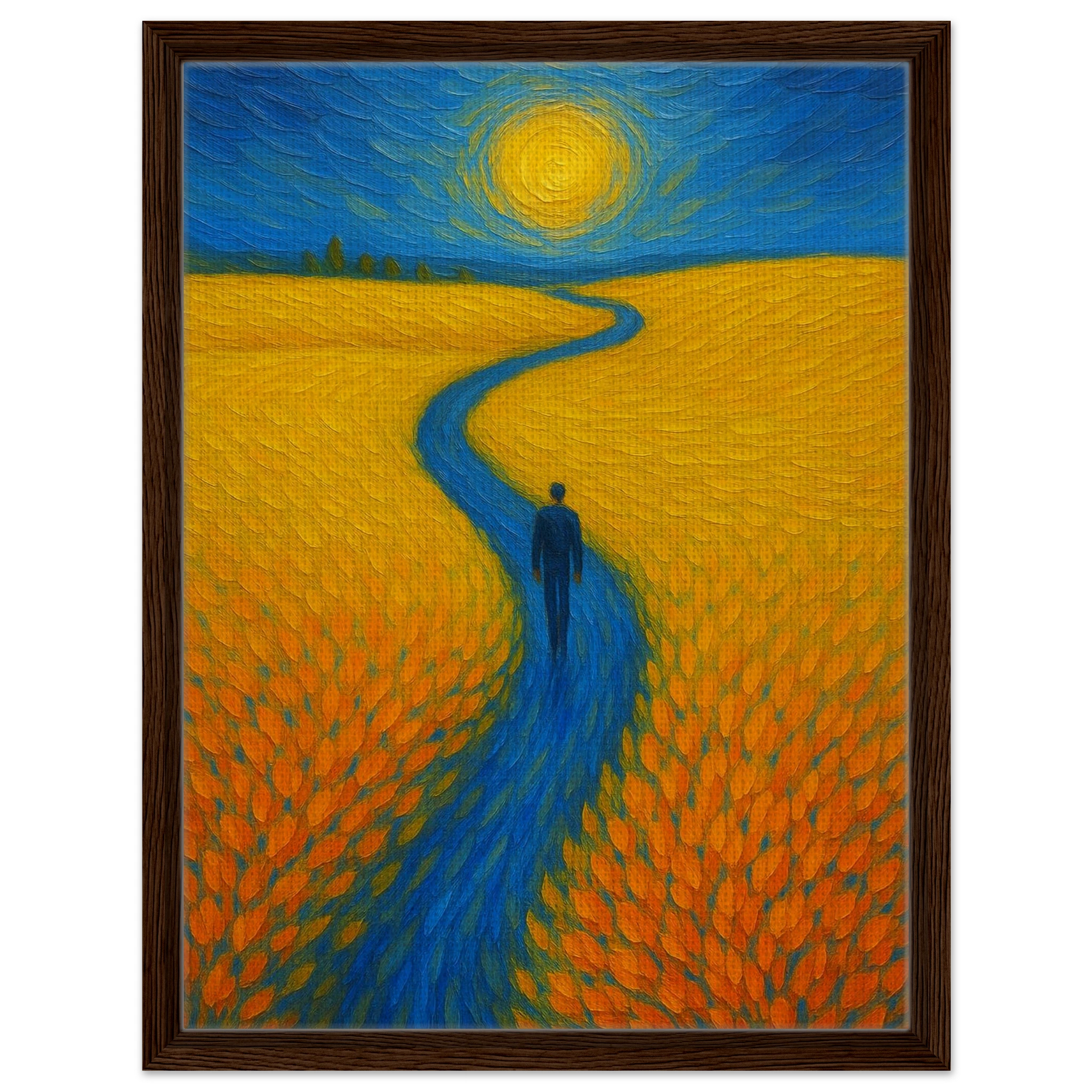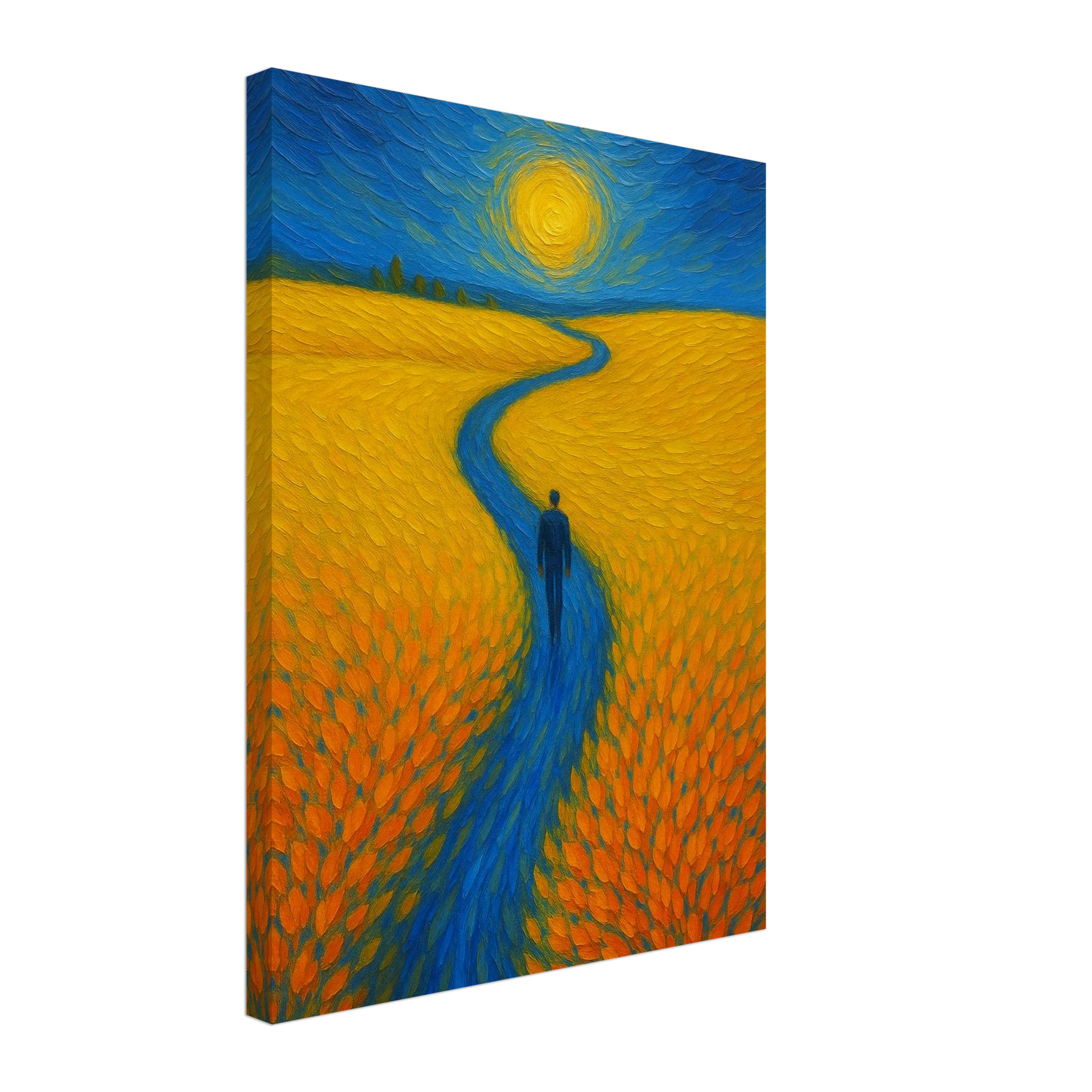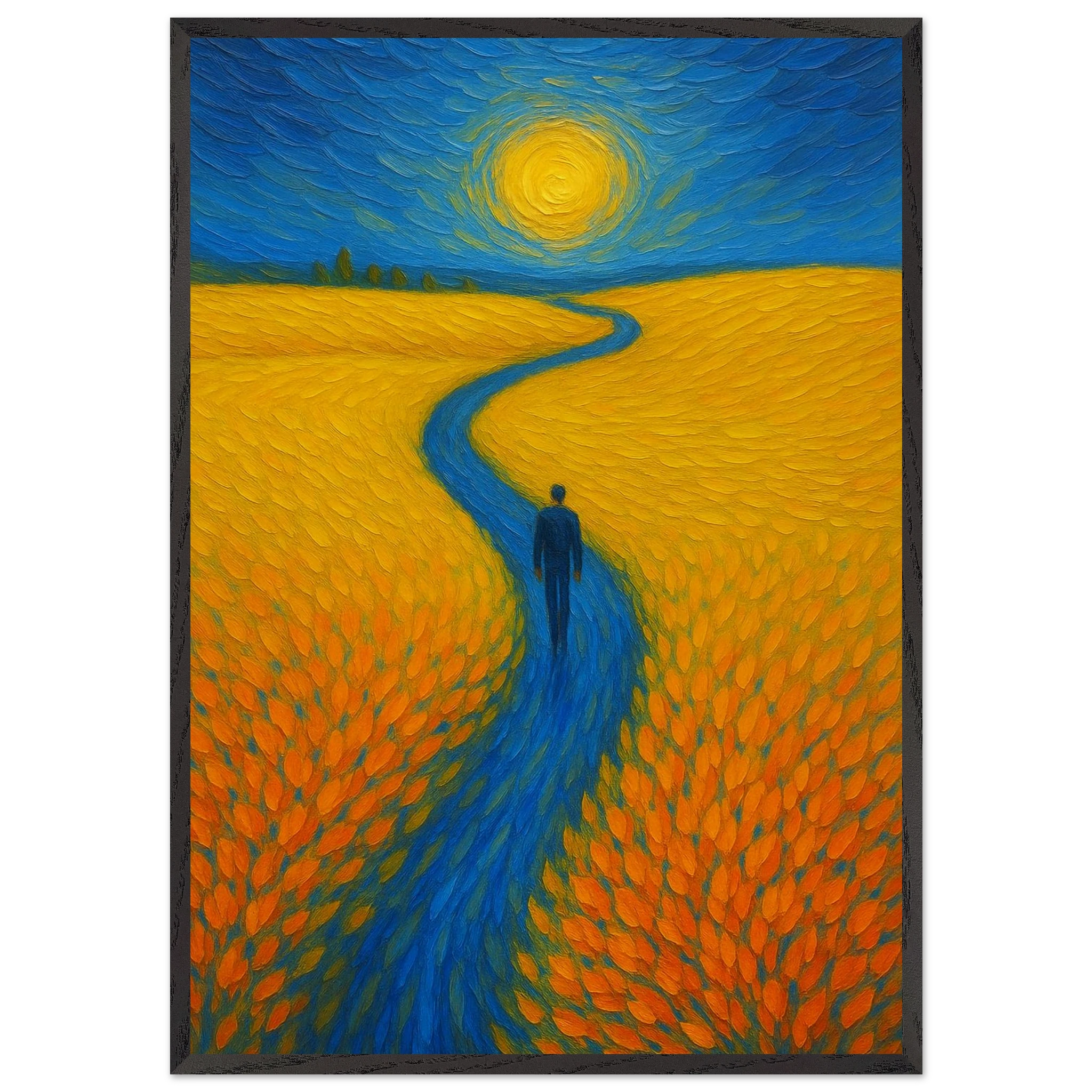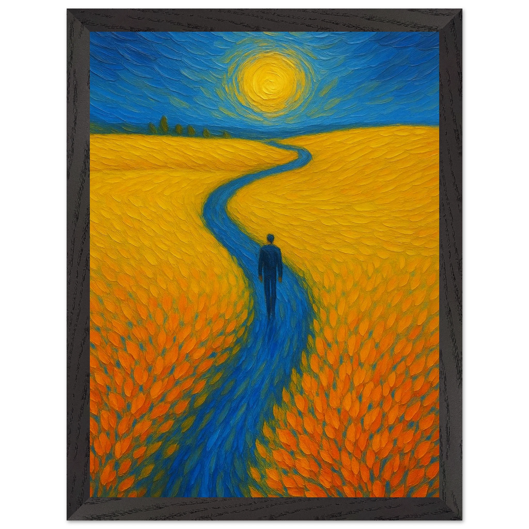 The golden fields stretch like memory, the road like time—curving, relentless, and lit by an eternal return.